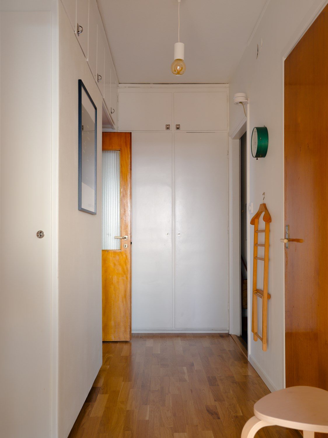 Hallen är tvådelad, och består av en tambur och en inre hall. I tamburen finns hatthylla och väggskåp under taket. På golvet ligger mörk klinker. Lägenheten har säkerhetsdörr. Därefter följer en inre hall med exceptionellt många originalgarderober och -skåp; fem höga skåp, varav ett är ett städskåp samt överskåp. Vissa skåp är inredda med hyllor, ett med stång och ett med klädhängare. På golvet ligger parkett.