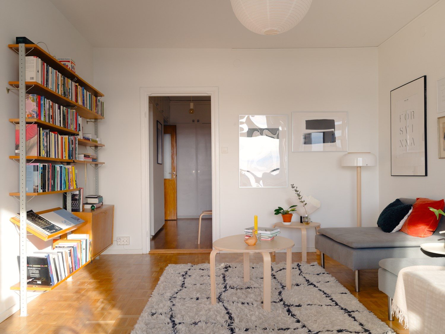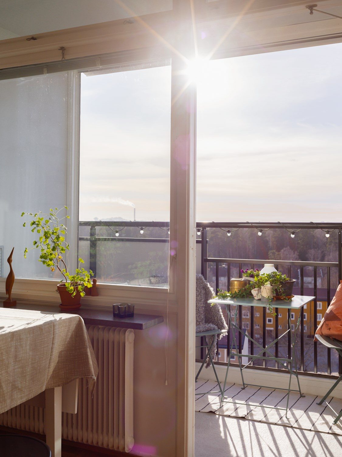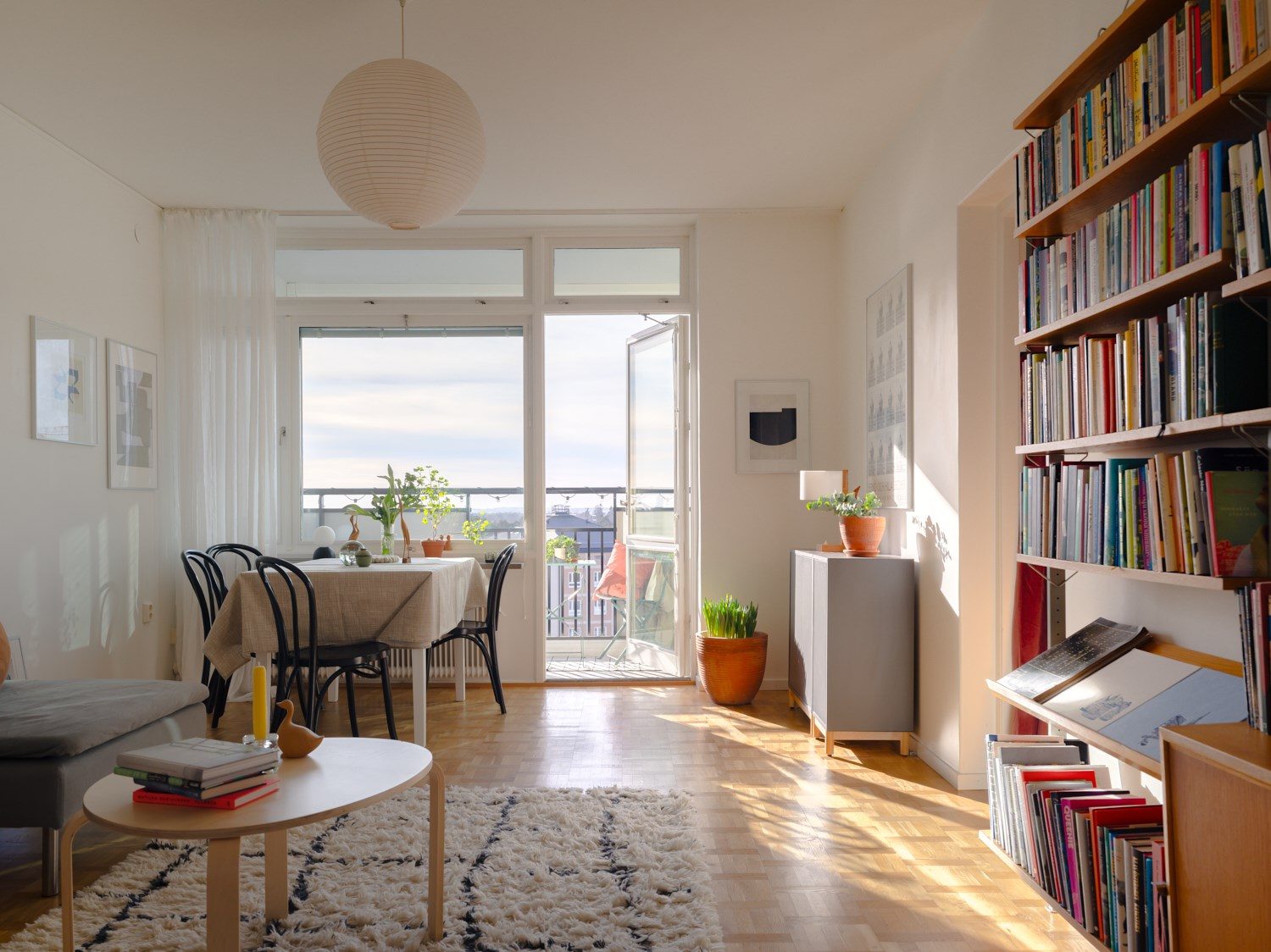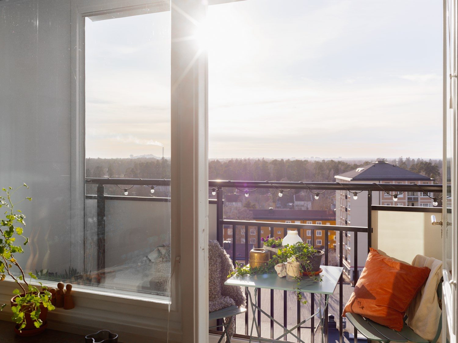 Vardagsrummet är ett rymligt sällskapsrum med ett fönsterparti som upptar större delen av ytterväggen och låter ljuset strömma in i rummet. Här kan halva rummet möbleras med soffgrupp och den andra med större matbord. På golvet ligger en originalparkett i holländskt förband. Balkongen är nyligen renoverad och glasades då också in. Här har man plats för både sittmöbler och odlingar i soligt läge, och med fantastisk utsikt förstås! Hela glaspartiet går att fälla undan, vilket är härligt på sommaren, medan man de årstider det behövs kan stänga till och värma upp rummet med extra värmare.
