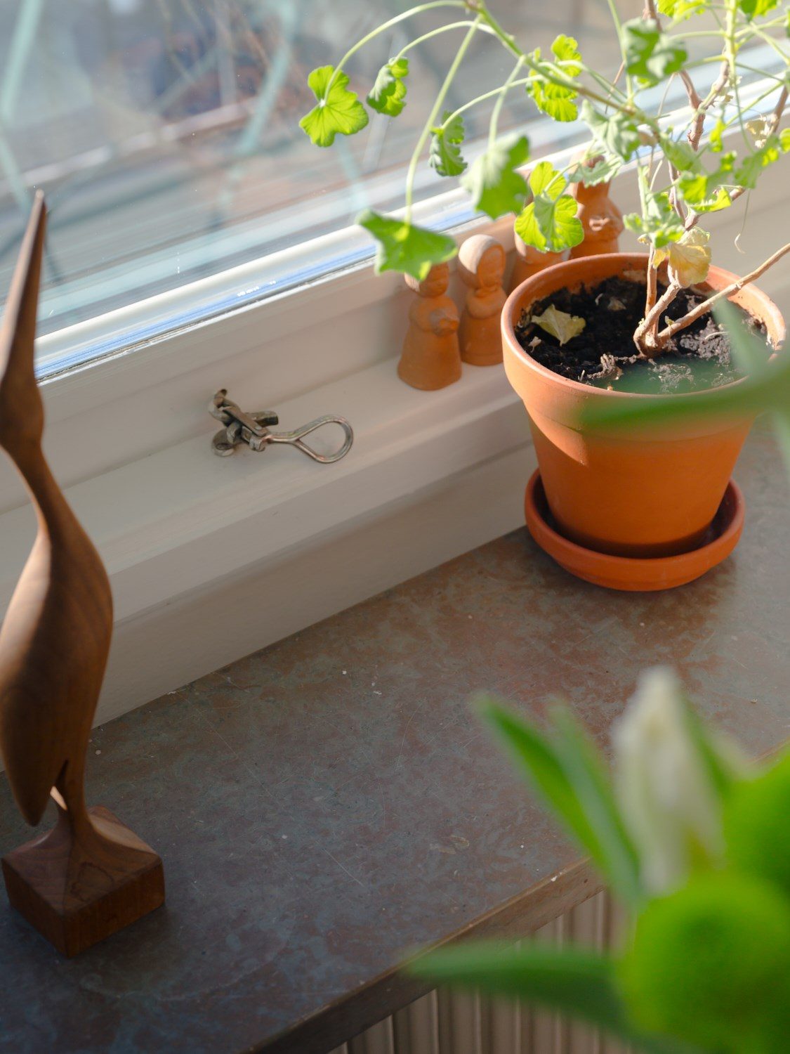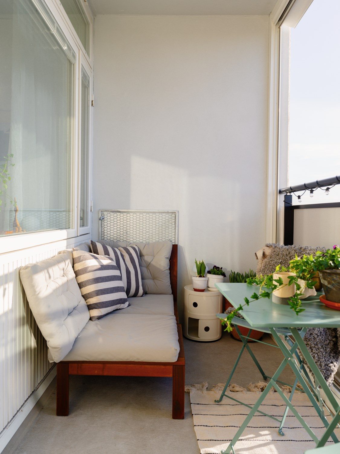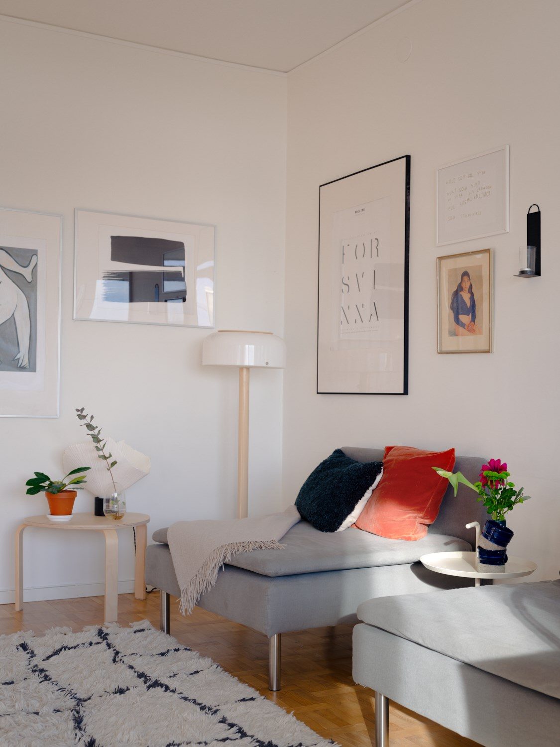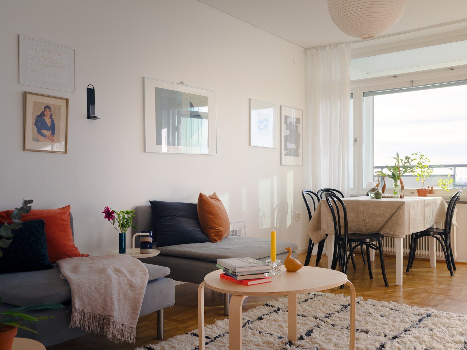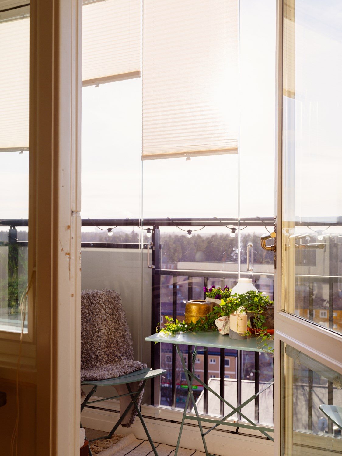 Vardagsrummet är ett rymligt sällskapsrum med ett fönsterparti som upptar större delen av ytterväggen och låter ljuset strömma in i rummet. Här kan halva rummet möbleras med soffgrupp och den andra med större matbord. På golvet ligger en originalparkett i holländskt förband. Balkongen är nyligen renoverad och glasades då också in. Här har man plats för både sittmöbler och odlingar i soligt läge, och med fantastisk utsikt förstås! Hela glaspartiet går att fälla undan, vilket är härligt på sommaren, medan man de årstider det behövs kan stänga till och värma upp rummet med extra värmare.