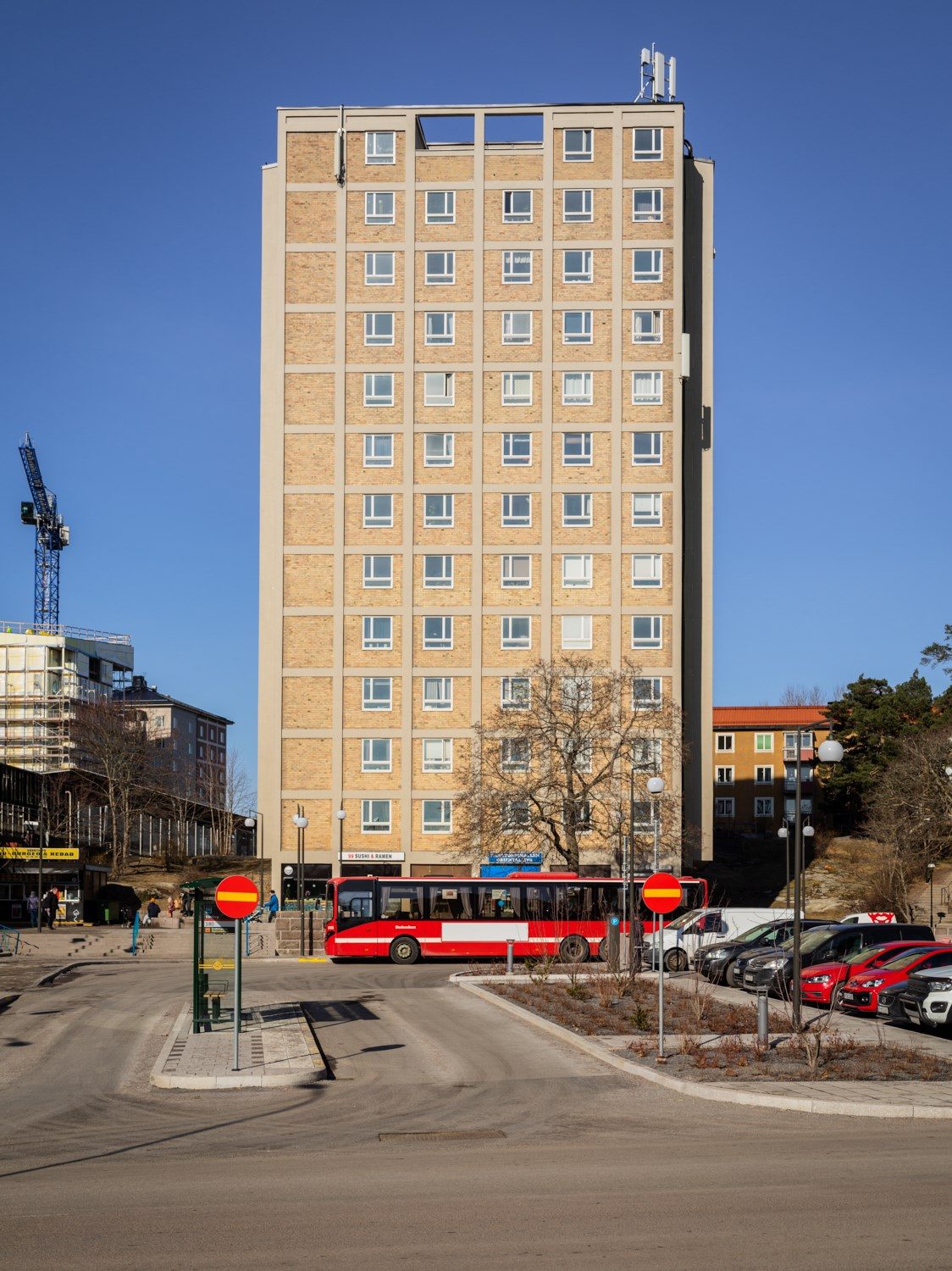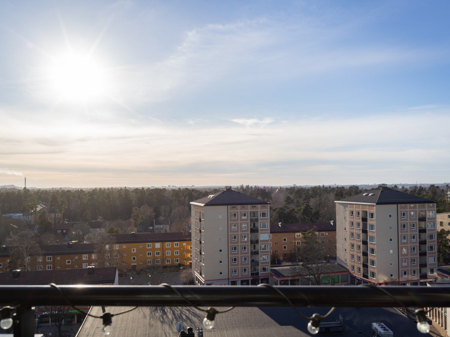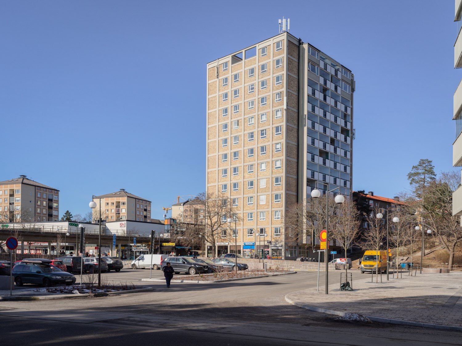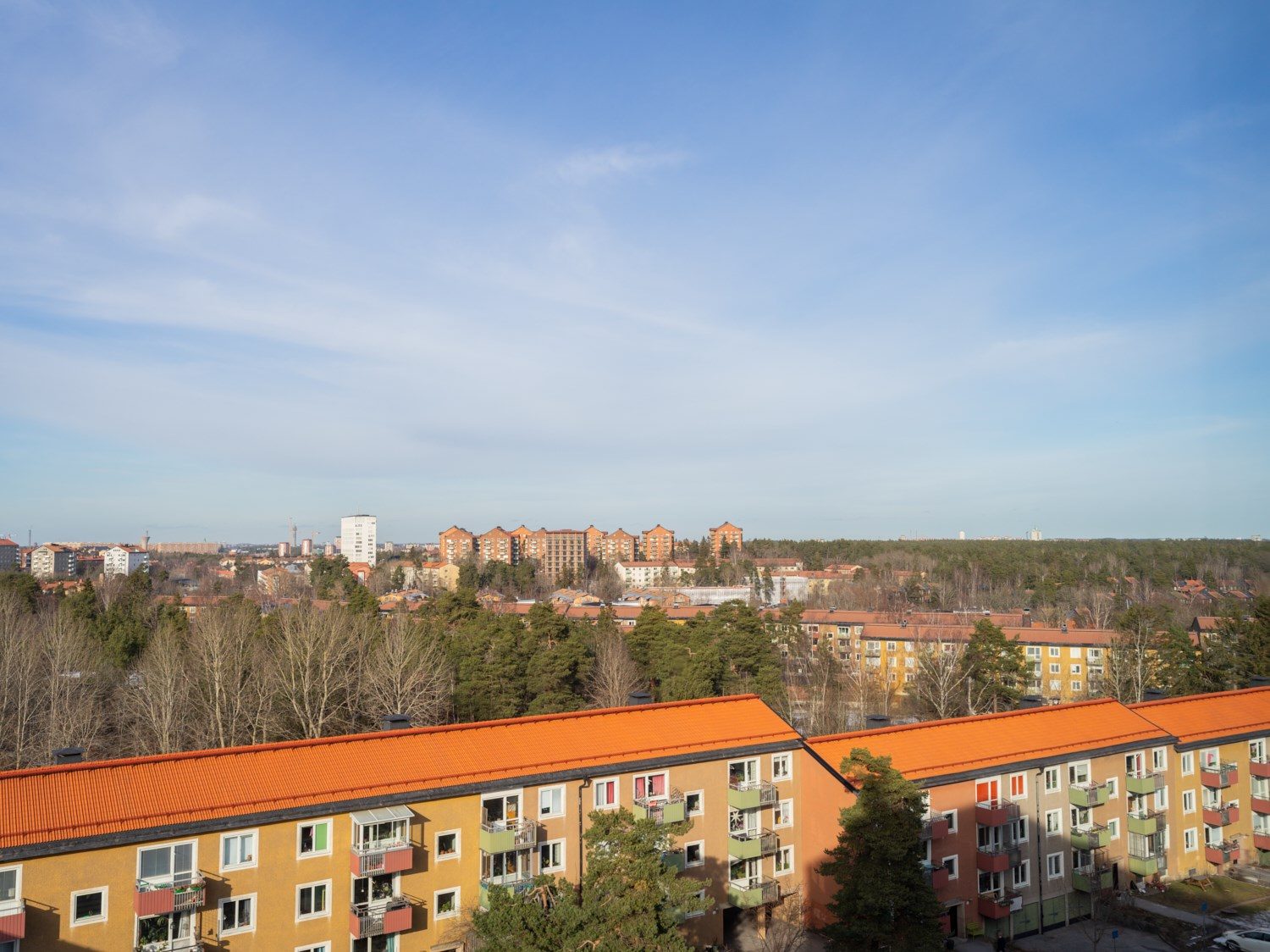 Välkommen upp till tionde våningen för att beskåda en fantastisk utsikt över stan och en mycket fin och välplanerad trerummare med balkong! Här bor du med ett högt och fritt hörnläge med imponerande, milsvida vyer mot norr och väster. Lägenheten, som ligger i ett hus från tidigt 1950-tal, bjuder på lika delar charmiga originaldetaljer som moderna uppdateringar, och är en yteffektiv och funktionell bostad för ett par eller en familj. Planlösningen är mycket genomtänkt och fördelas på ett stilrent och nyrenoverat kök, ett rymligt vardagsrum och två bra sovrum. Därtill har man en hall med massor av förvaring, ett badrum med egen tvättmaskin och torktumlare samt en stor och inglasad balkong. Tack vare ljuset, rymden och läget bor man med en väldigt fri känsla. Med Kärrtorps fina 1950-talscentrum precis utanför porten är det som att bo mitt i en charmig småstad, med butiker, deli, café, restauranger, bio och teater alldeles nära, dessutom med bästa pendlingsläge med tunnelbanan en halv minut hemifrån.