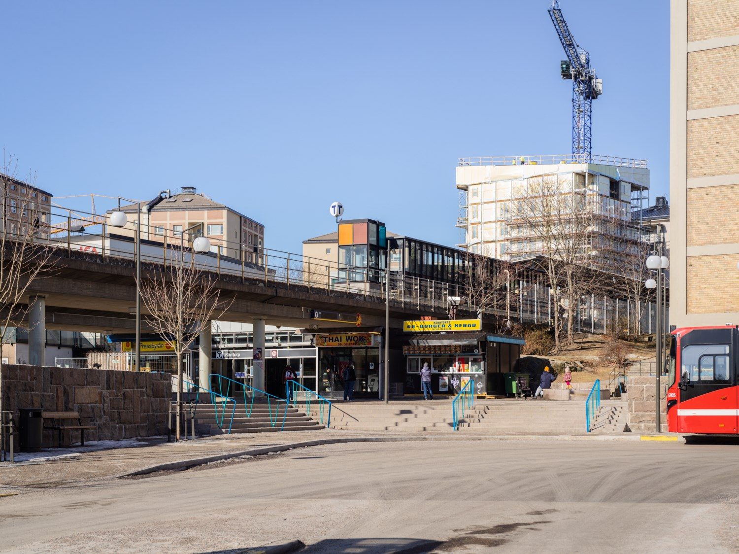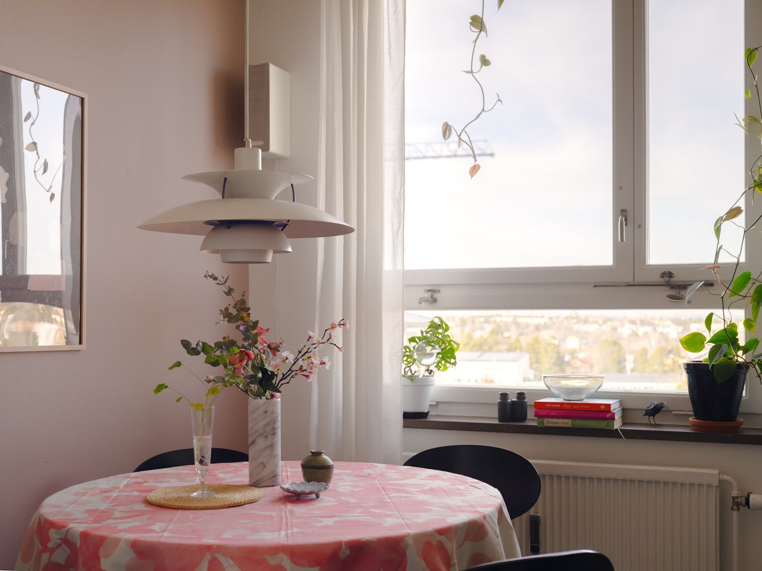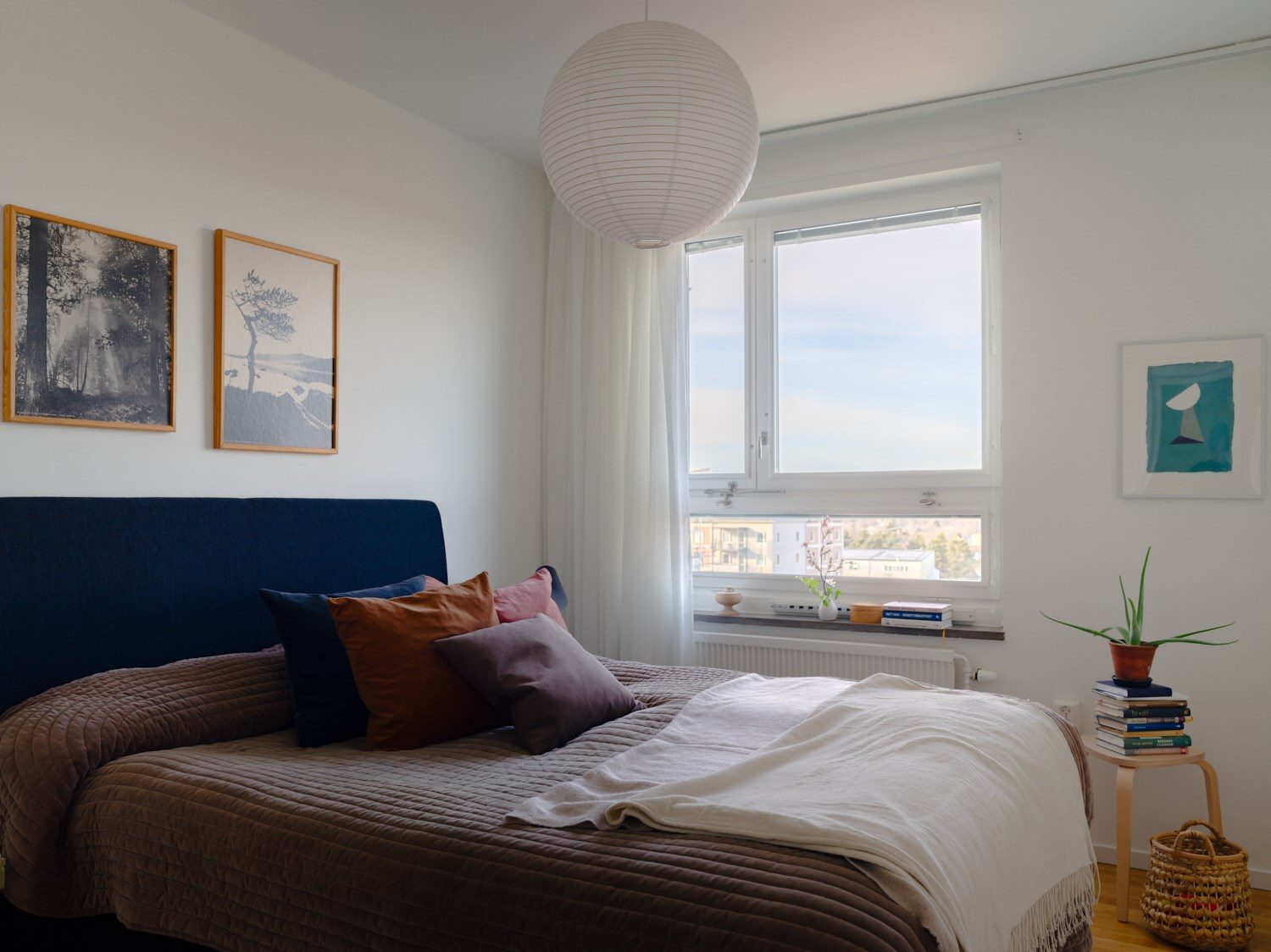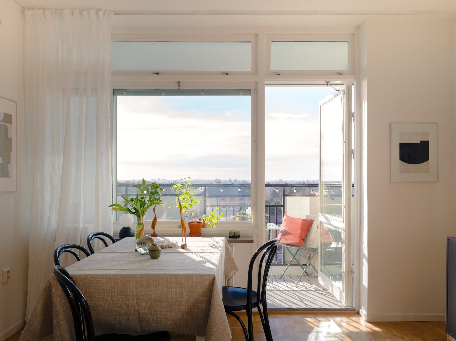 Välkommen upp till tionde våningen för att beskåda en fantastisk utsikt över stan och en mycket fin och välplanerad trerummare med balkong! Här bor du med ett högt och fritt hörnläge med imponerande, milsvida vyer mot norr och väster. Lägenheten, som ligger i ett hus från tidigt 1950-tal, bjuder på lika delar charmiga originaldetaljer som moderna uppdateringar, och är en yteffektiv och funktionell bostad för ett par eller en familj. Planlösningen är mycket genomtänkt och fördelas på ett stilrent och nyrenoverat kök, ett rymligt vardagsrum och två bra sovrum. Därtill har man en hall med massor av förvaring, ett badrum med egen tvättmaskin och torktumlare samt en stor och inglasad balkong. Tack vare ljuset, rymden och läget bor man med en väldigt fri känsla. Med Kärrtorps fina 1950-talscentrum precis utanför porten är det som att bo mitt i en charmig småstad, med butiker, deli, café, restauranger, bio och teater alldeles nära, dessutom med bästa pendlingsläge med tunnelbanan en halv minut hemifrån.
