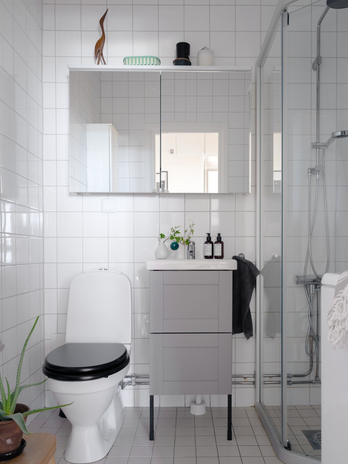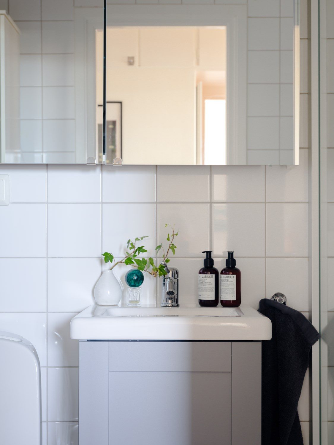 I badrummet finns dusch med duschväggar, handfat, wc och en kombinerad tvättmaskin och torktumlare. Dessutom bra förvaring med kommod, spegelskåp och högskåp. Väggarna är kaklade i vitt och på golvet ligger ljus klinker. Badrummet renoverades i samband med stambyte i föreningen 2008/09 men uppdaterades med duschväggar och tm/tt 2018 samt handfat och takdusch 2021.