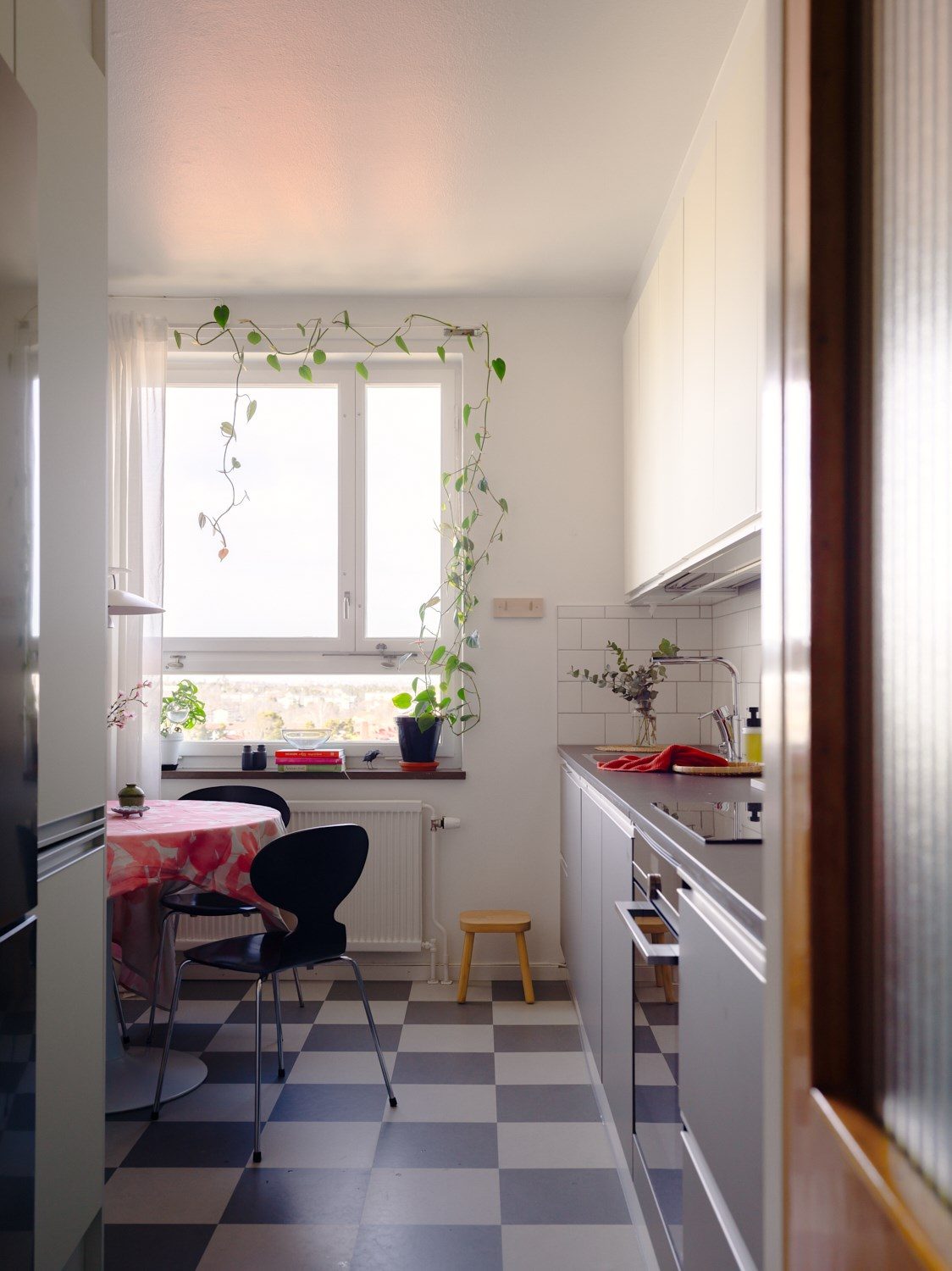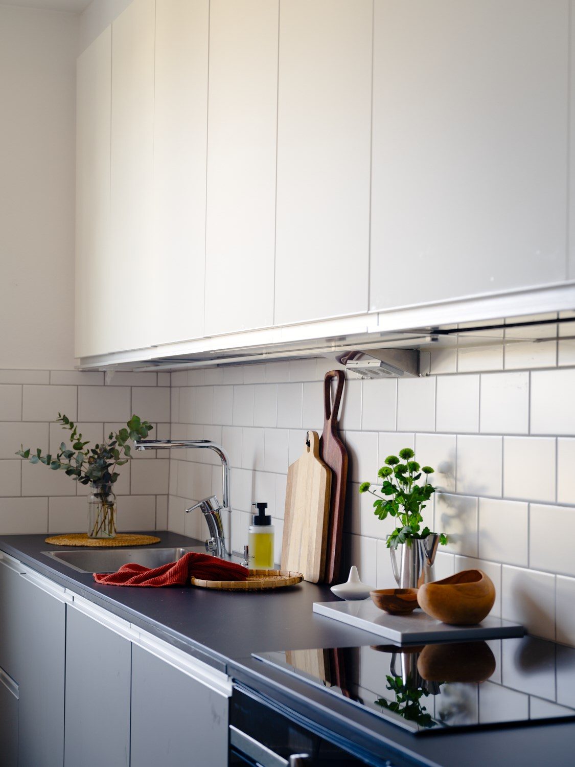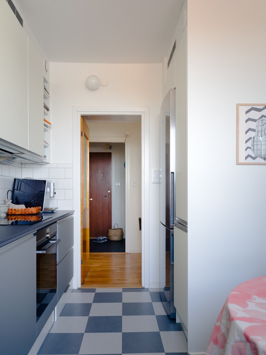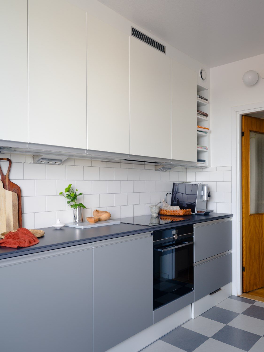 Rakt fram från entrén kommer man in i köket. Det helrenoverades 2019 med påkostad inredning från finska Puustelli, med släta och stilrena skåp i grått och vitt, tunn bänkskiva i svart keramik och vitvaror från Siemens; induktionshäll, kombinerad och wifistyrd varmlufts- och mikrovågsugn med pyrolysrengöring, integrerad diskmaskin och extra bred kyl och frys. På golvet ligger ett grå- och vitrutigt laminatgolv och väggarna är målade i vitt och gammalrosa, med vitt väggkakel vid bänkytorna. Belysningen över köksbord och fönster är också wifi-styrd via Pleijd. Men att äta frukost med utsikt över hela Stockholm är ändå det allra bästa!