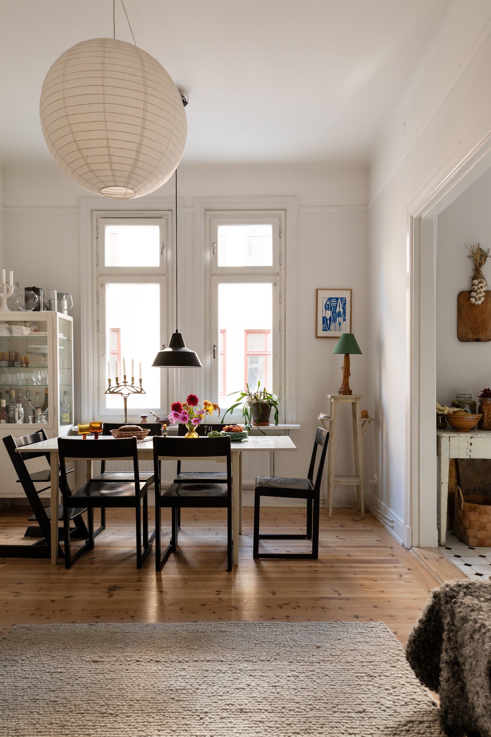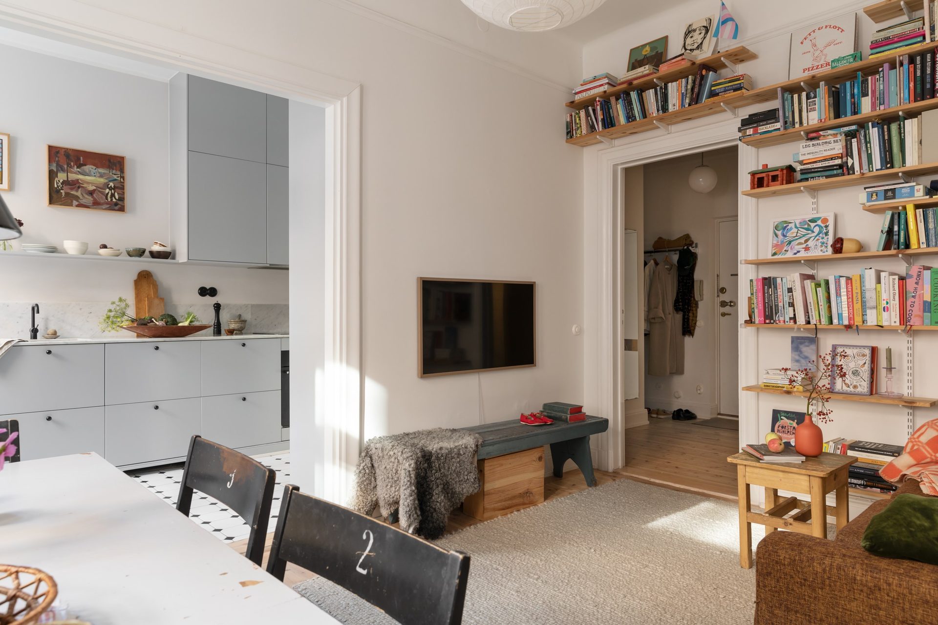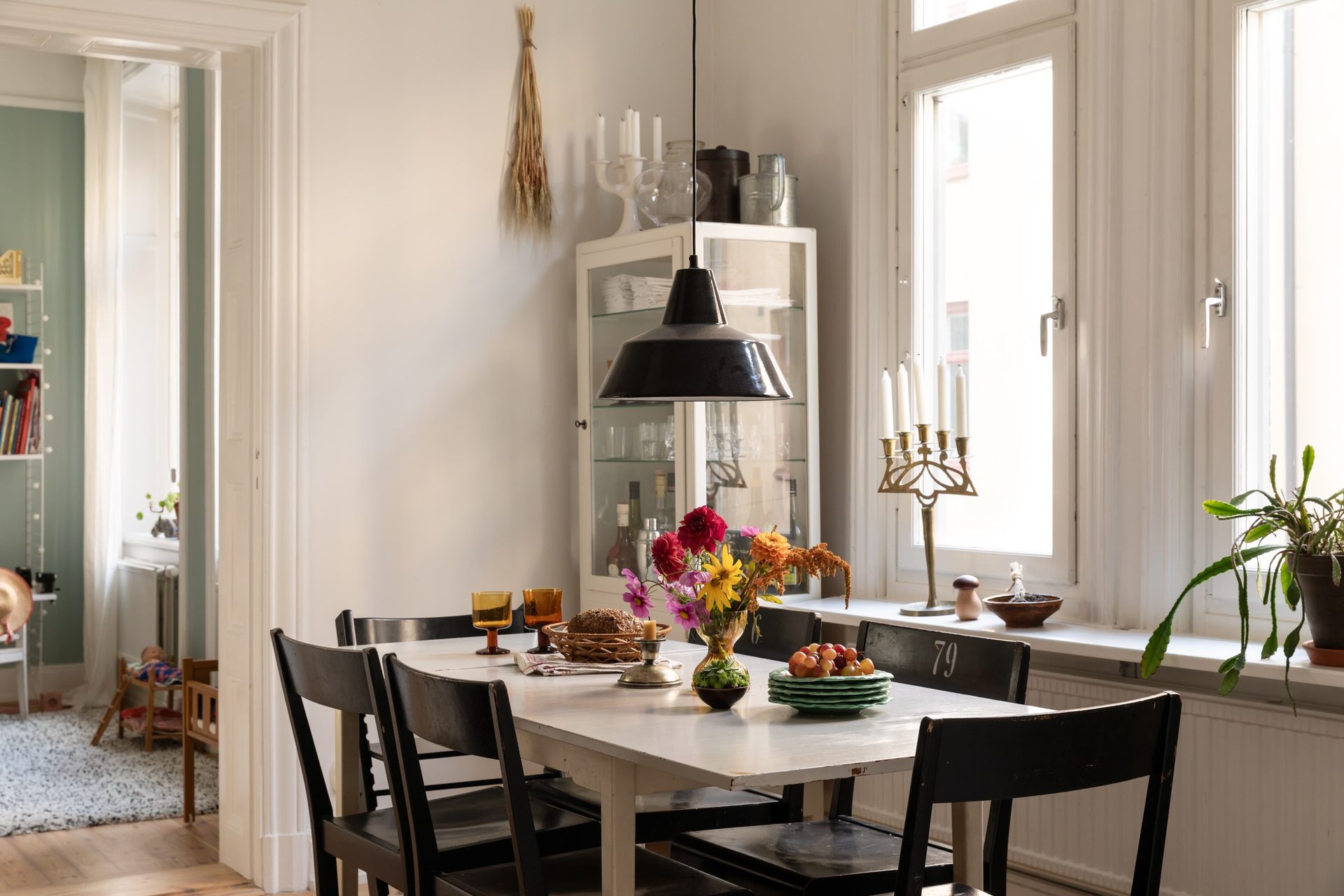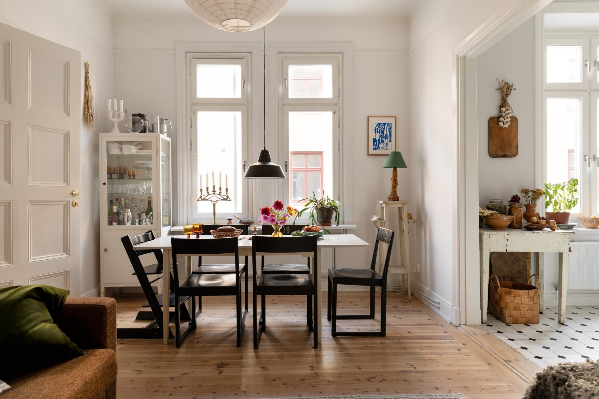 En bred öppning binder samman köket med vardagsrummet. Två vackra fönster i fil släpper in rikligt med dagsljus över det bevarade furugolvet. Här finns rum för matsalsbord och en inbjudande soffgrupp i mysig atmosfär. Takhöjden bidrar med rymd.