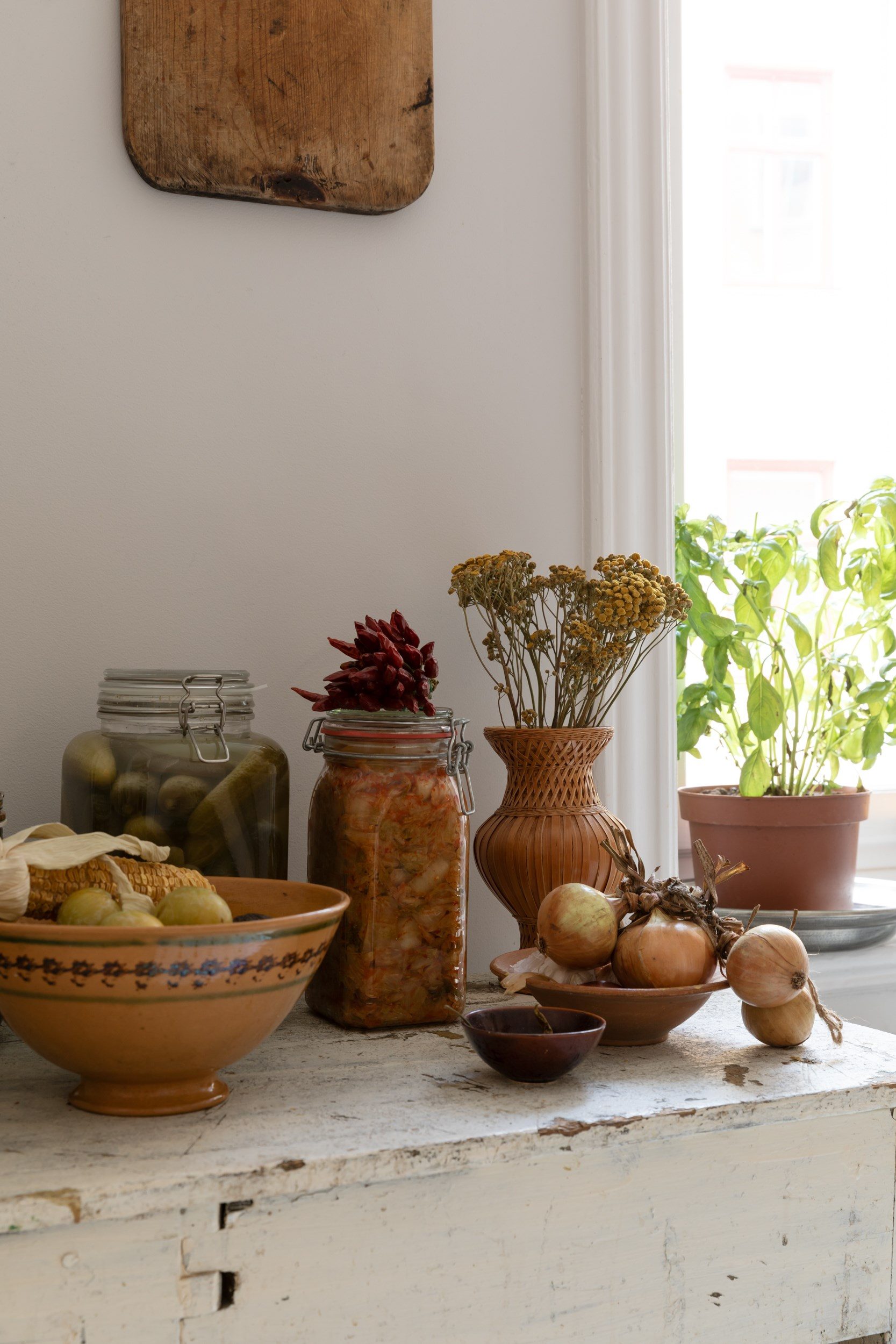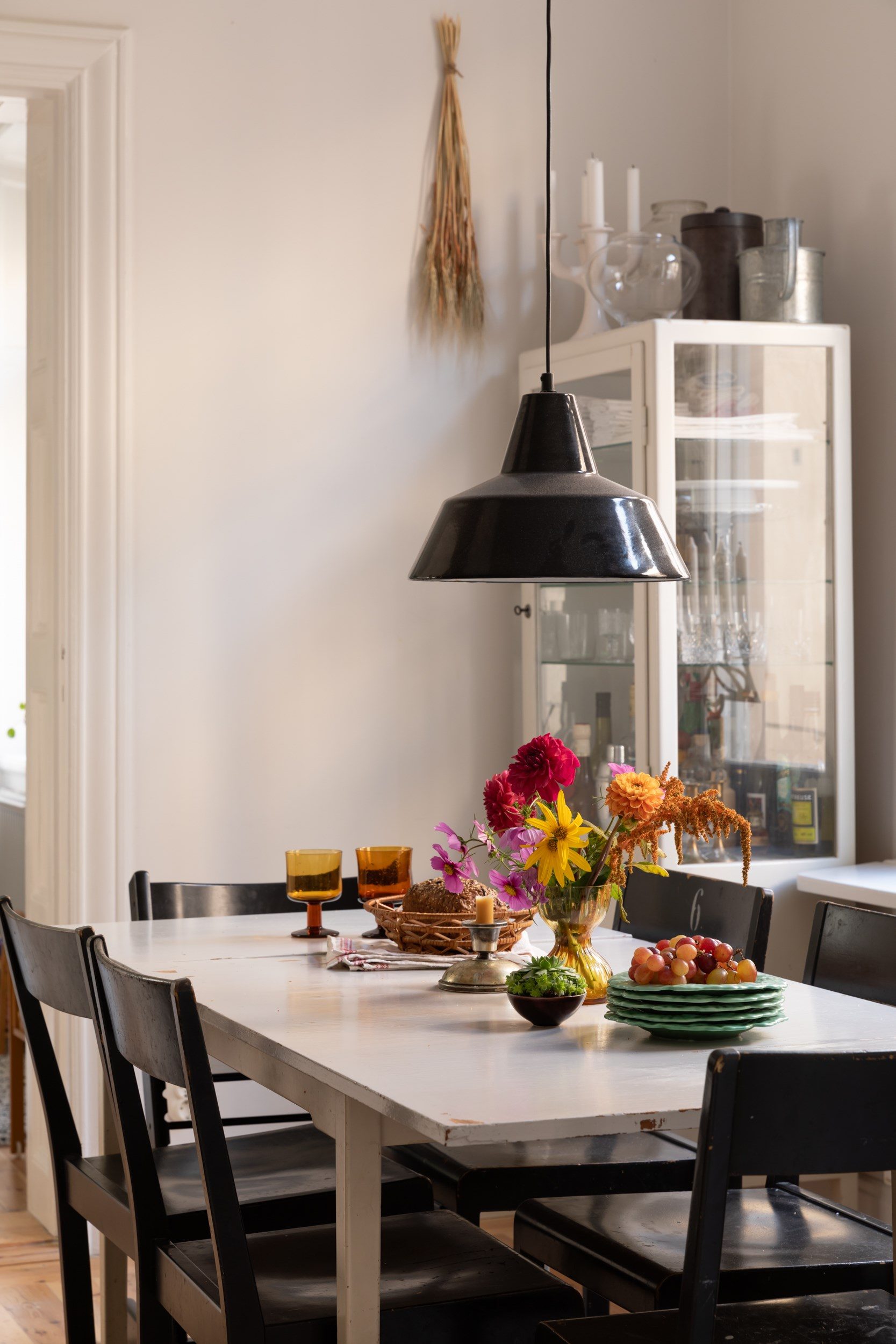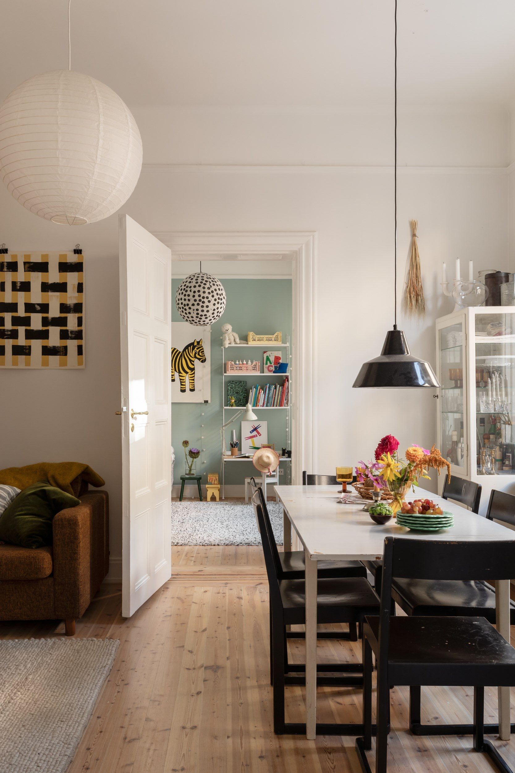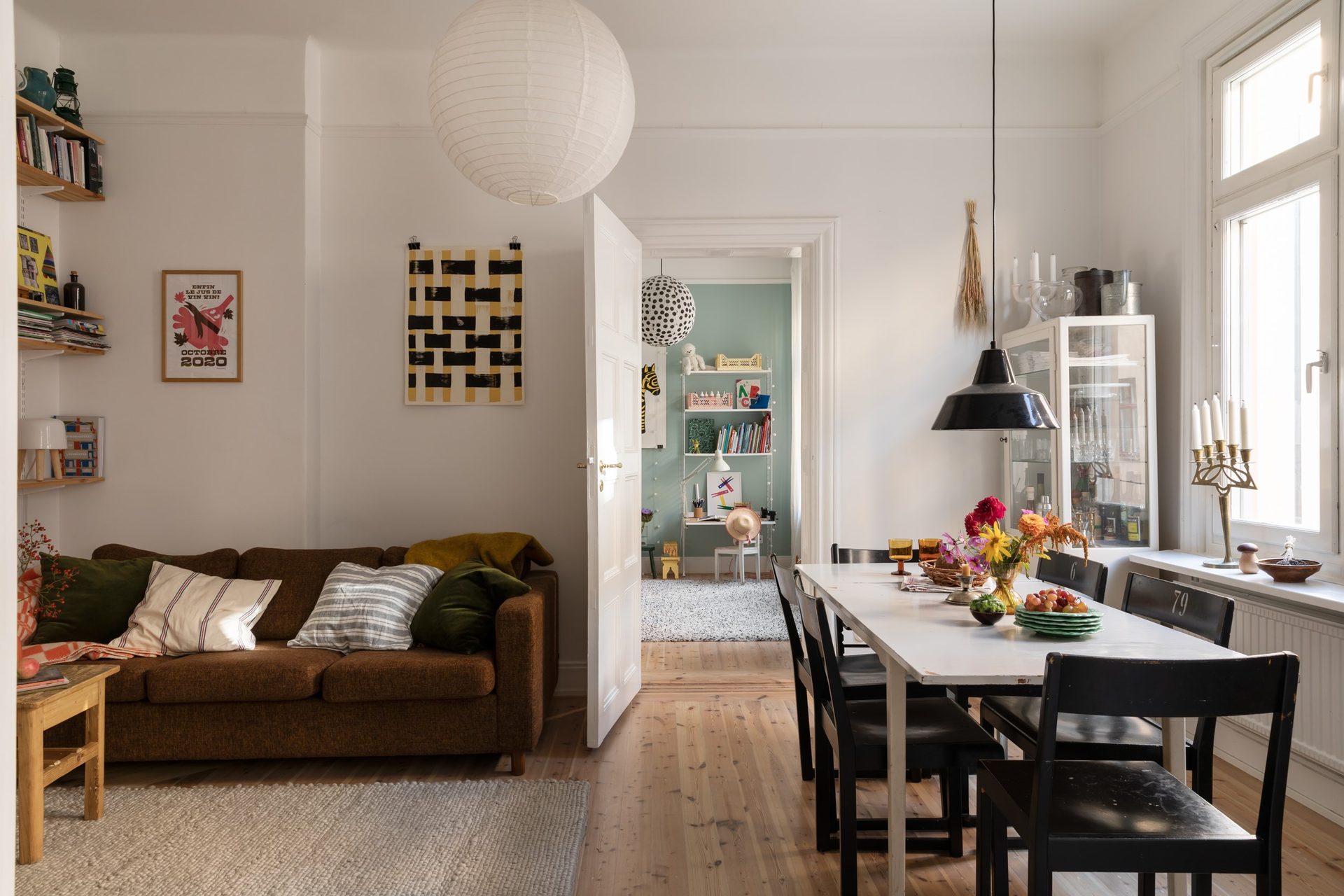 En bred öppning binder samman köket med vardagsrummet. Två vackra fönster i fil släpper in rikligt med dagsljus över det bevarade furugolvet. Här finns rum för matsalsbord och en inbjudande soffgrupp i mysig atmosfär. Takhöjden bidrar med rymd.