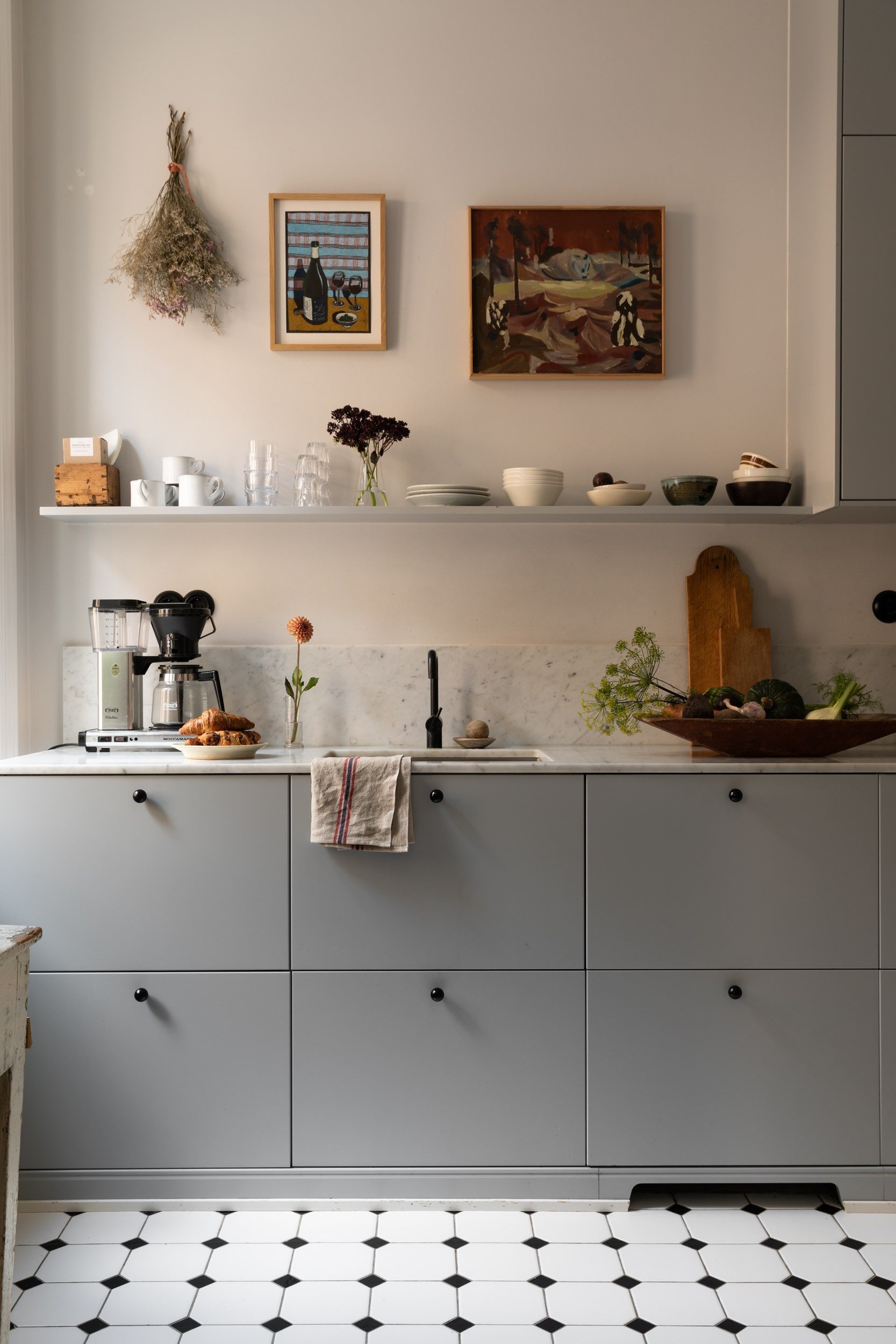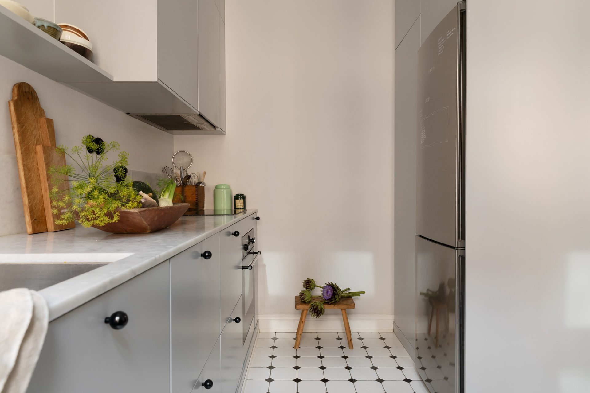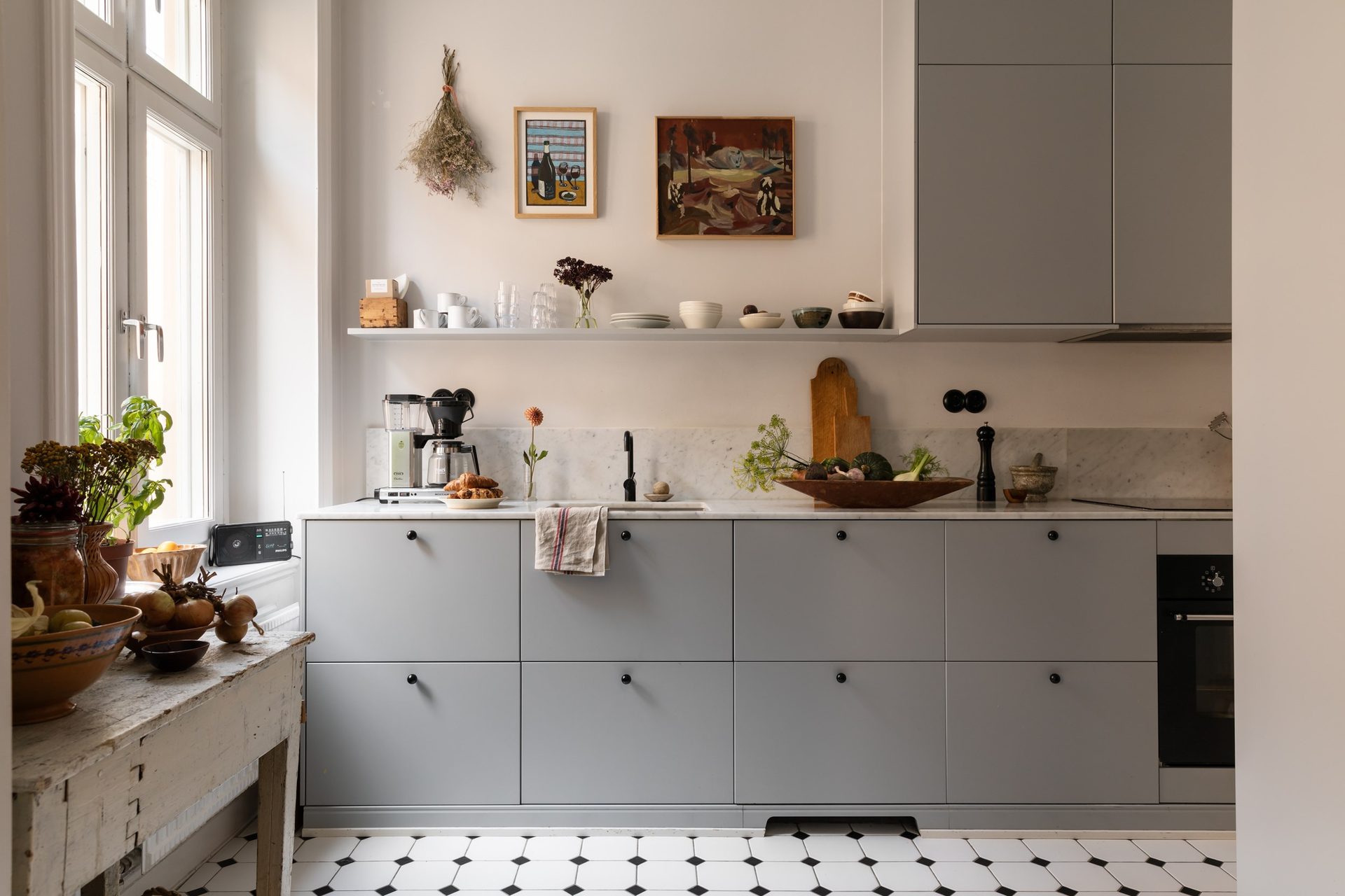Kökets interiör består av gråblå, släta luckor som passar väl ihop med bänkskivan i carraramarmor. Här väntar gott om arbetsyta, samt förvaring med skåp ända upp till taket och flertalet utdragslådor, och öppna hyllplan håller plats för favoritporslinet! Köket är utrustat med vitvaror såsom kyl/frys från 2017, en integrerad diskmaskin från 2018, en inbyggd ugn, spis med induktionshäll, kolfilterfläkt från 2018 och en mikrovågsugn från 2020. På golvet ligger vita oktagon- och svarta kvadratiska klinkers vilket ger en klassisk inramning.