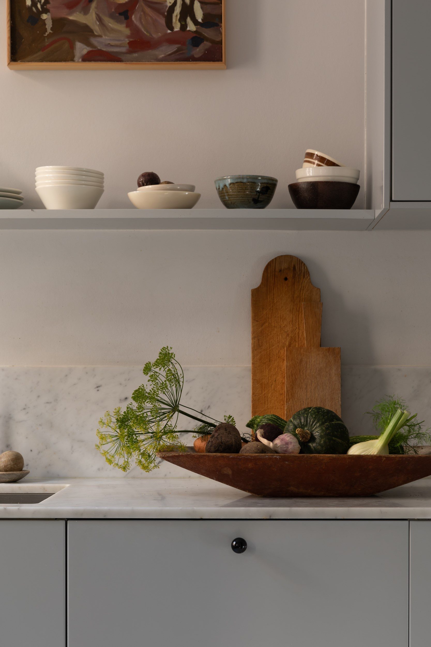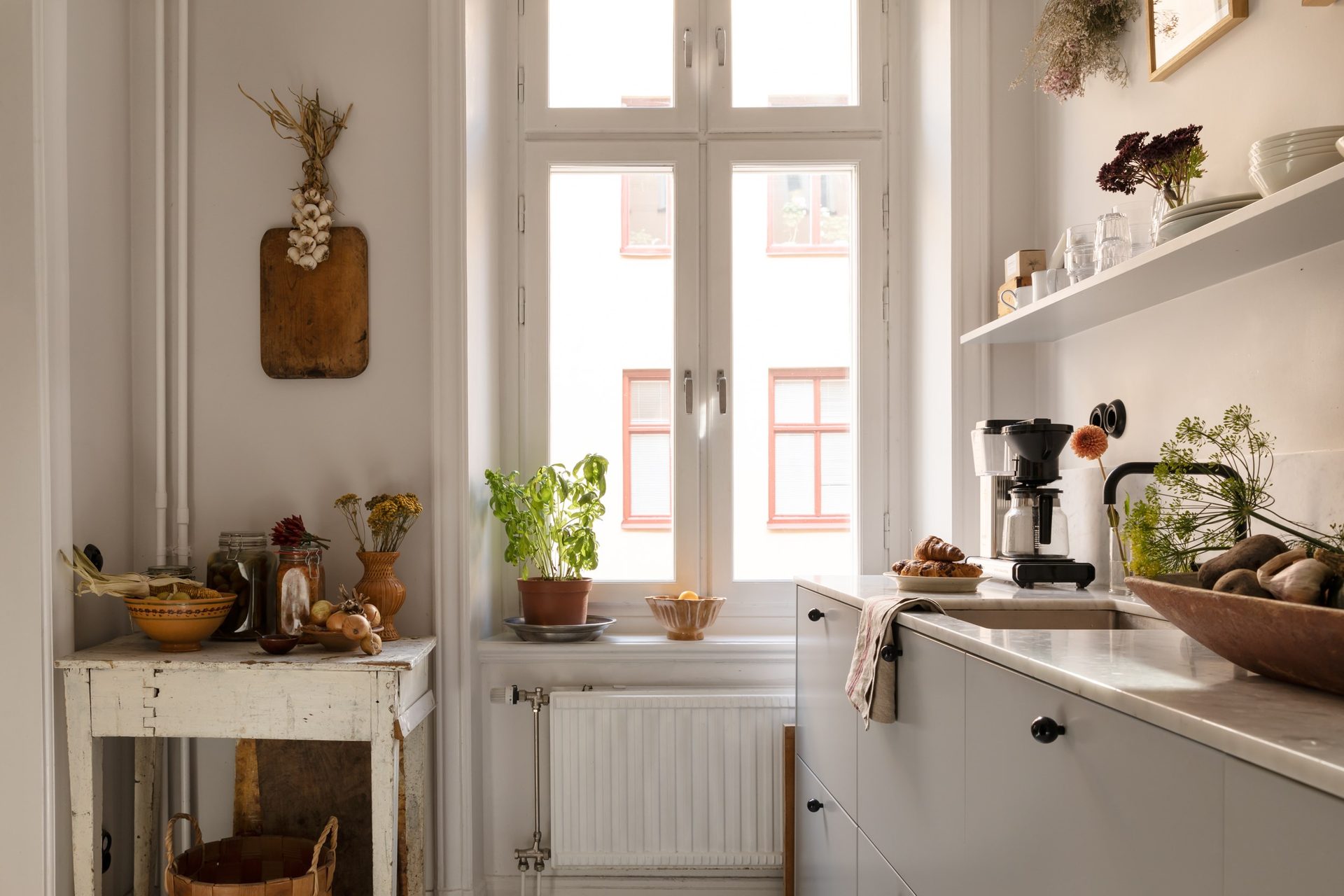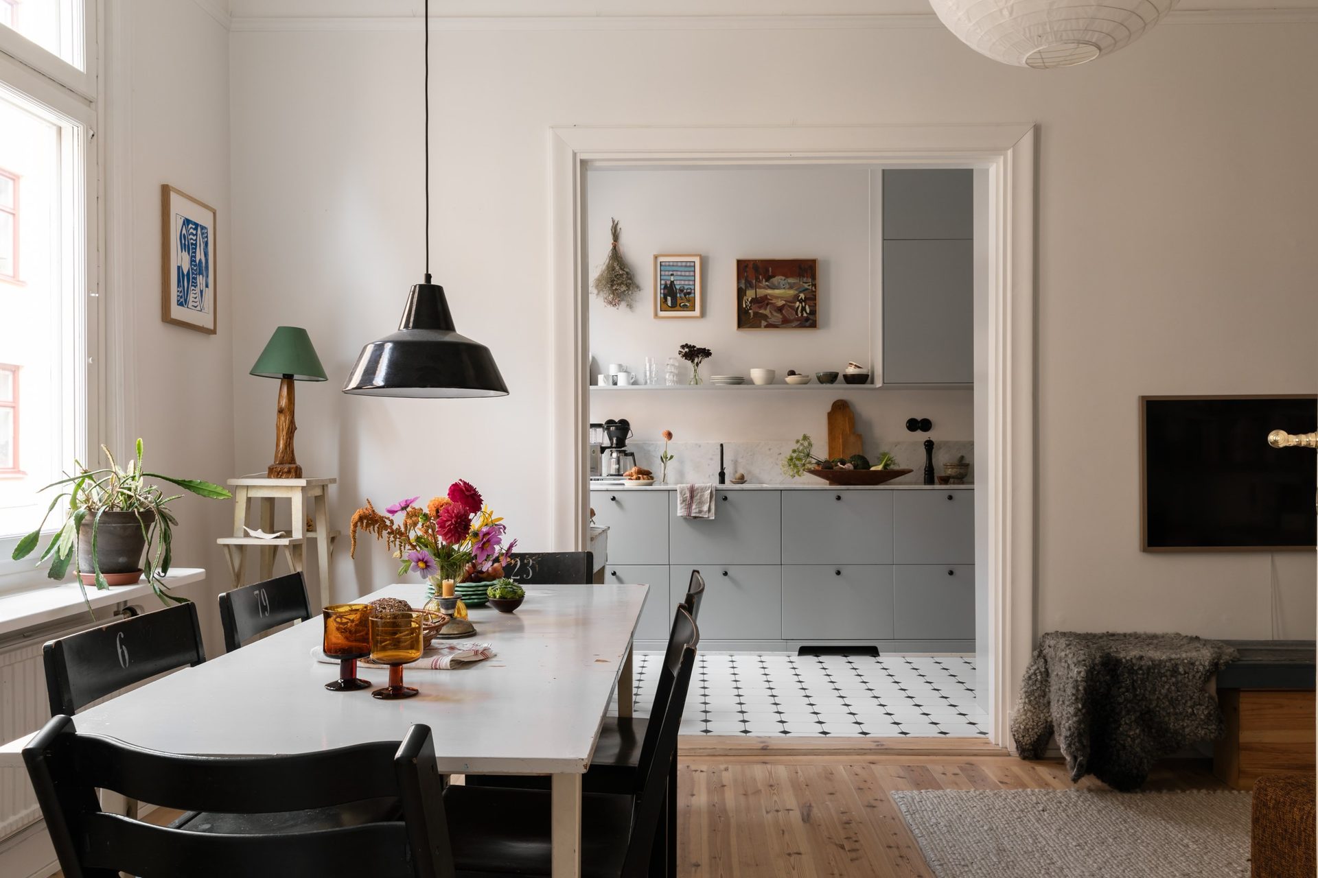 Kökets interiör består av gråblå, släta luckor som passar väl ihop med bänkskivan i carraramarmor. Här väntar gott om arbetsyta, samt förvaring med skåp ända upp till taket och flertalet utdragslådor, och öppna hyllplan håller plats för favoritporslinet! Köket är utrustat med vitvaror såsom kyl/frys från 2017, en integrerad diskmaskin från 2018, en inbyggd ugn, spis med induktionshäll, kolfilterfläkt från 2018 och en mikrovågsugn från 2020. På golvet ligger vita oktagon- och svarta kvadratiska klinkers vilket ger en klassisk inramning.