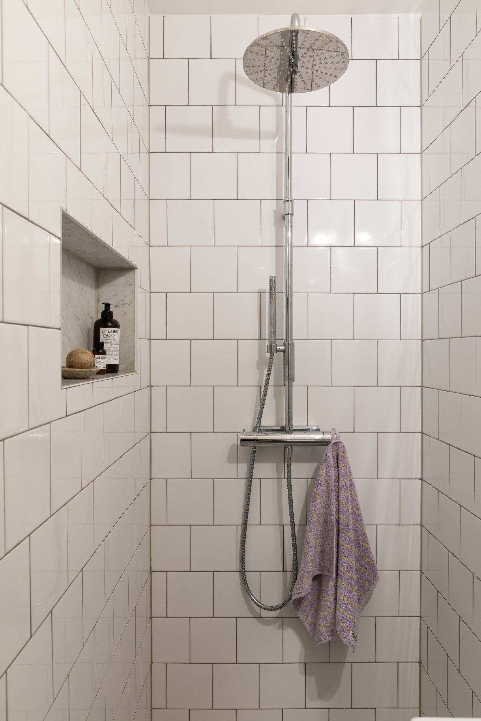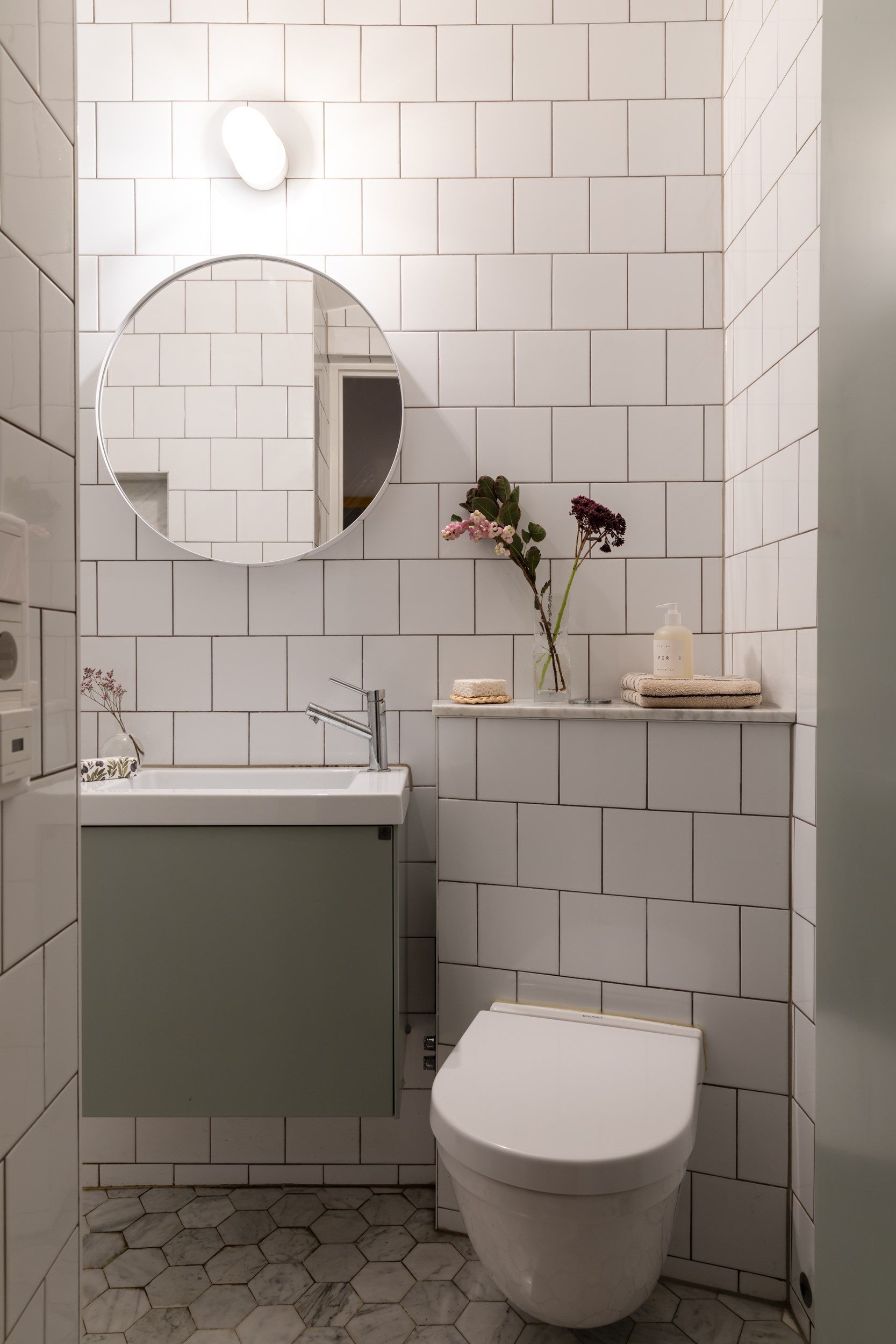Badrummet är helkaklat med vita kakelplattor och hexagonklinkers i carraramarmor med installerad golvvärme. Här finns en vägghängd WC och en rymlig dusch, och en kommod och ett högskåp från Ballingslöv erbjuder förvaring.