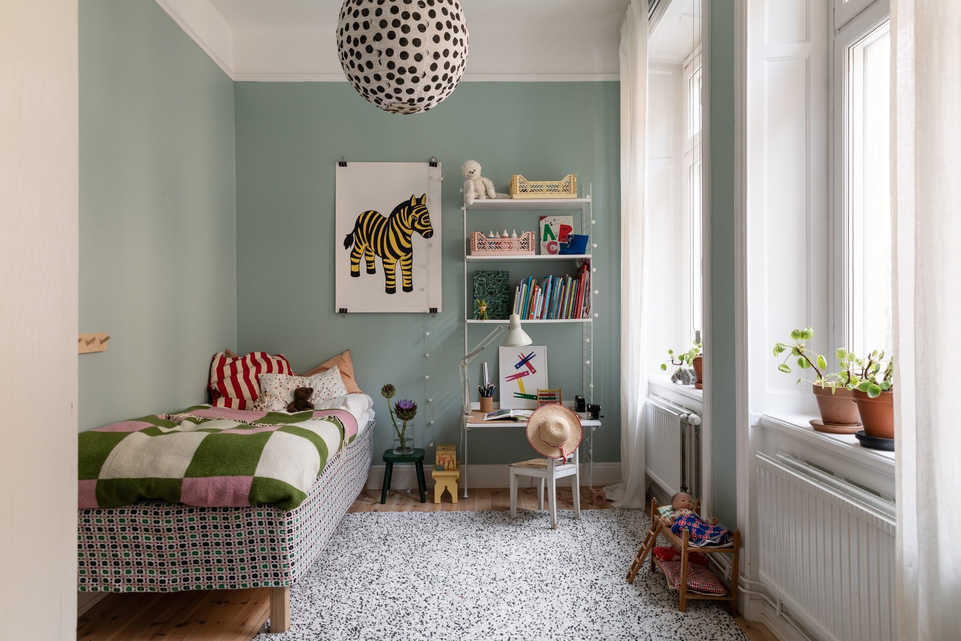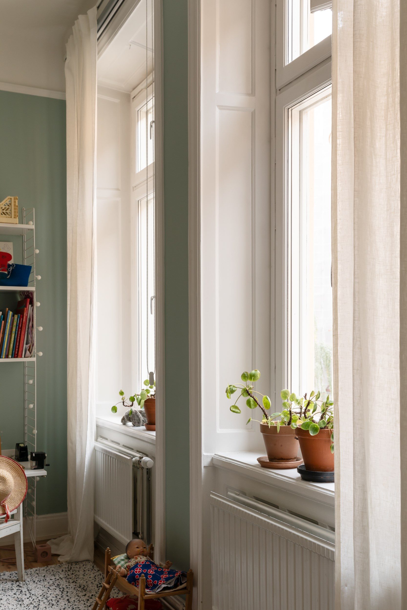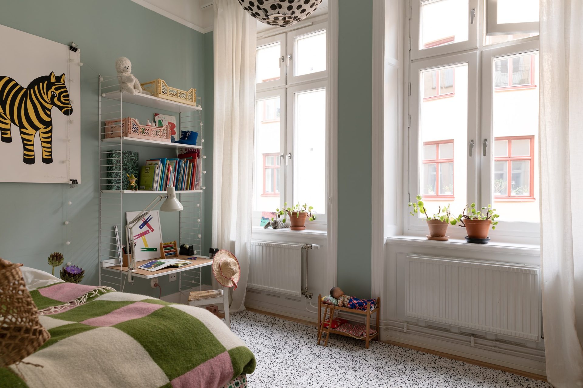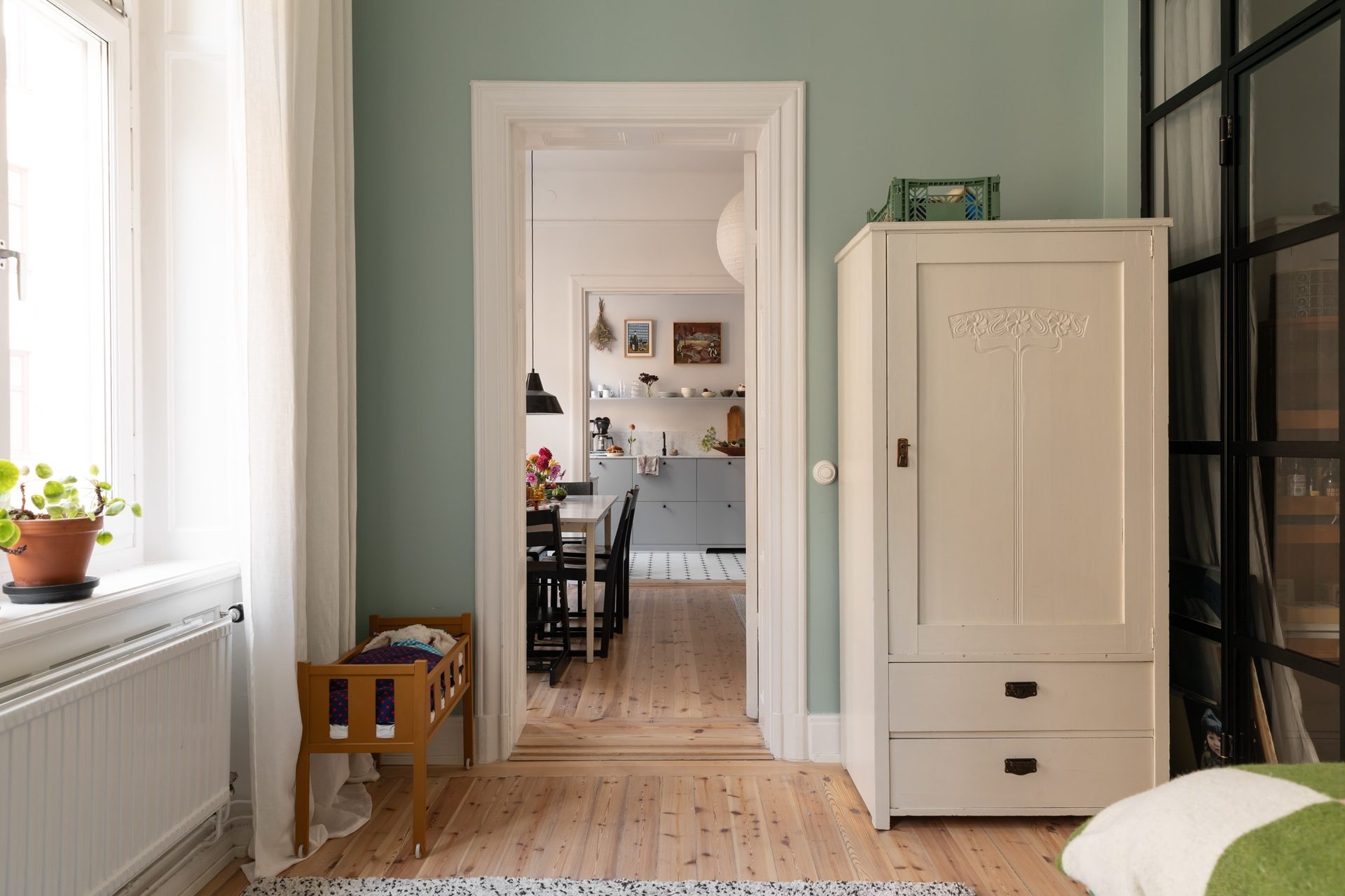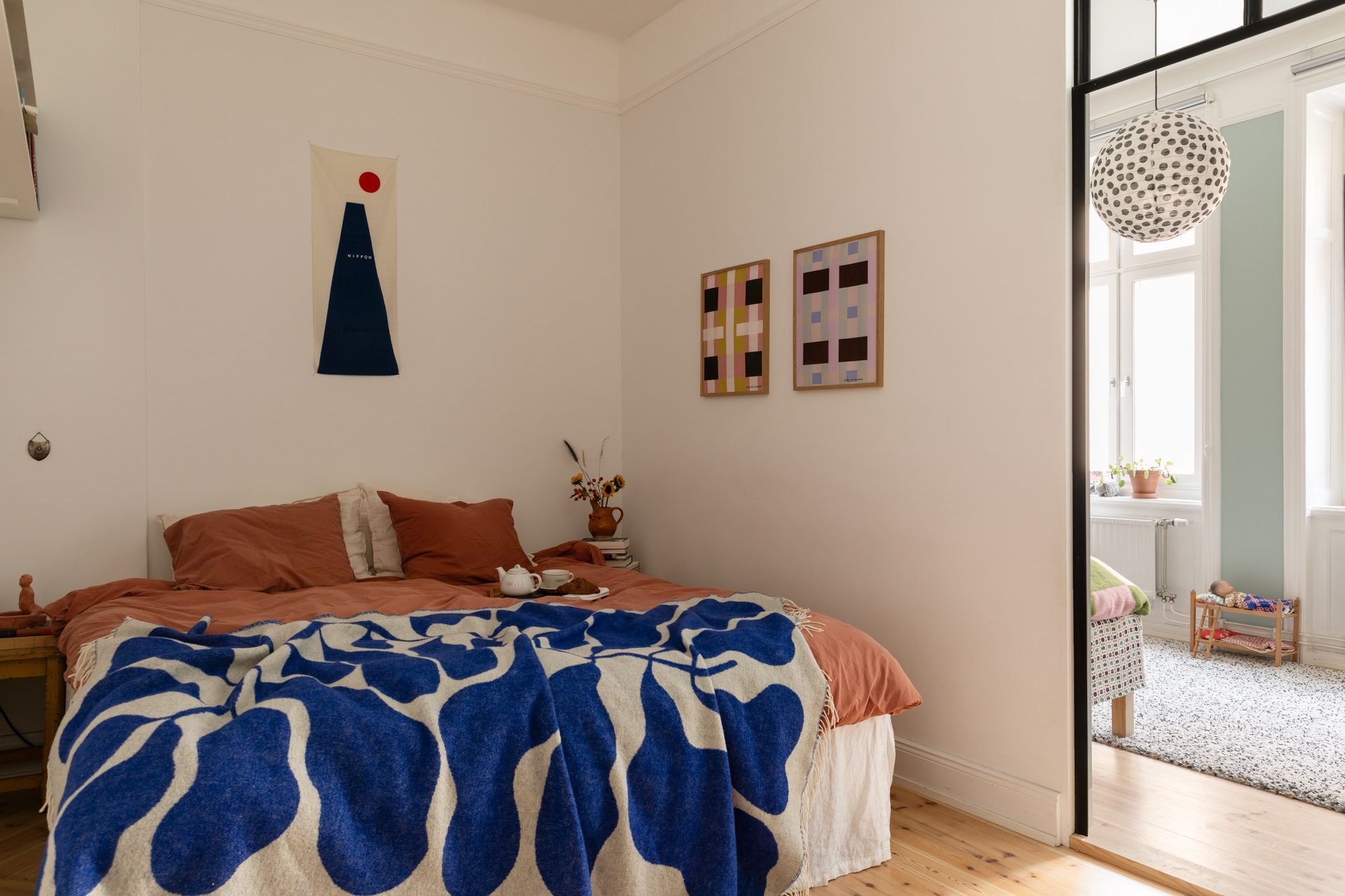 Lägenhetens sovrum nås främst via vardagsrummet, samt via en glasad dörr från sovrum 2, och nyttjas idag som barnrum. Väggarna är målade i en turkos kulör som passar väl ihop med furugolvet. Två stora fönster i fil släpper in fantastiskt ljus.