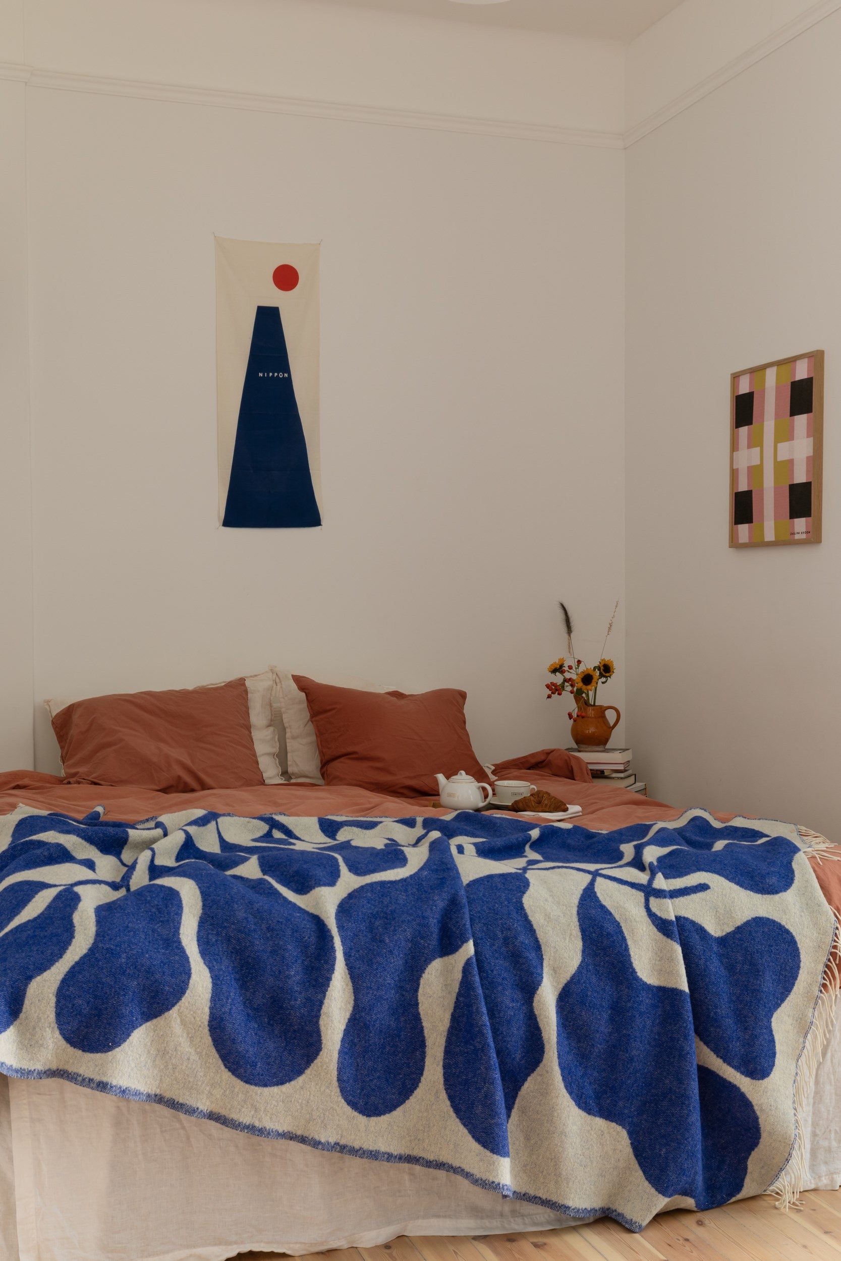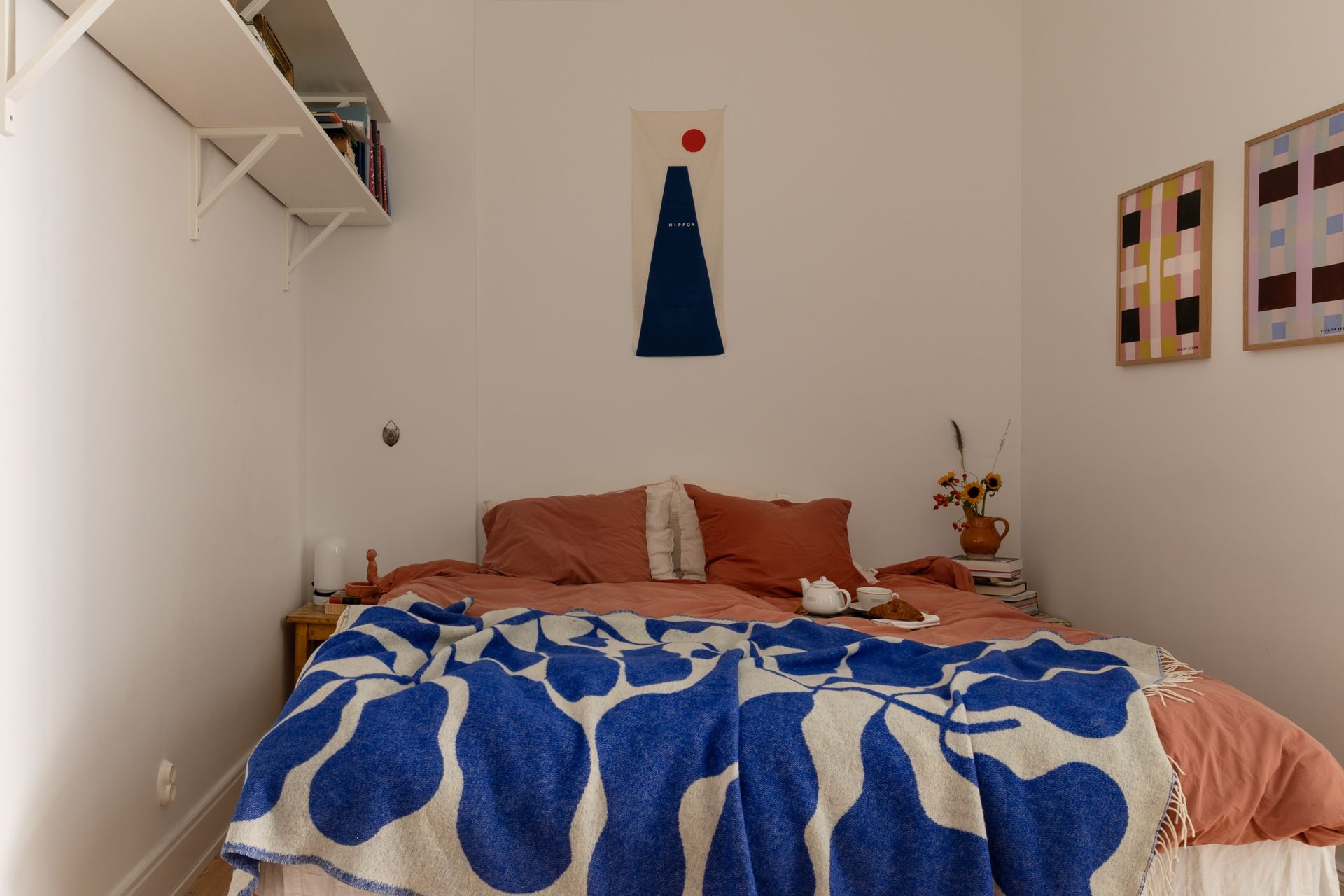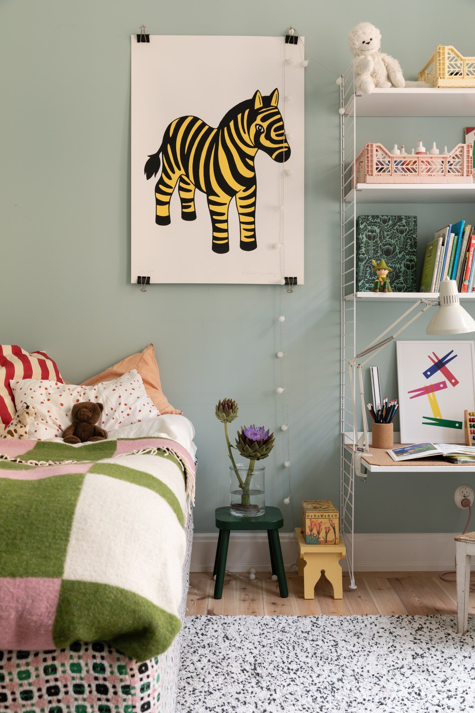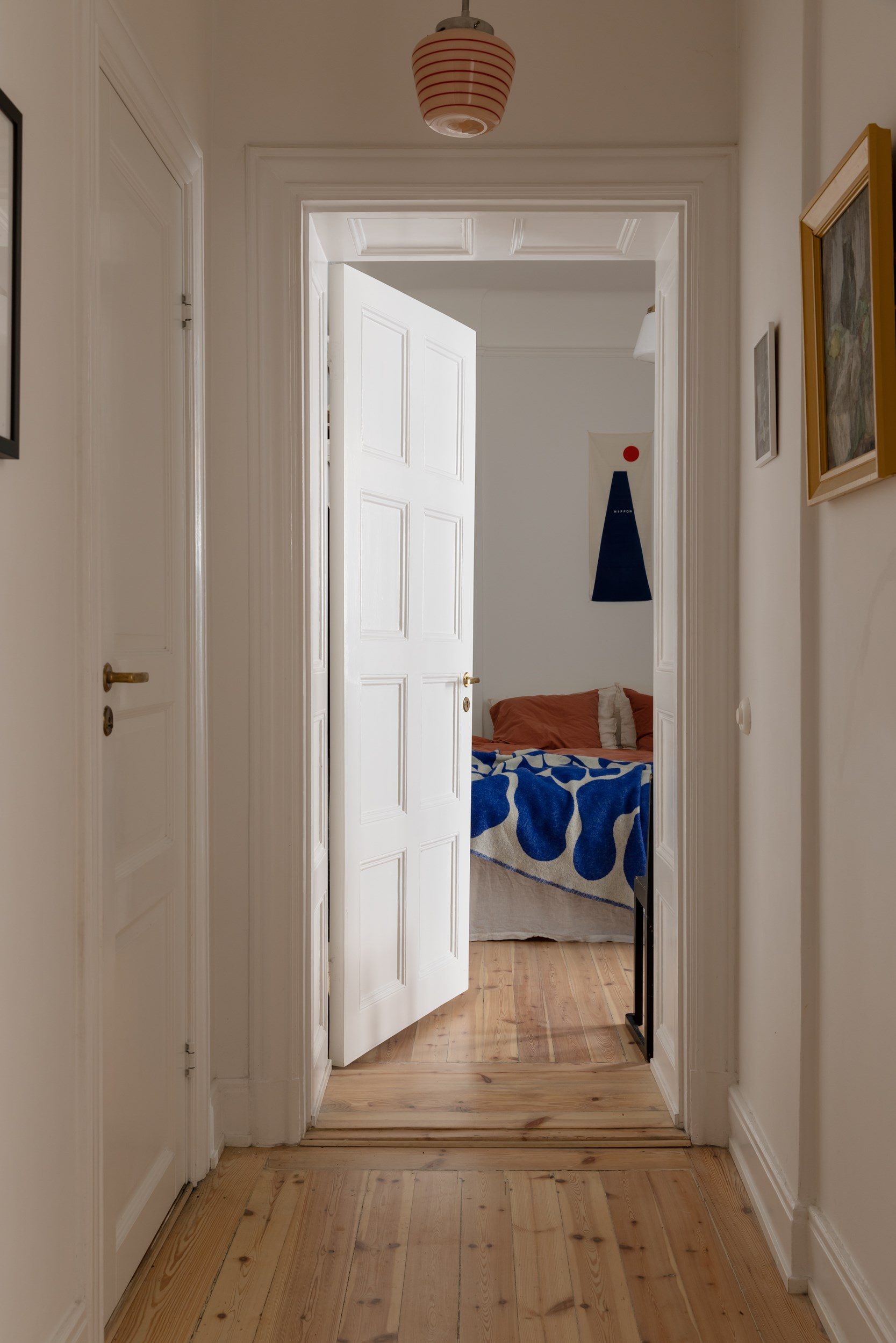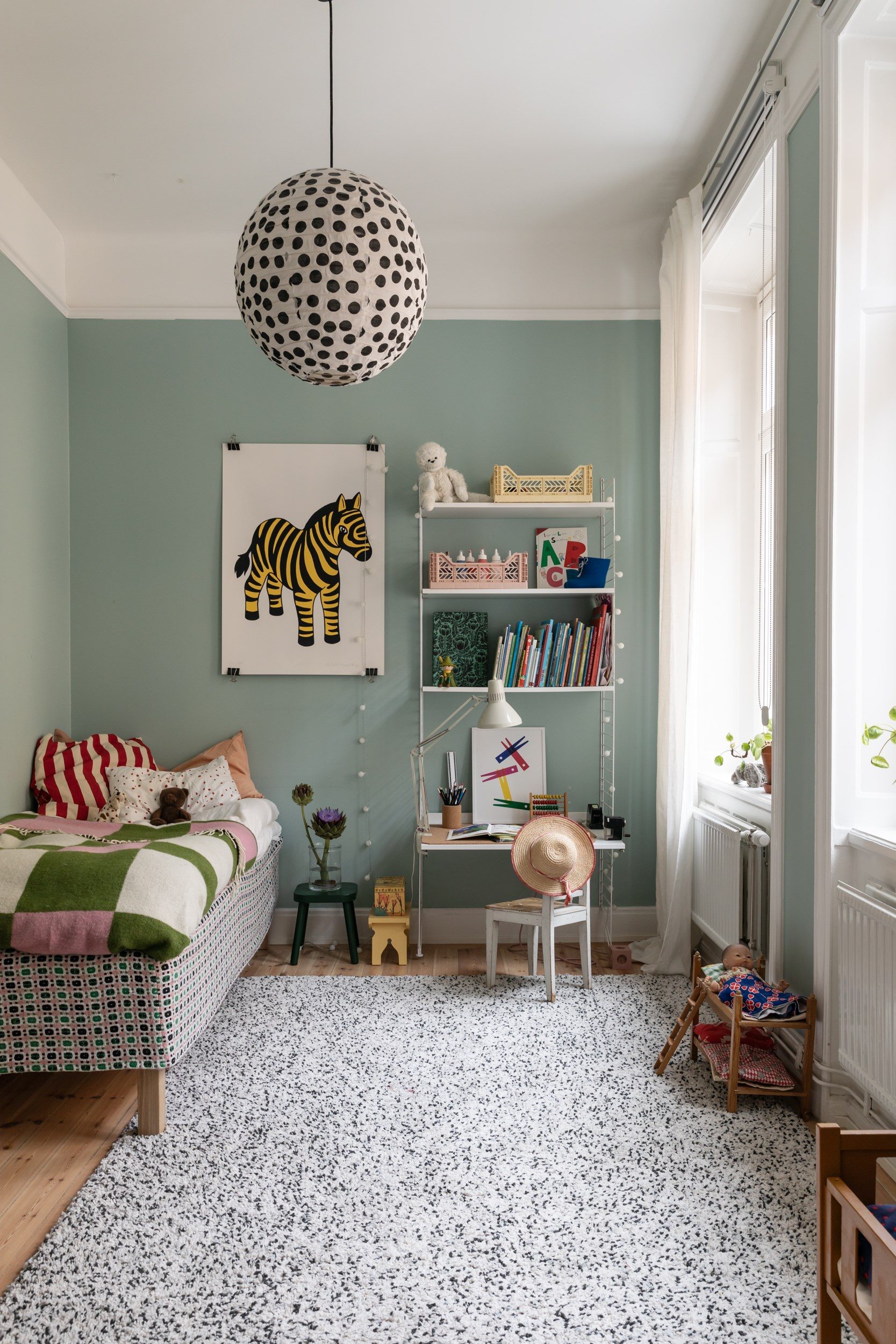 Lägenhetens sovrum nås främst via vardagsrummet, samt via en glasad dörr från sovrum 2, och nyttjas idag som barnrum. Väggarna är målade i en turkos kulör som passar väl ihop med furugolvet. Två stora fönster i fil släpper in fantastiskt ljus.