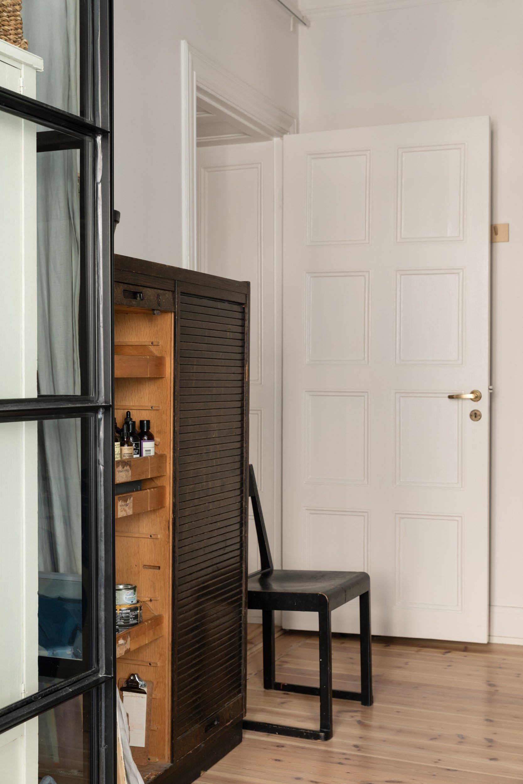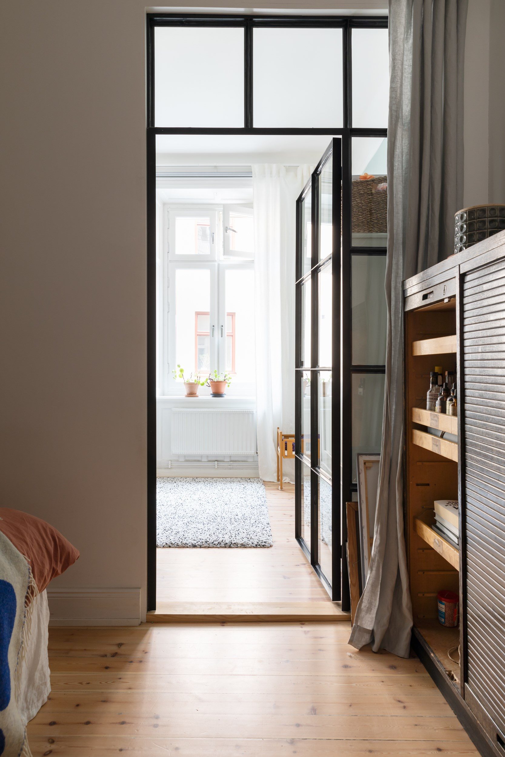 Lägenheten andra sovrum ligger privat och nås från hallen. Väggarna är vitmålade vilket ger en ljus och luftig känsla tillsammans med det charmiga plankgolvet. Här möbleras med fördel en dubbelsäng och sängbord, liksom en förvaringsmöbel om man skulle önska. En industridörr i glas binder samman med sovrum ett, smidigt om man har barn som kommer tassandes om nätterna.