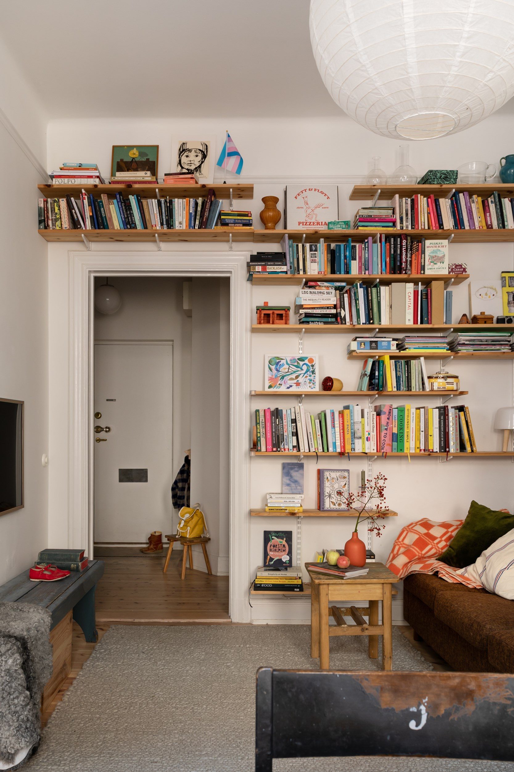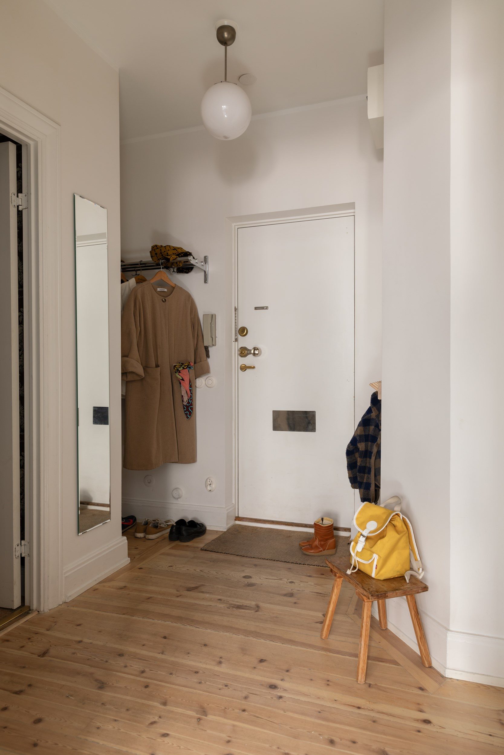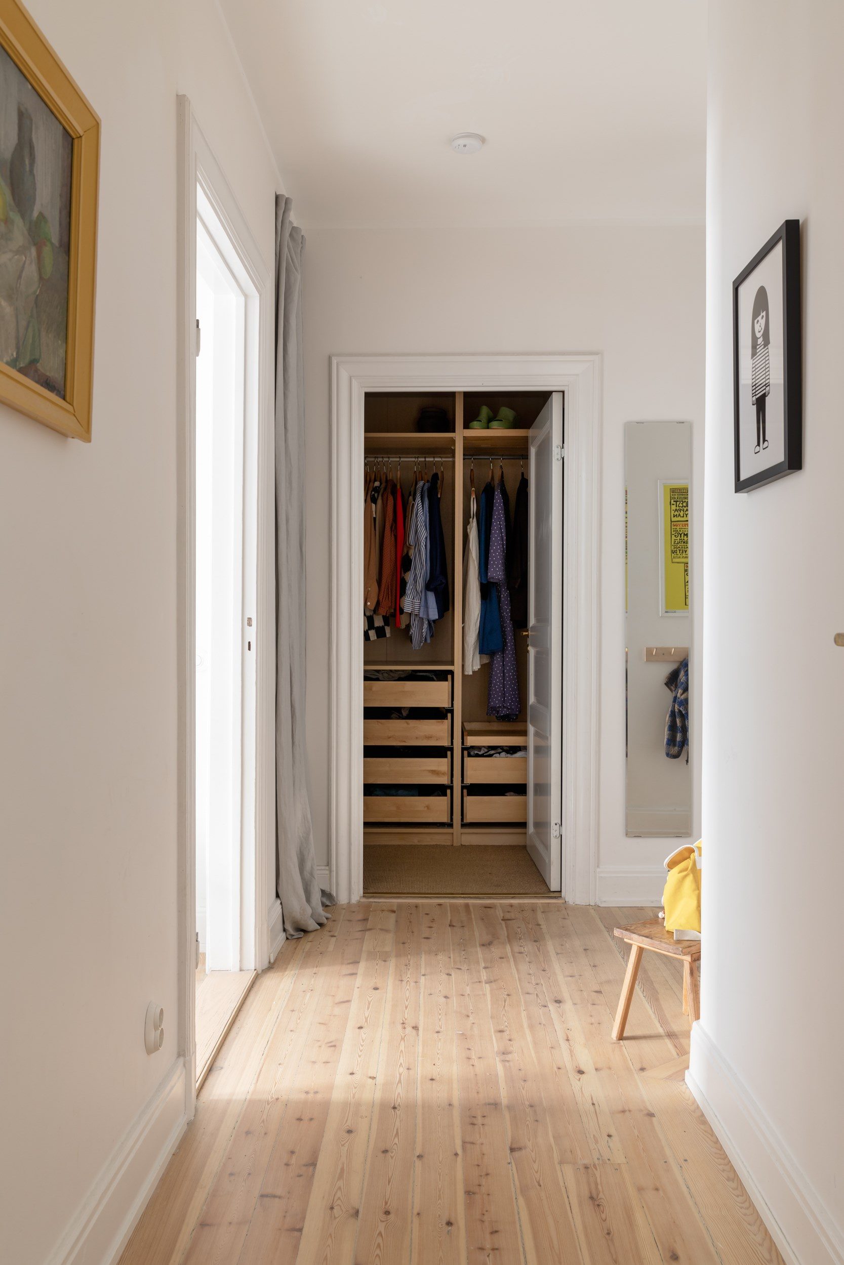 Hallen ligger, likt ett förmak, något avskilt från lägenhetens övriga ytor vilket skapar gott om plats för förvaring. Här finns en hatthylla för avhängning av ytterkläder och skor, samt en generös klädkammare för hela familjen. Härifrån når man badrummet och ett av sovrummen, samt vardagsrummet rakt fram.