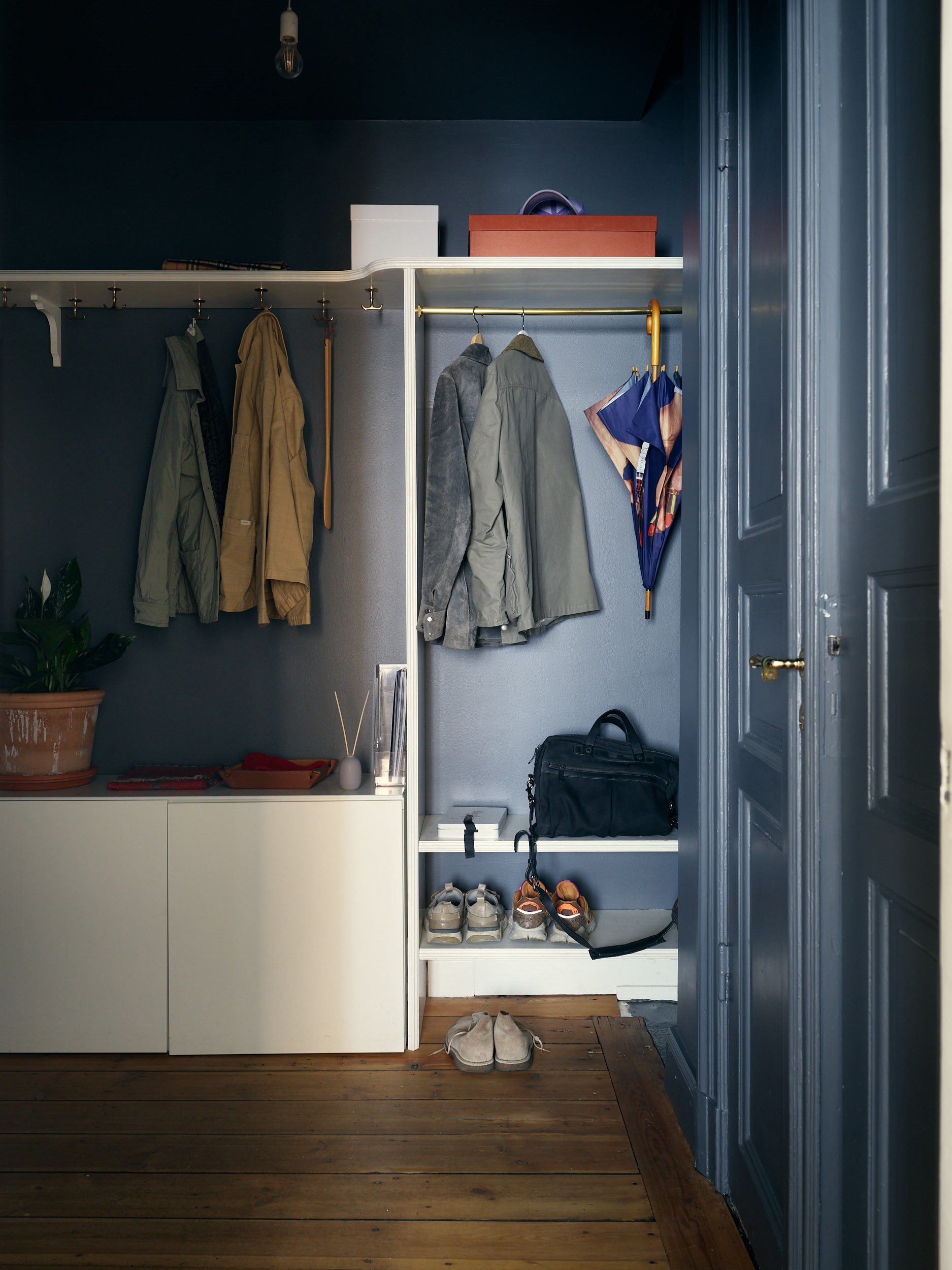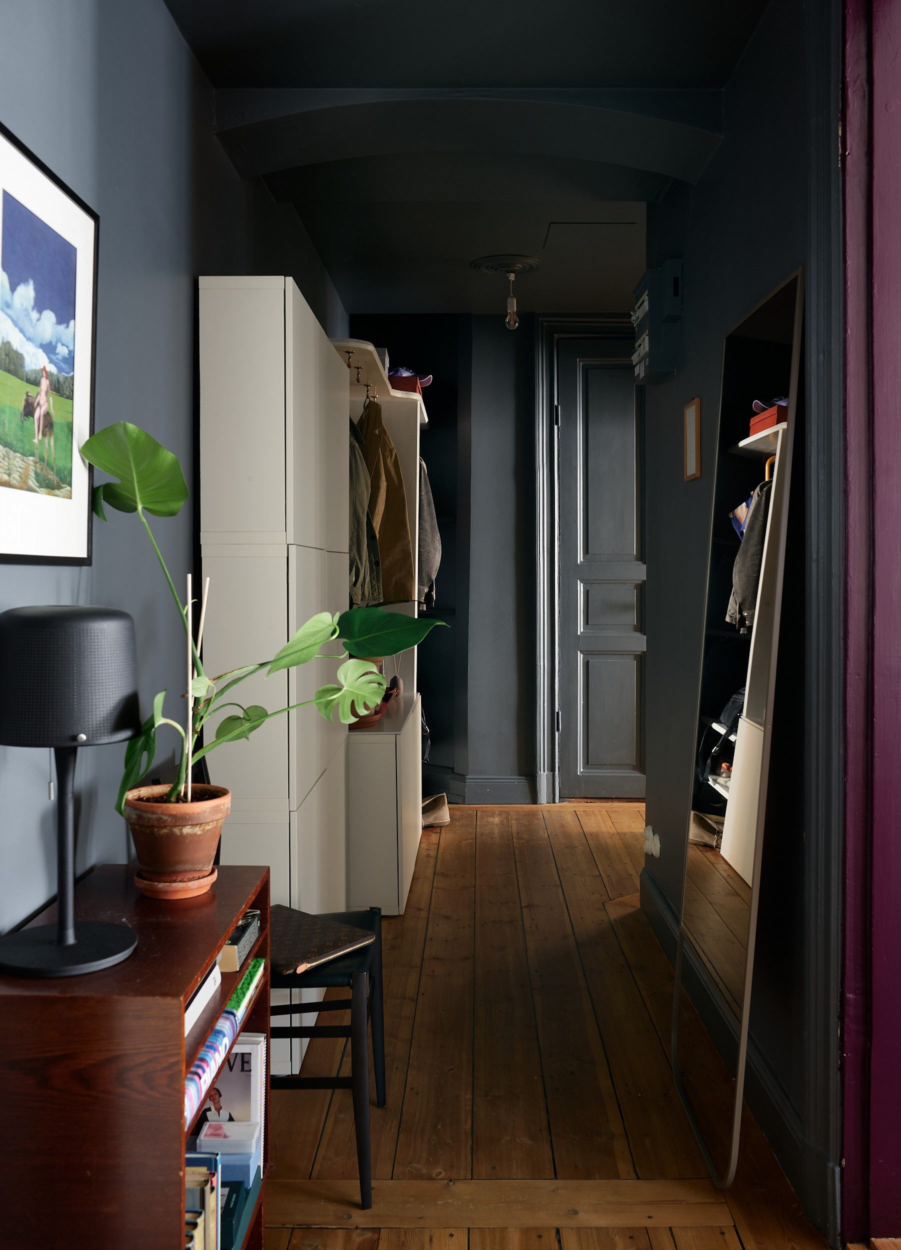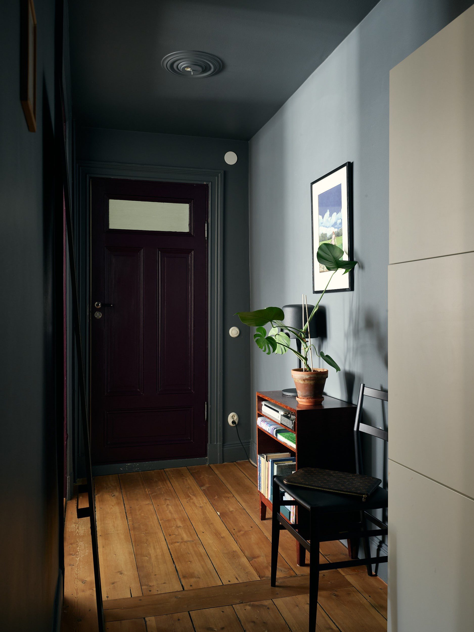 Den välkomnande hallen har ypperliga avhängningsmöjligheter, och förvaring finns i form av hyllor, bänkskåp och en klädkammare som idag används som städskåp. Brädgolvet är framtaget och väggarna målade i mörkblått. Parspegeldörrarna in till vardagsrummet är målade i en lila kulör.