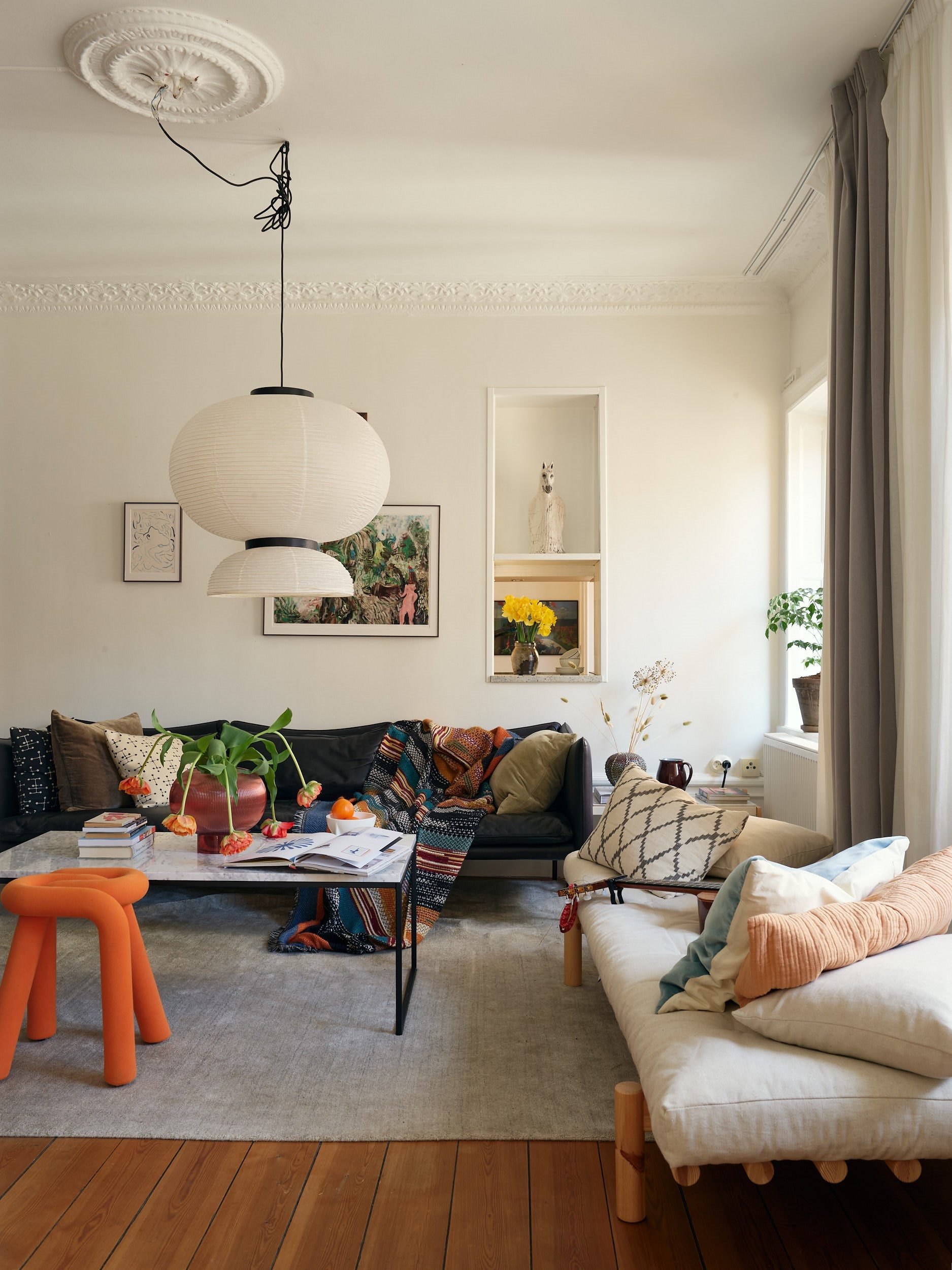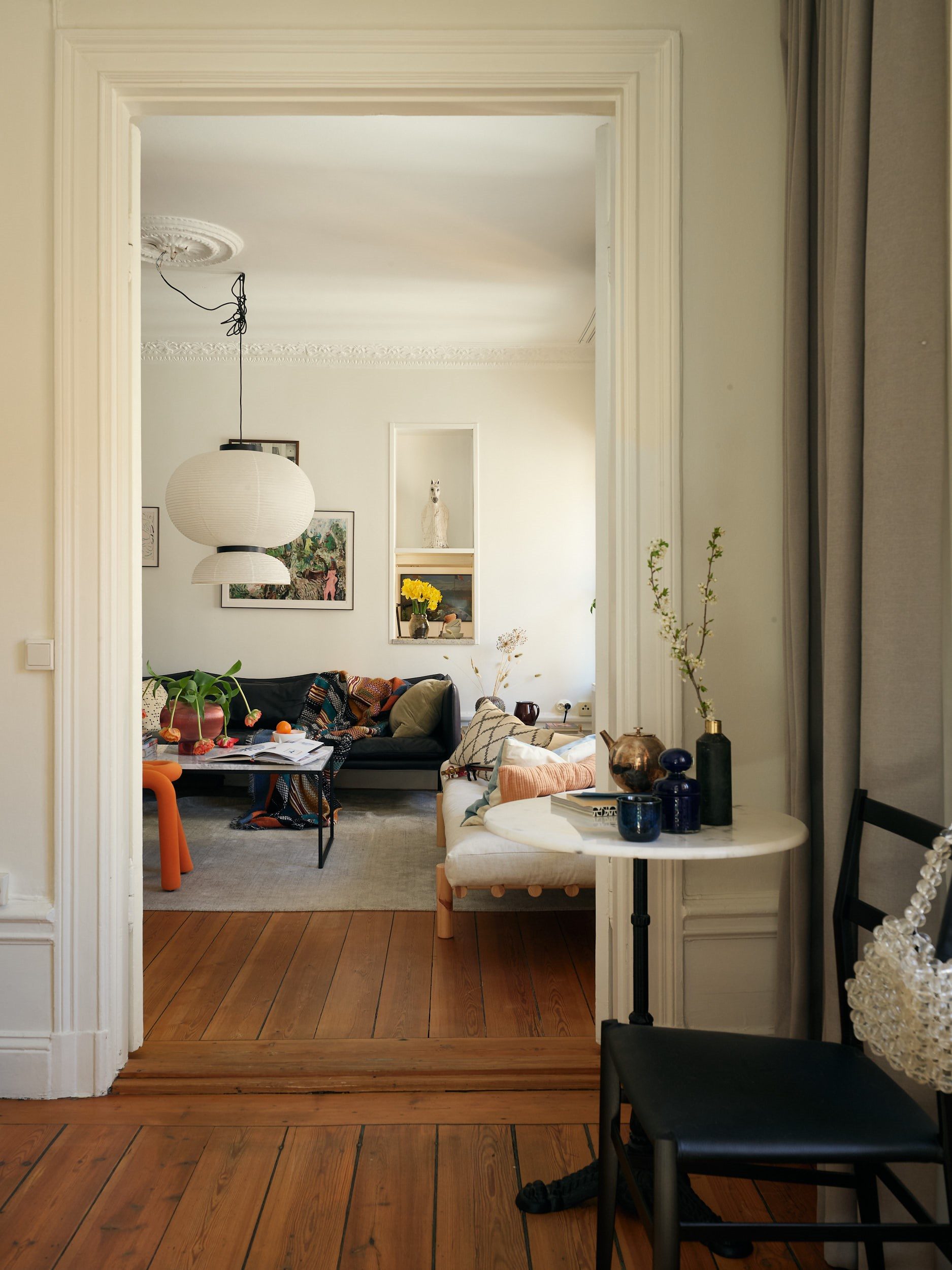 Två stora fönster fyller lägenhetens vardagsrum med ljus och skapar, tillsammans med takhöjden, en härligt luftig atmosfär. Rummet är väldimensionerat, och det finns gott om plats för en stor soffgrupp med tillhörande möblemang. Brädgolvet är framtaget och väggarna målade i vitt. Vackra parspegeldörrar öppnar och skiljer av mot hallen och sovrummet.