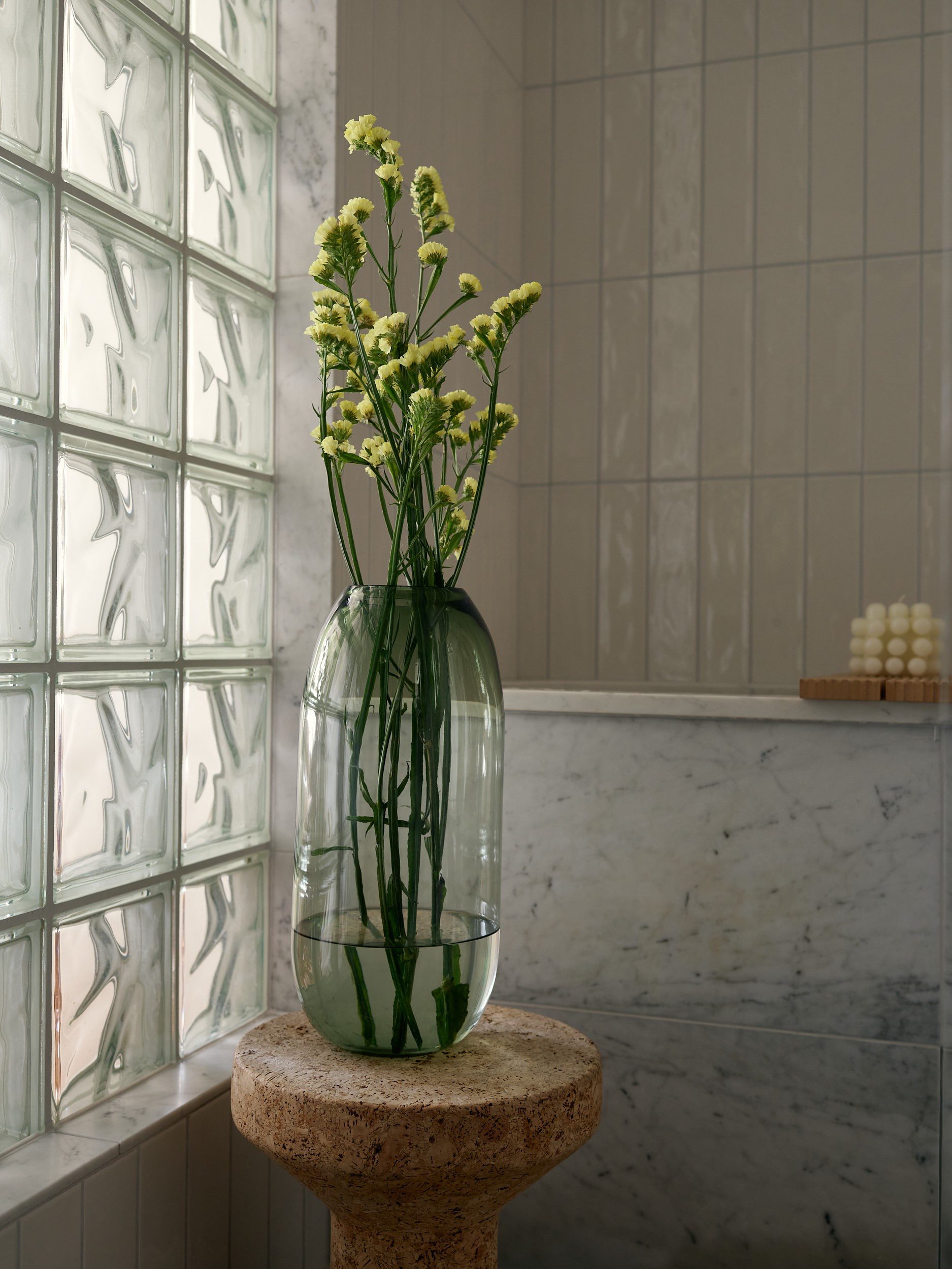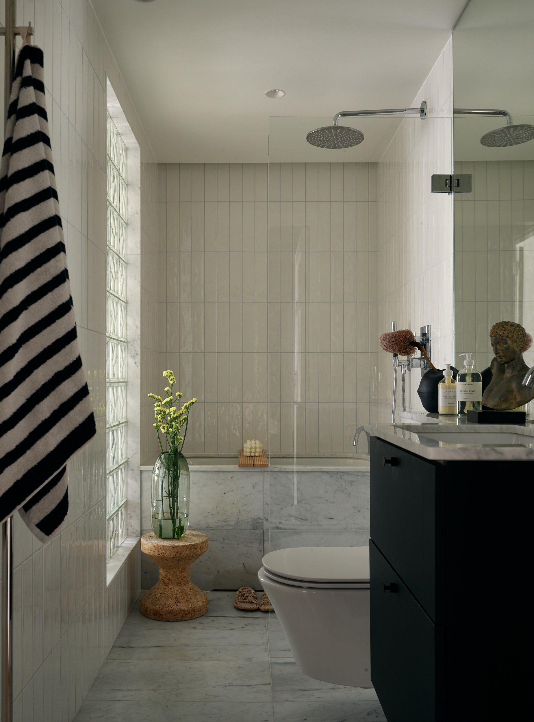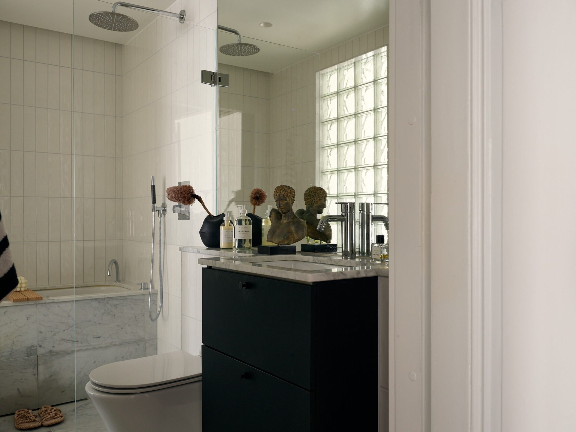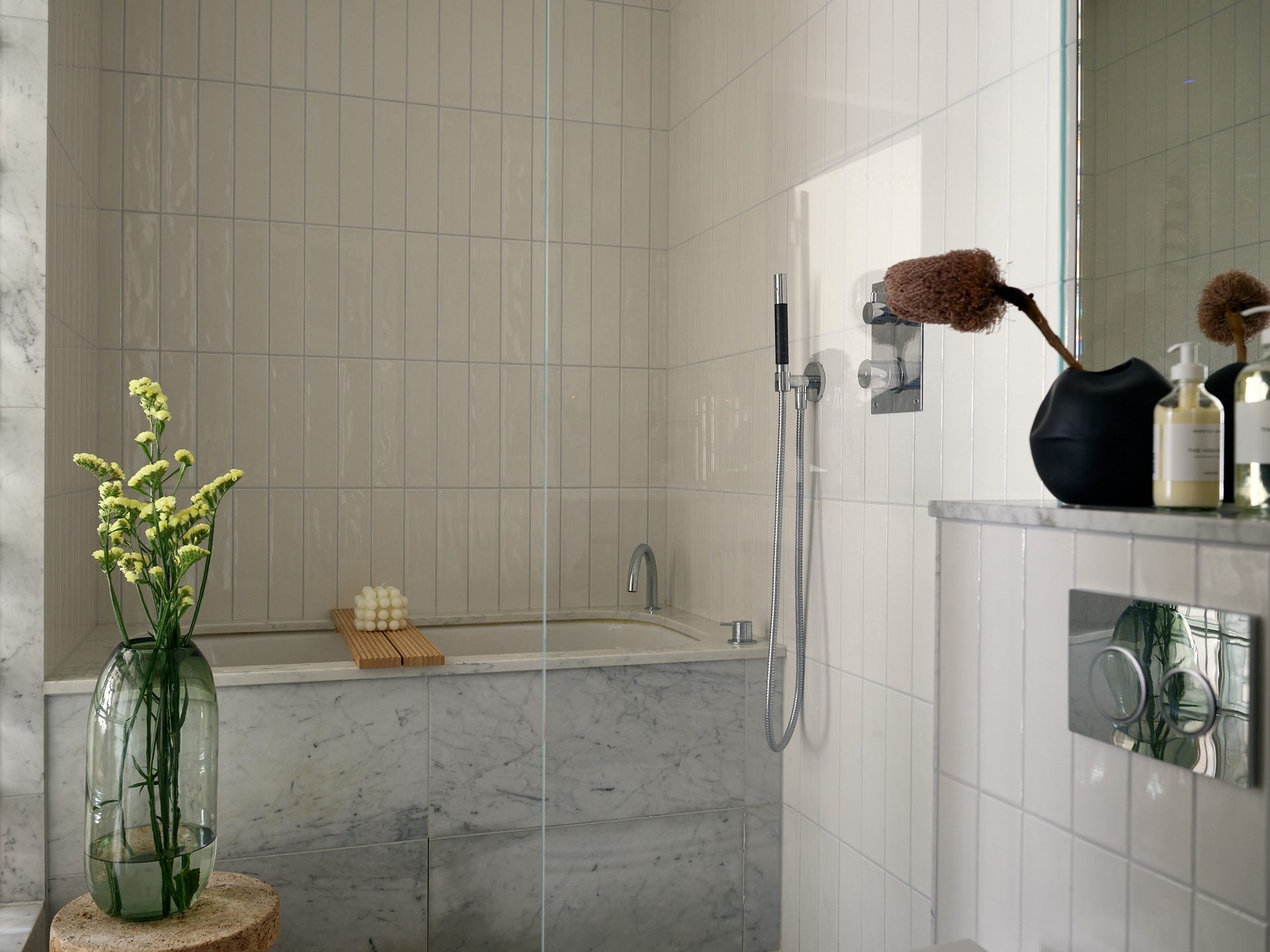 Badrummet, totalrenoverat 2023 med påkostade materialval, inrymmer badkar, duschhörna, handdukstork, tvättkommod och vägghängd toalett. Badkaret är platsbyggt och duschhörnan, med både takdusch och handmunstycke, skärmas av med en glasskiva. Handfatet är infällt i en marmorskiva. Väggarna är klädda med vitt kakel och golvet belagt med stora marmorplattor. Glasbetong från golv till tak i väggen mot sovrummet släpper in morgonsolen. Golvvärmen gör gott för morgonkalla fötter, och taket har infällda spottar som ger en bra belysning.