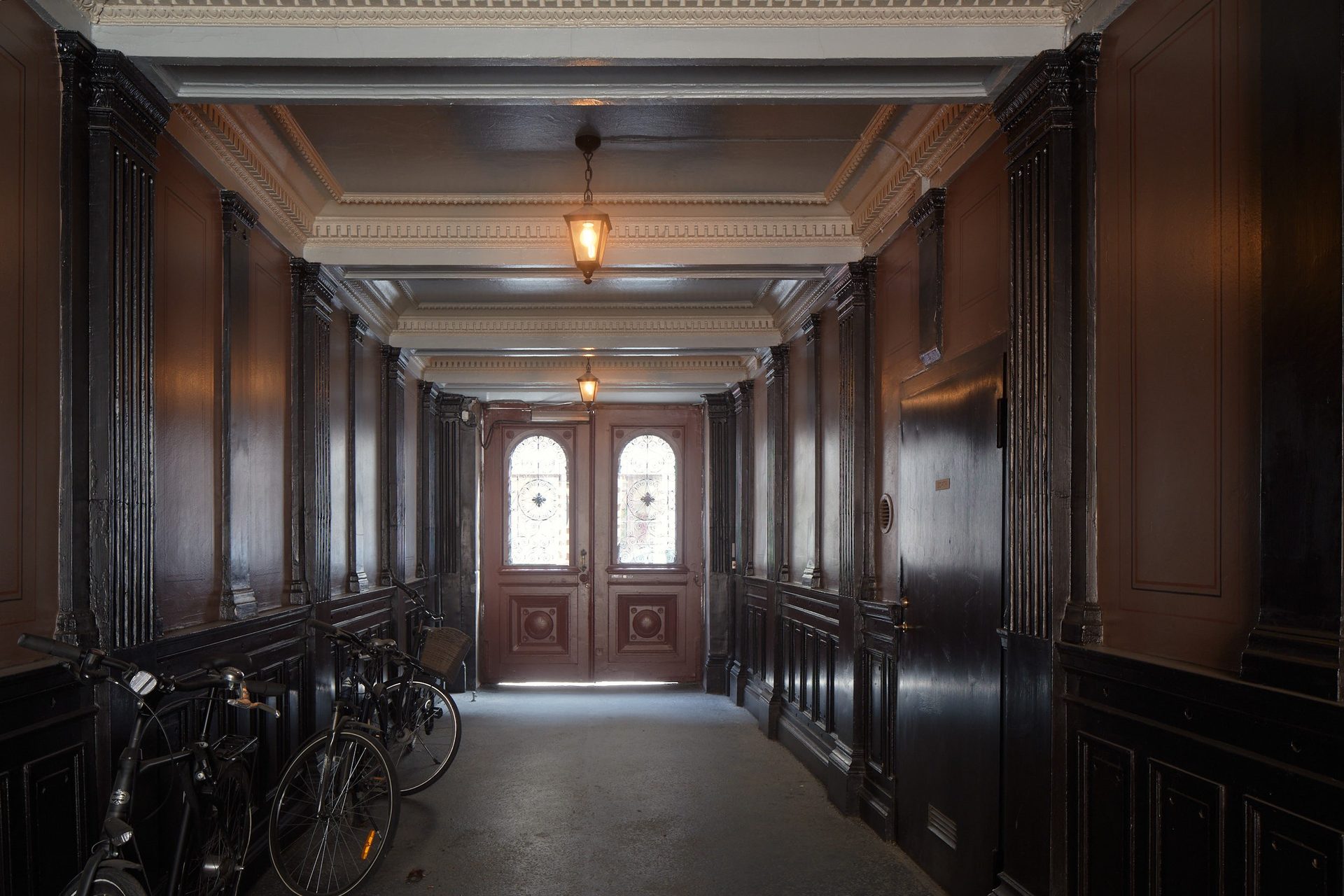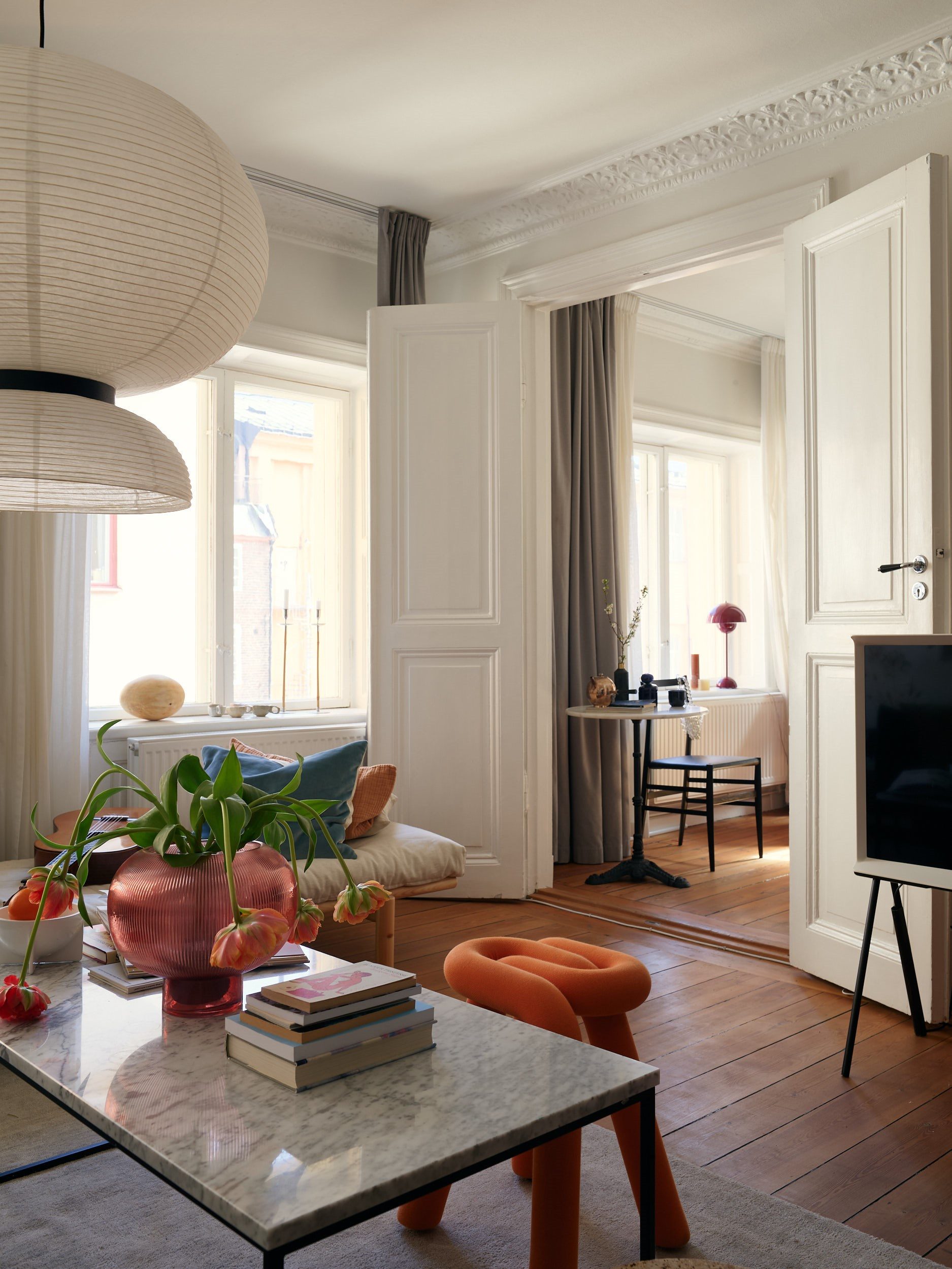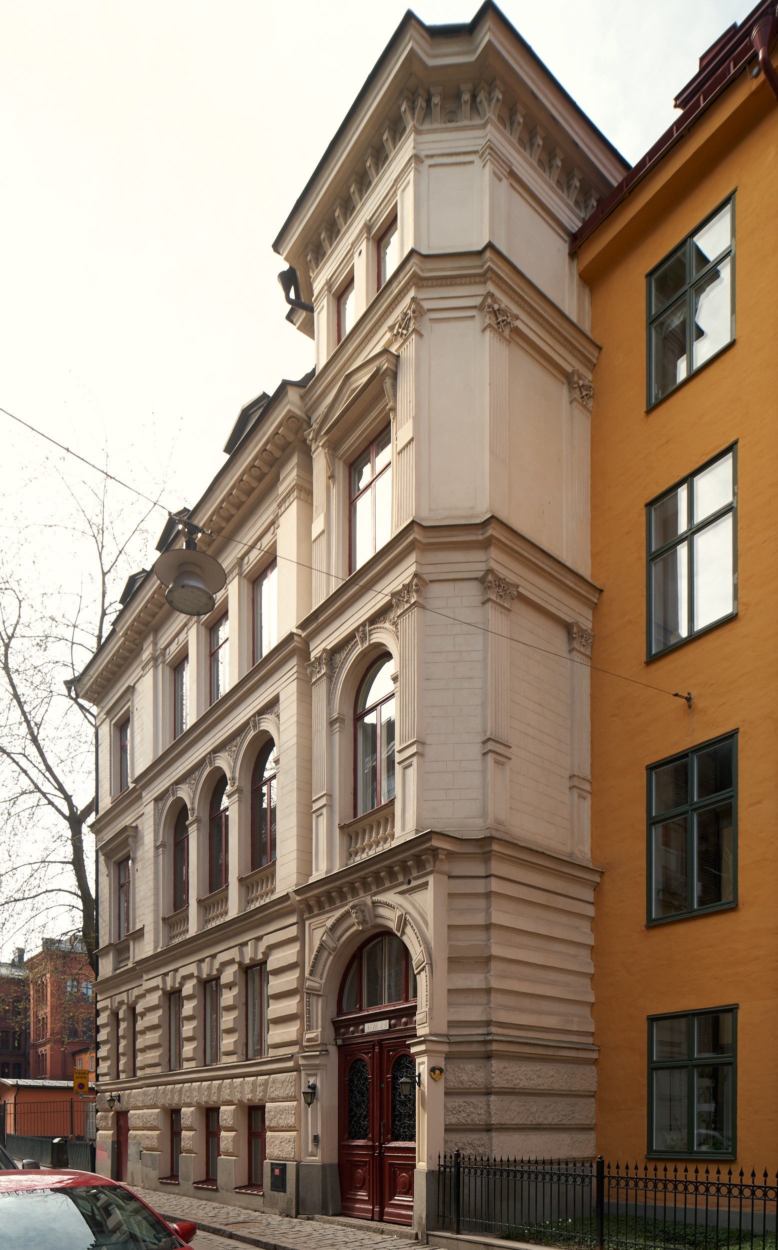 Mitt emellan Mariatorget och Mosebacke finner vi denna fina 1800-talstrea med högt i tak, rum i fil och stora fönster i djupa nischer. Brädgolven är framtagna, och bevarade snickerier såsom stuckatur, takrosetter, lister, parspegeldörrar och fönsterbågar ger en vacker inramning. I det rum som idag används som matsal – men som även passar bra som barnrum, gästrum eller arbetsrum – är taket besmyckat med en målning av den etablerade nutida konstnären Martin Kozlowski. Lägenheten breder ut sig över ett helt eget våningsplan, och här råder en tyst, trivsam och harmonisk stämning. Redan vid första besöket märker man av dess ombonade och väldigt speciella känsla. Det är ett representativt och mycket trivsamt boende med ett perfekt läge i lugna kvarter med sjudande kafé-, restaurang- och barstråk inom ett stenkast. De flesta av Södermalms guldkorn finns på kort gångavstånd, och i behagligt tempo promenerar man även snabbt in till stan.