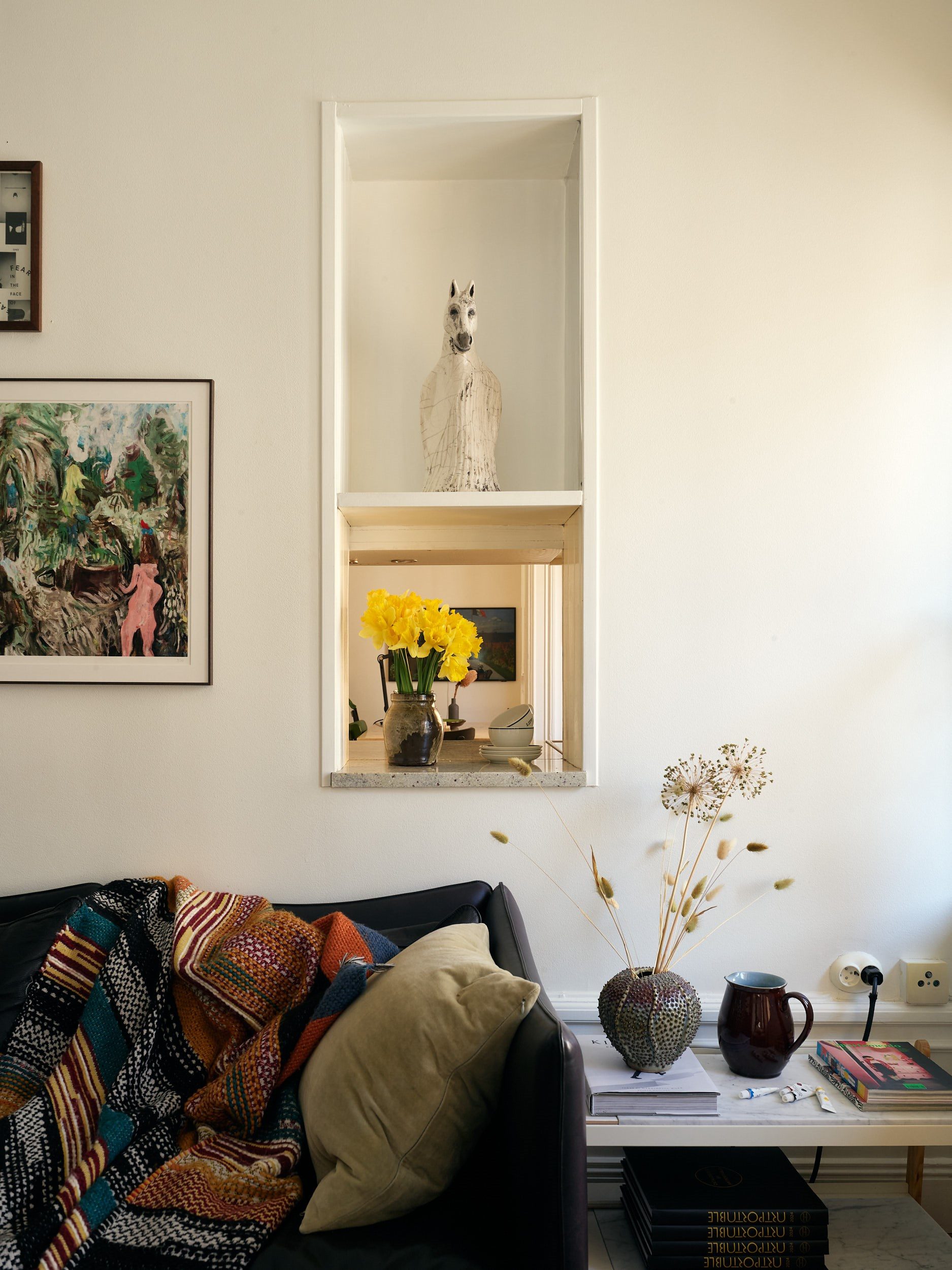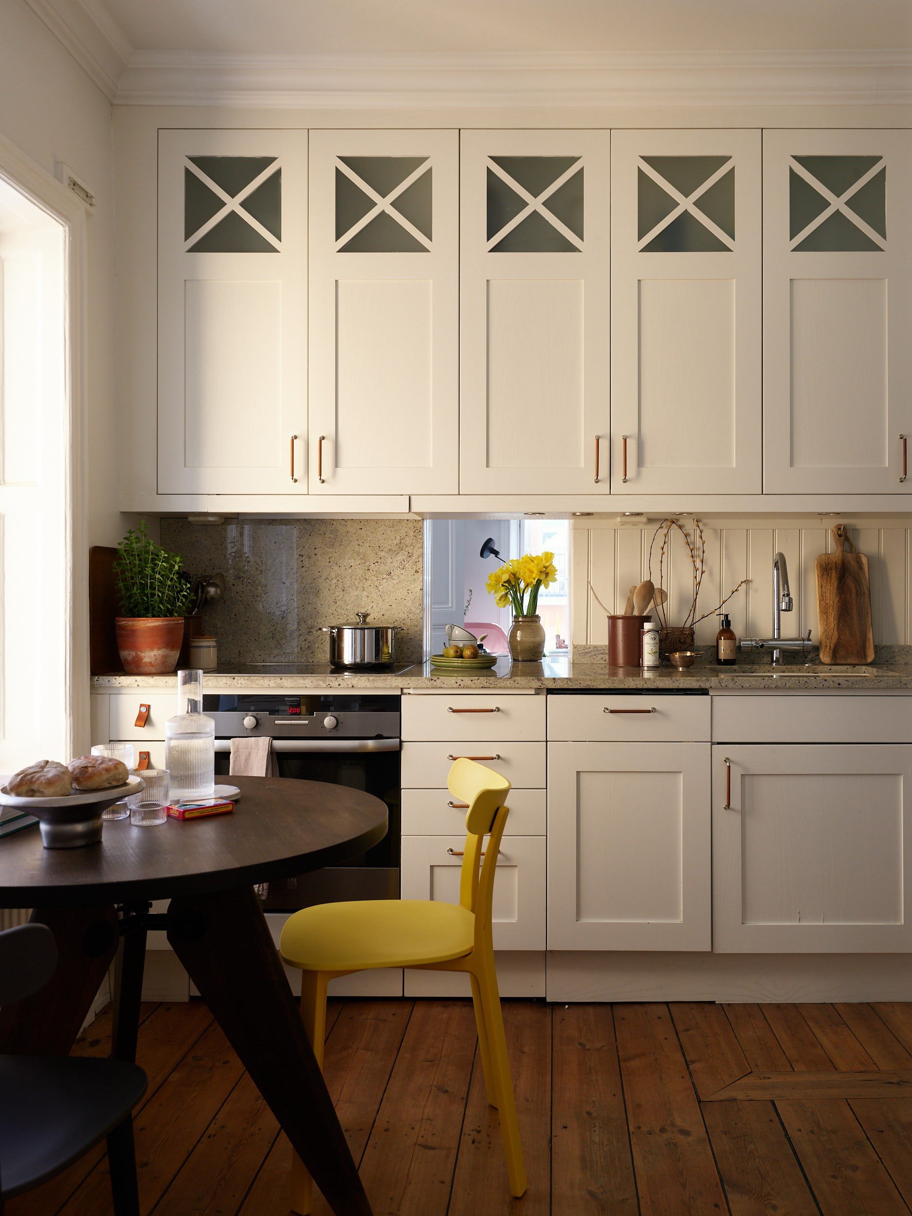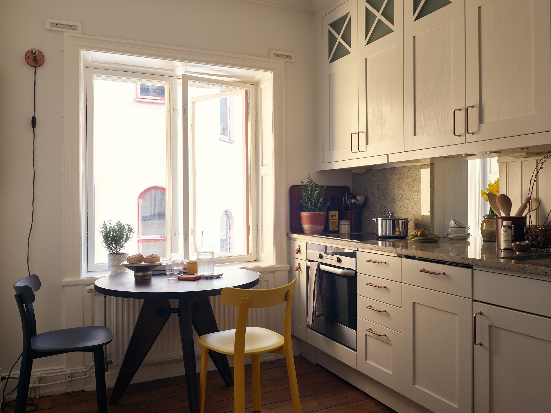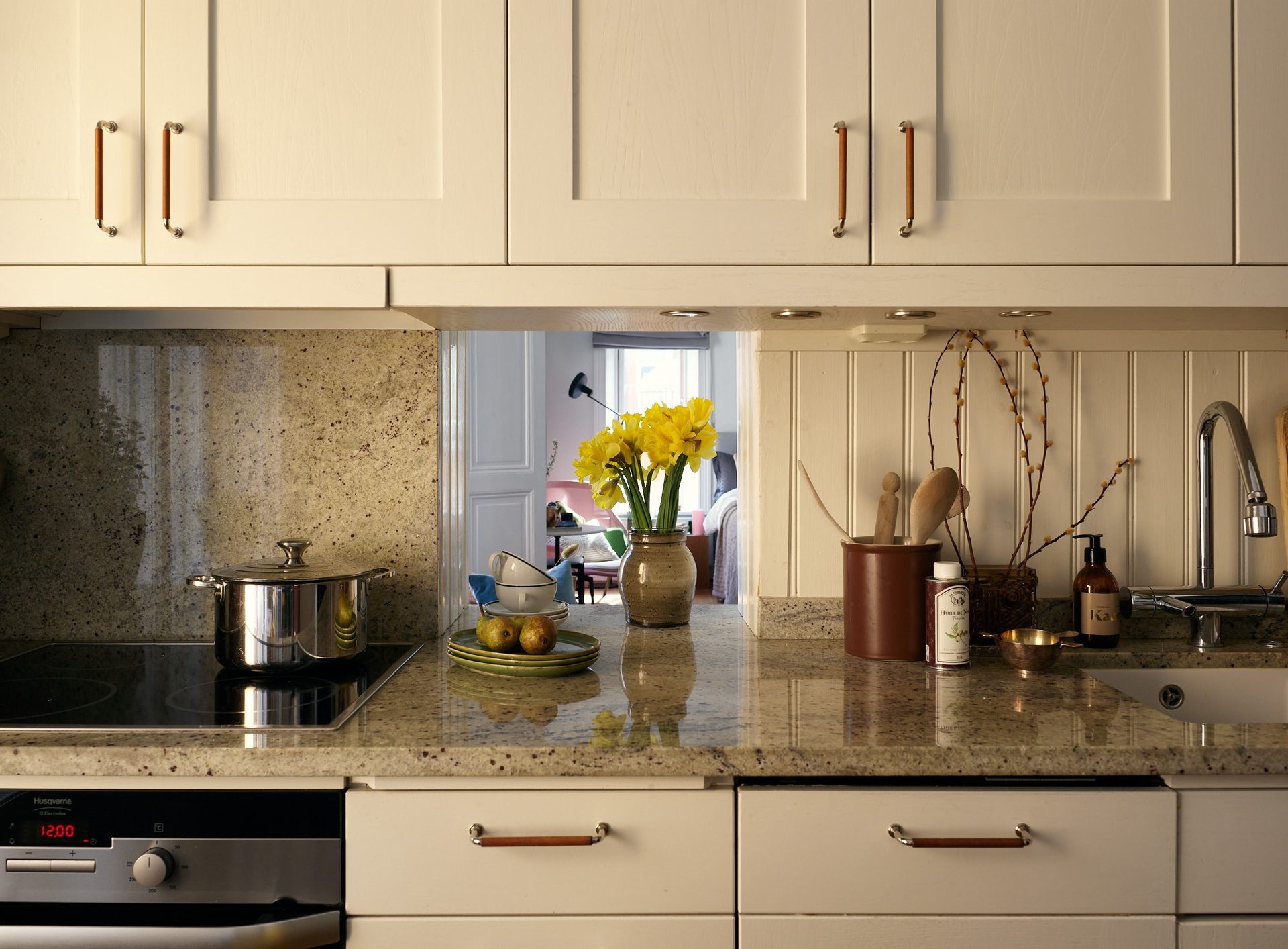 Köket är lika välplanerat som smakfullt, och det finns gott om både arbetsyta och förvaring. De vita skåpen med spröjsade vitringlas högst upp har platsbyggts i massivt trä, och den breda köksbänken är i sten med infälld spishäll och underlimmad diskho i vitt porslin. Partiet ovanför bänkarna är klädda med sten och vit pärlspont, och serveringsluckan in till vardagsrummet är en spännande detalj. Den svarta kylen/frysen, som sattes in för cirka fem år sedan, kommer från Samsung medan övriga vitvaror – ugn, fläkt och diskmaskin – är av märket Electrolux. Diskmaskinen är integrerad i inredningen. Brädgolvet är framtaget och kökets väggar målade i vitt.