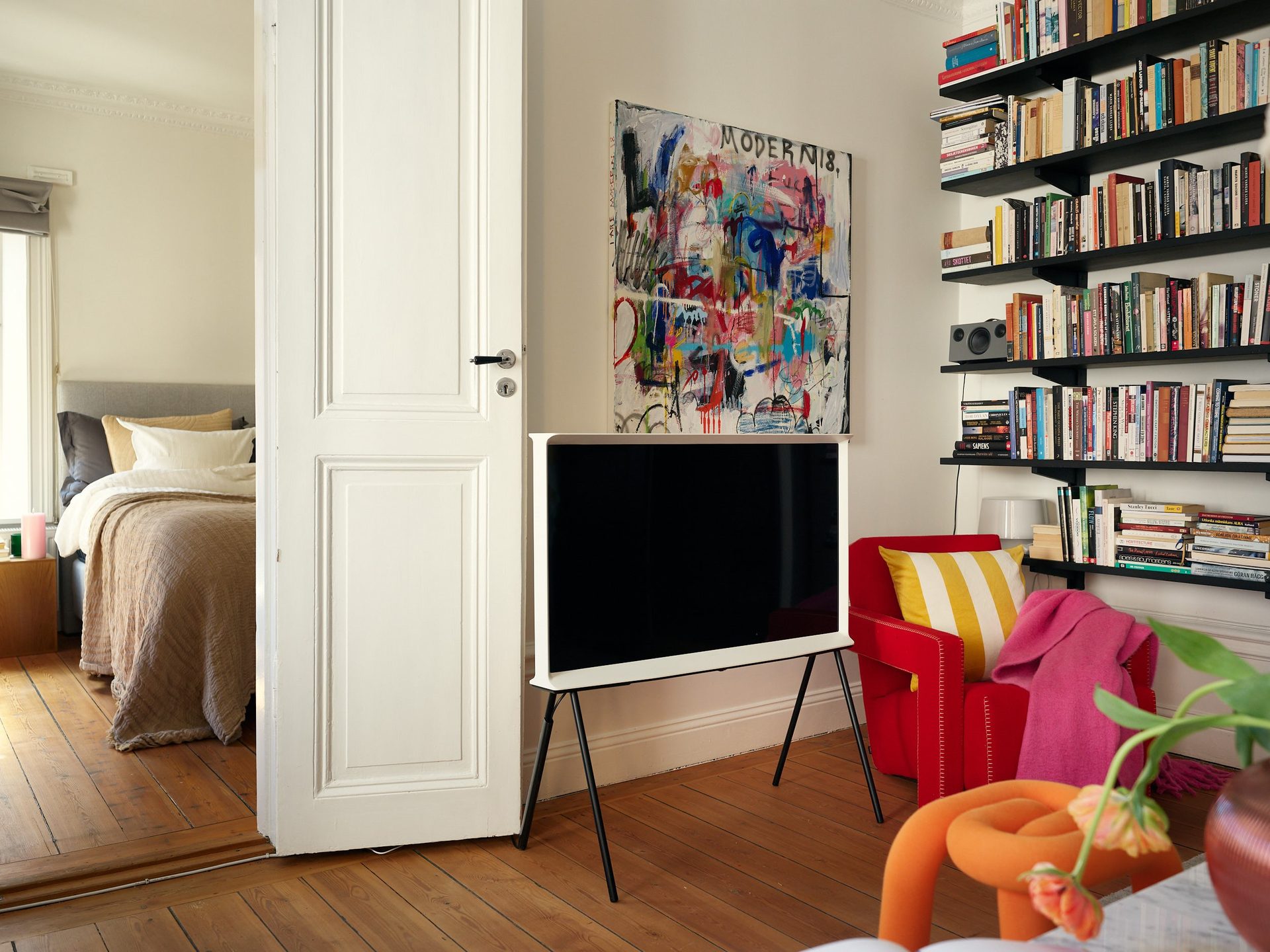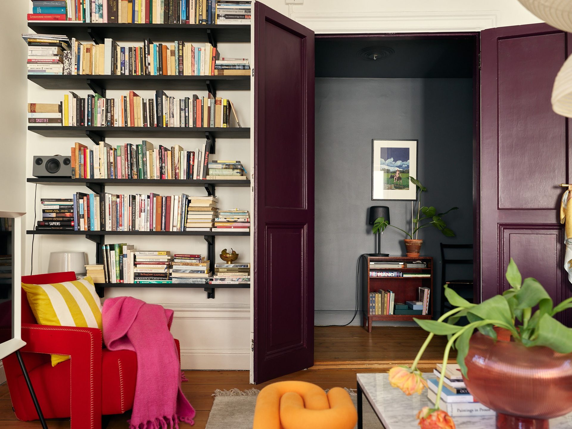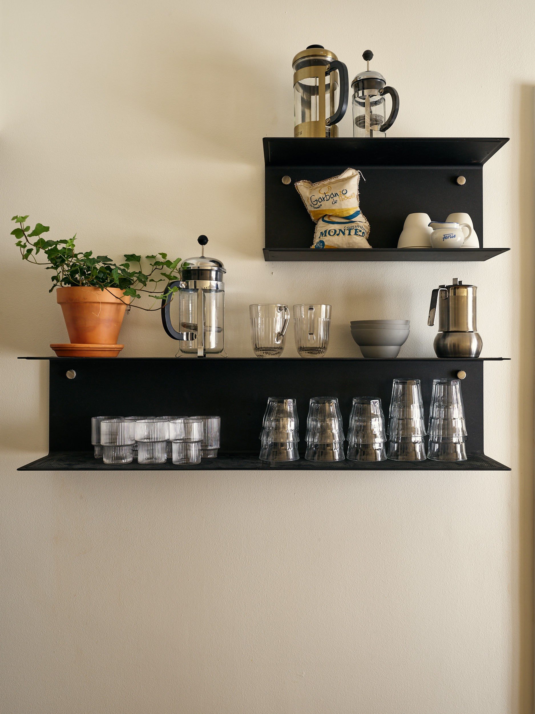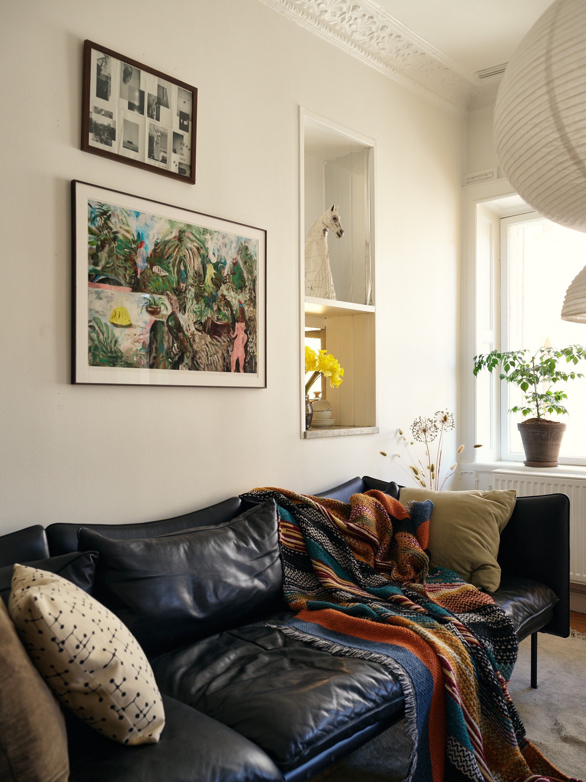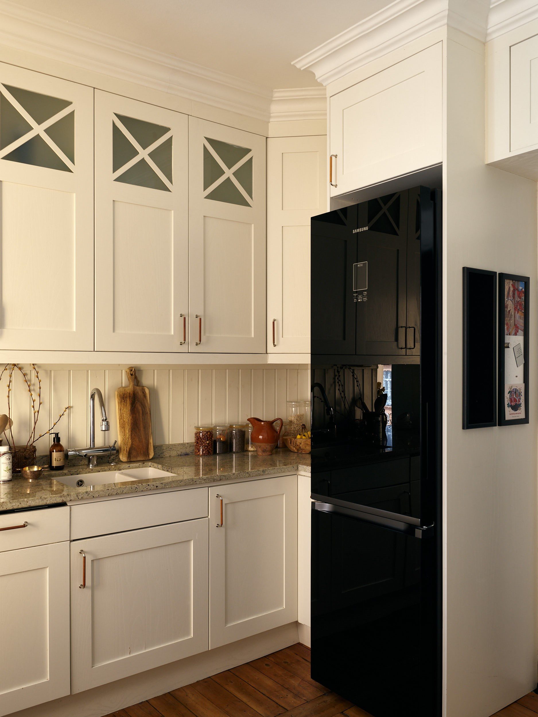 Köket är lika välplanerat som smakfullt, och det finns gott om både arbetsyta och förvaring. De vita skåpen med spröjsade vitringlas högst upp har platsbyggts i massivt trä, och den breda köksbänken är i sten med infälld spishäll och underlimmad diskho i vitt porslin. Partiet ovanför bänkarna är klädda med sten och vit pärlspont, och serveringsluckan in till vardagsrummet är en spännande detalj. Den svarta kylen/frysen, som sattes in för cirka fem år sedan, kommer från Samsung medan övriga vitvaror – ugn, fläkt och diskmaskin – är av märket Electrolux. Diskmaskinen är integrerad i inredningen. Brädgolvet är framtaget och kökets väggar målade i vitt.
