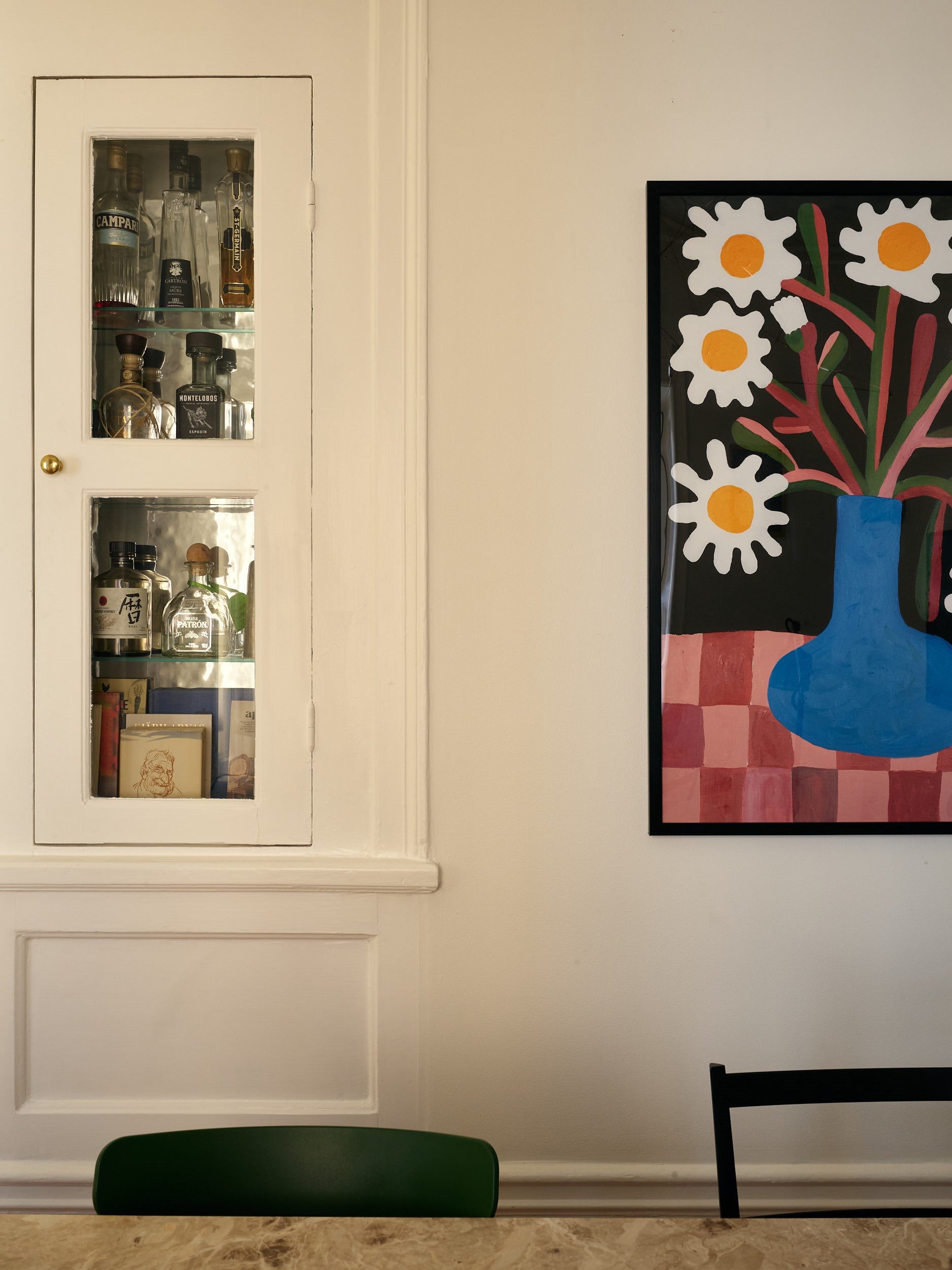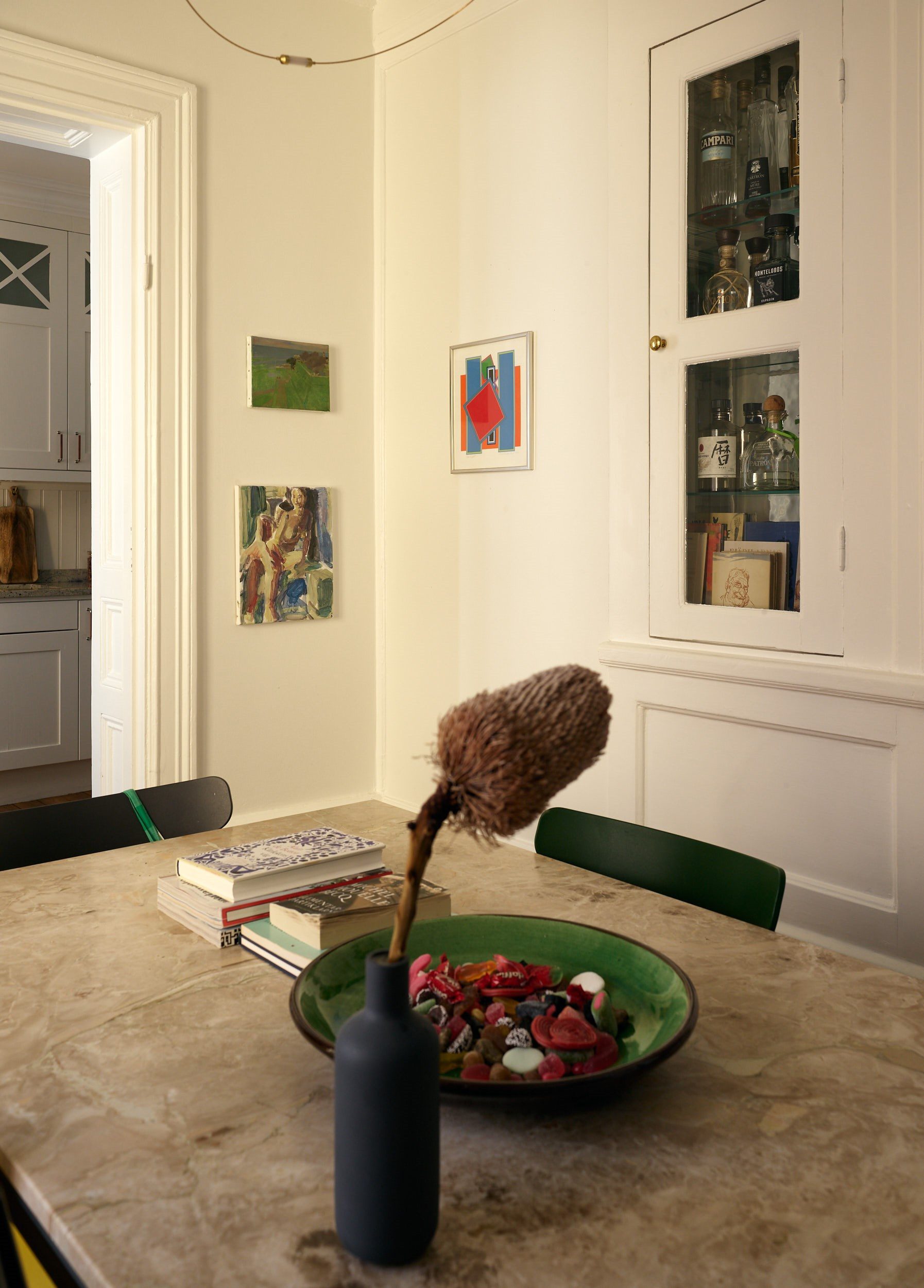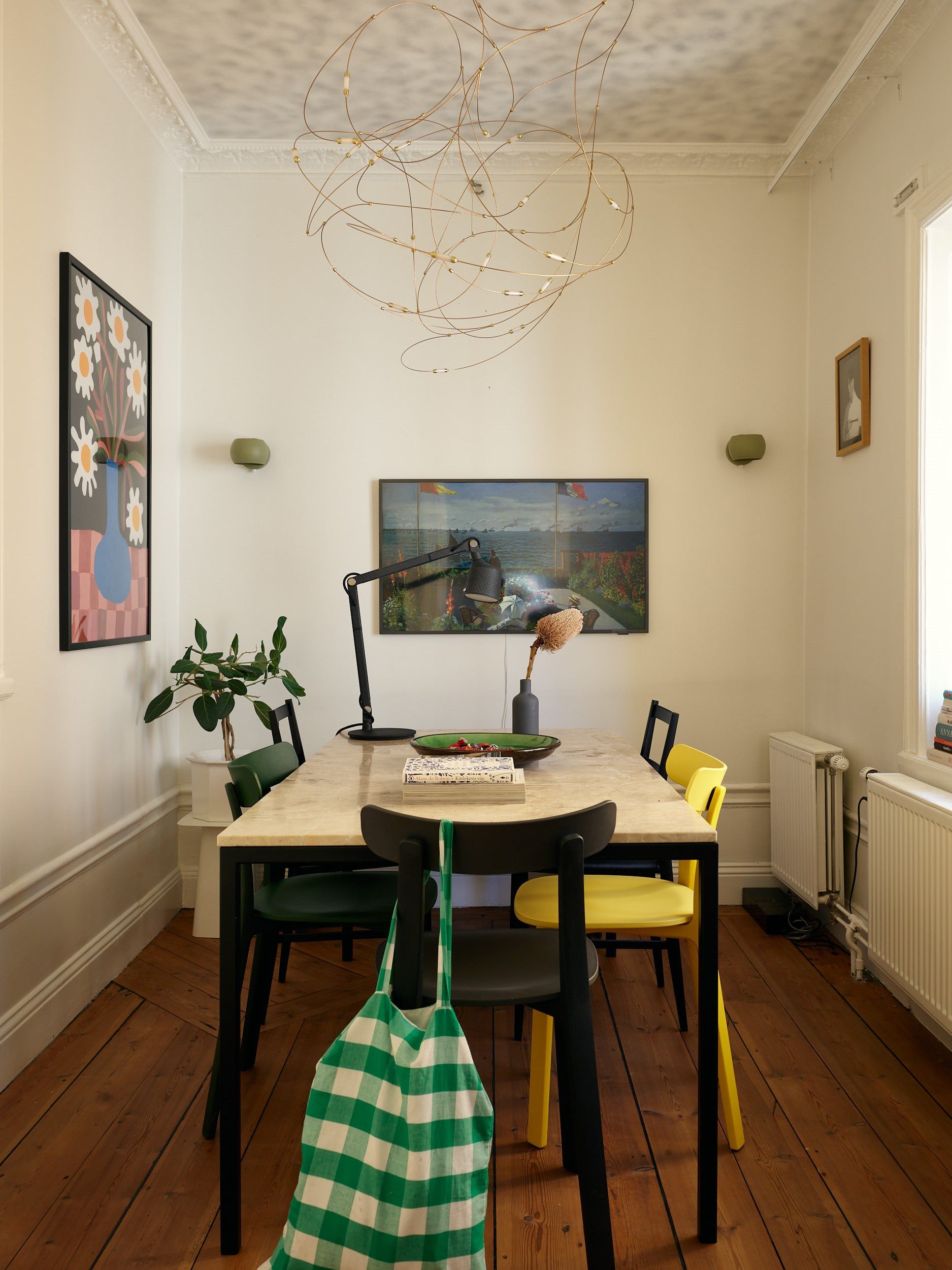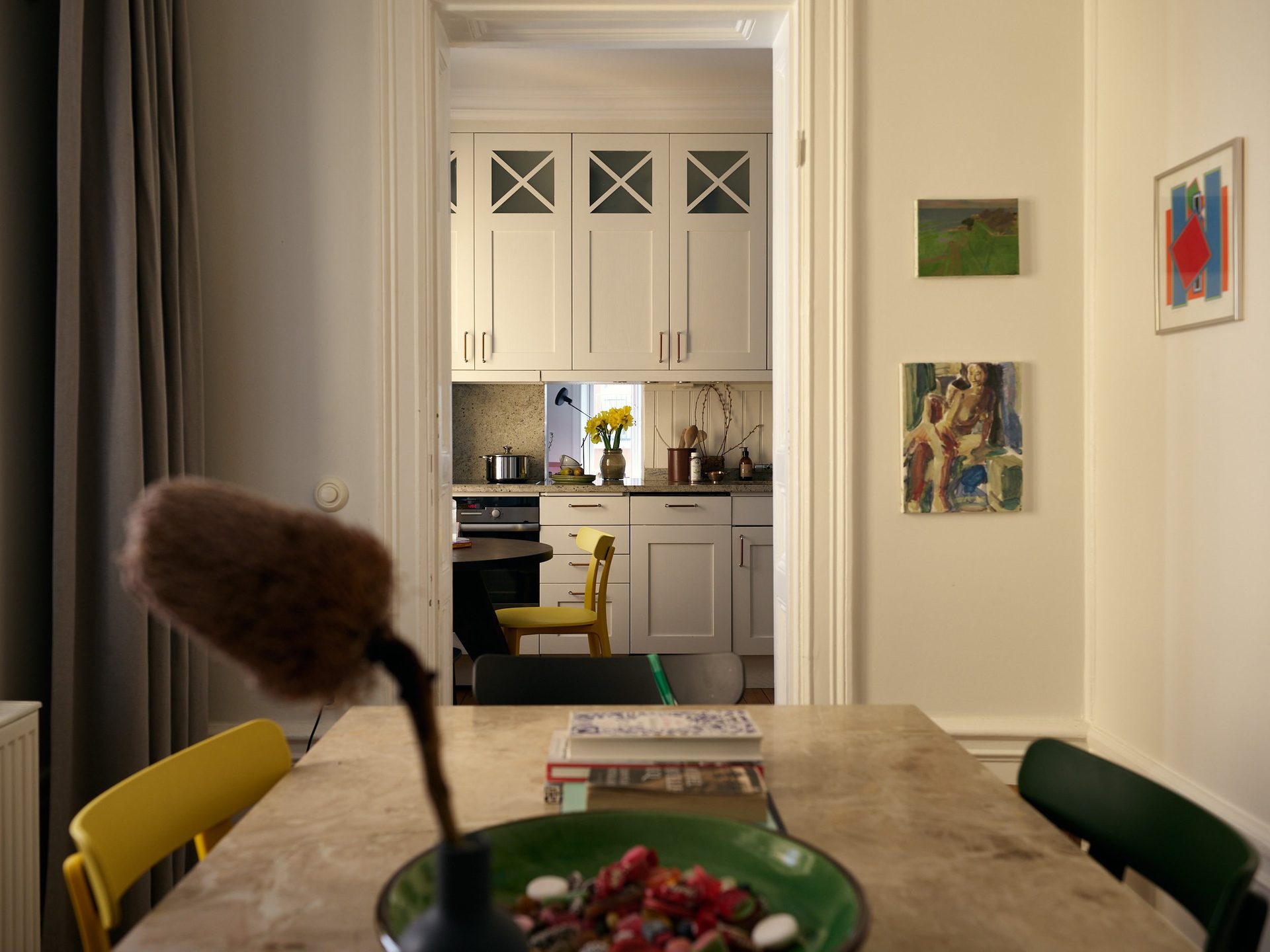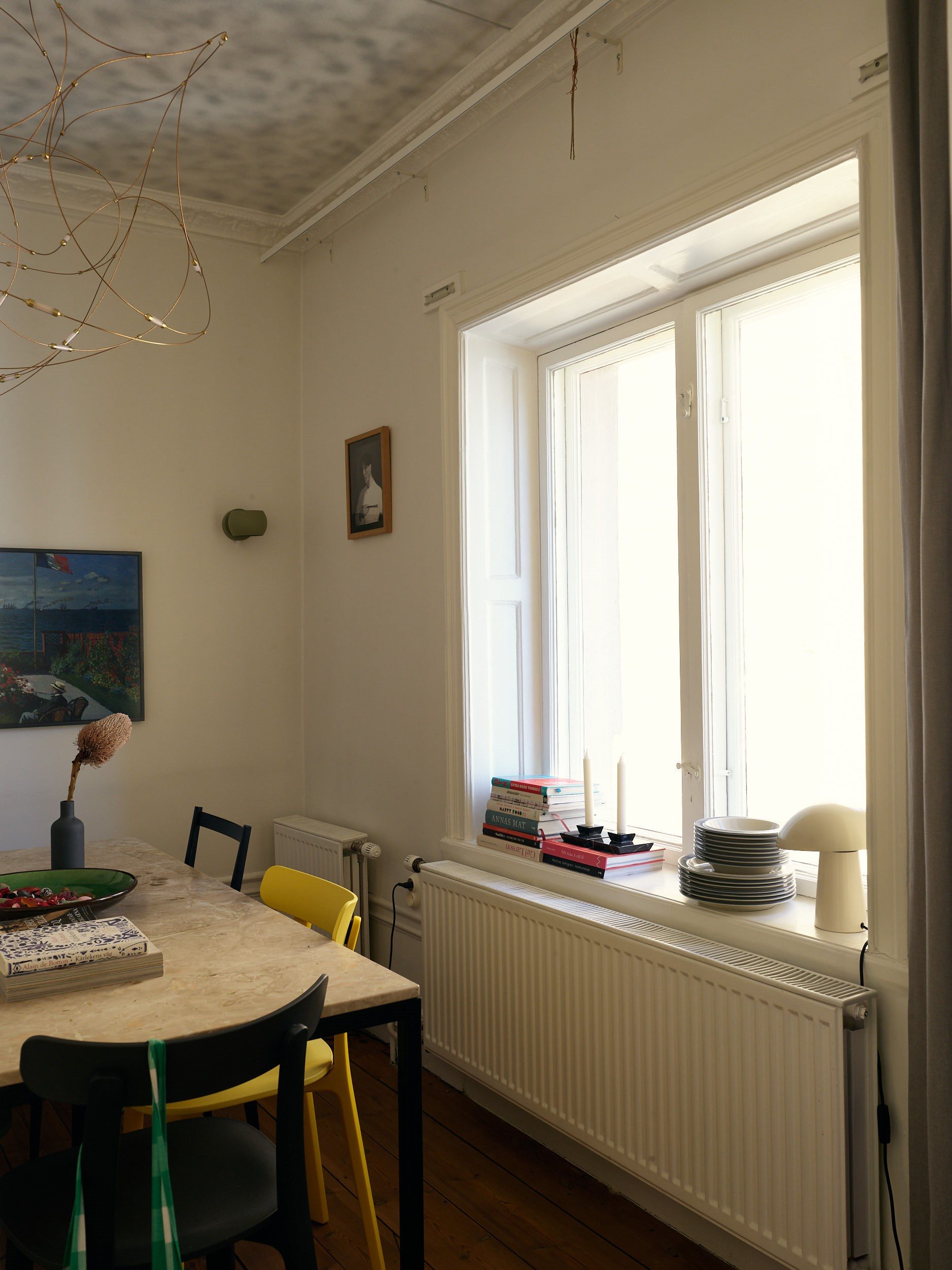 Lägenheten bjuder in till umgänge, och i matsalen innanför köket kan man duka upp till trevliga middagar med många gäster. Rummet passar även bra som barnrum, gästrum och hemmakontor. Brädgolvet är framtaget och väggarna målade i vitt. Taket är som nämnts besmyckat med en målning av konstnären Martin Kozlowski.