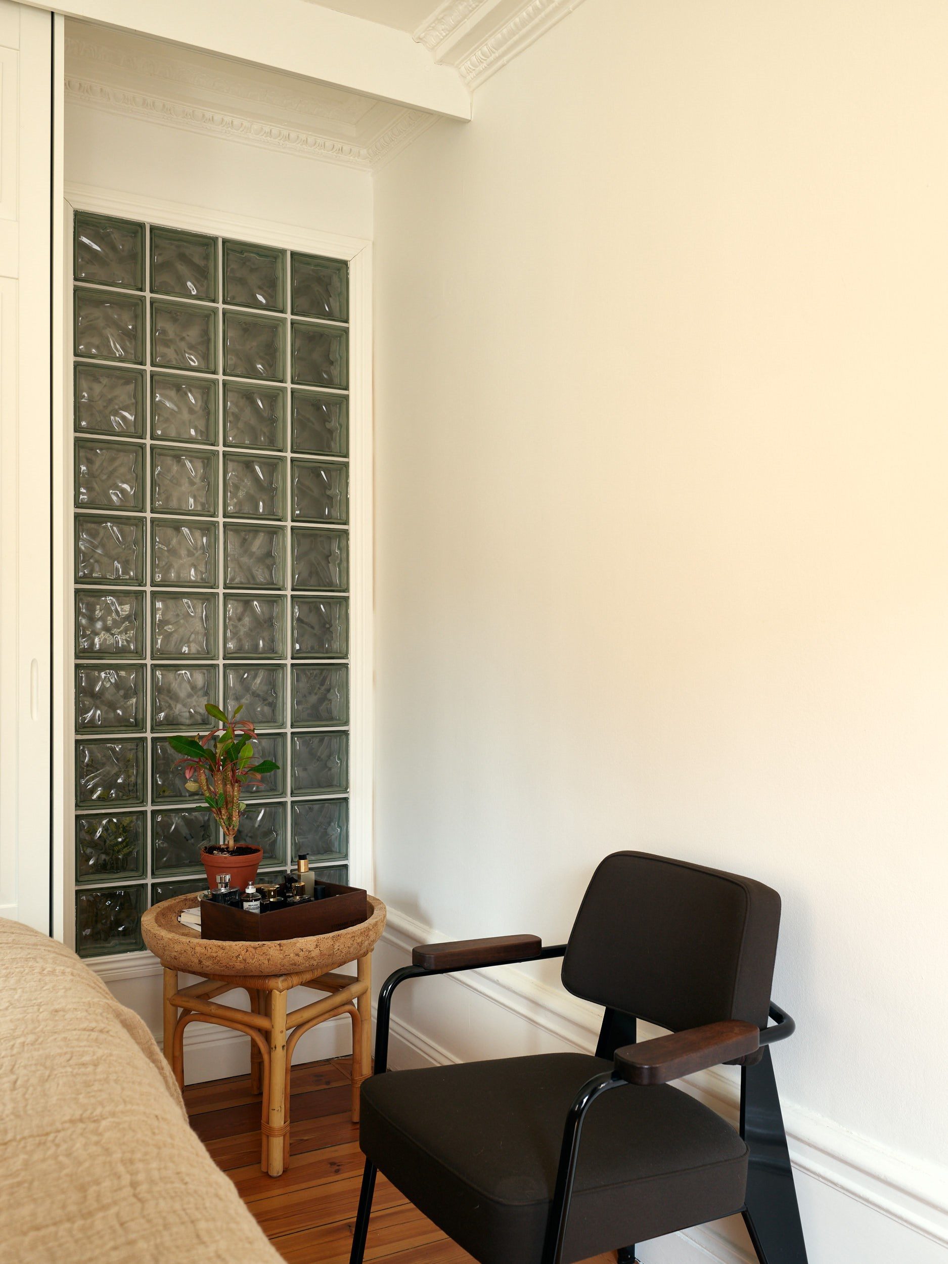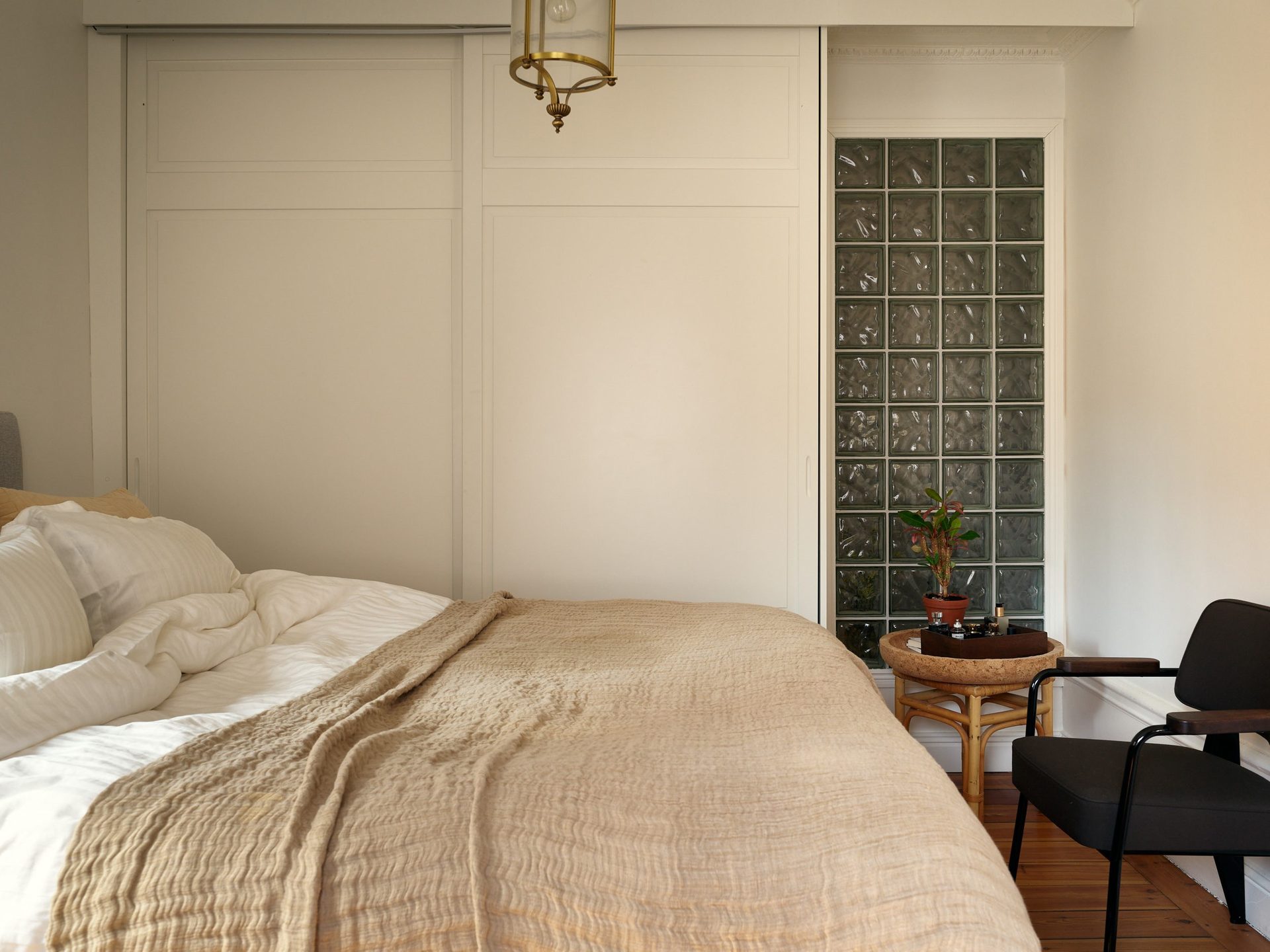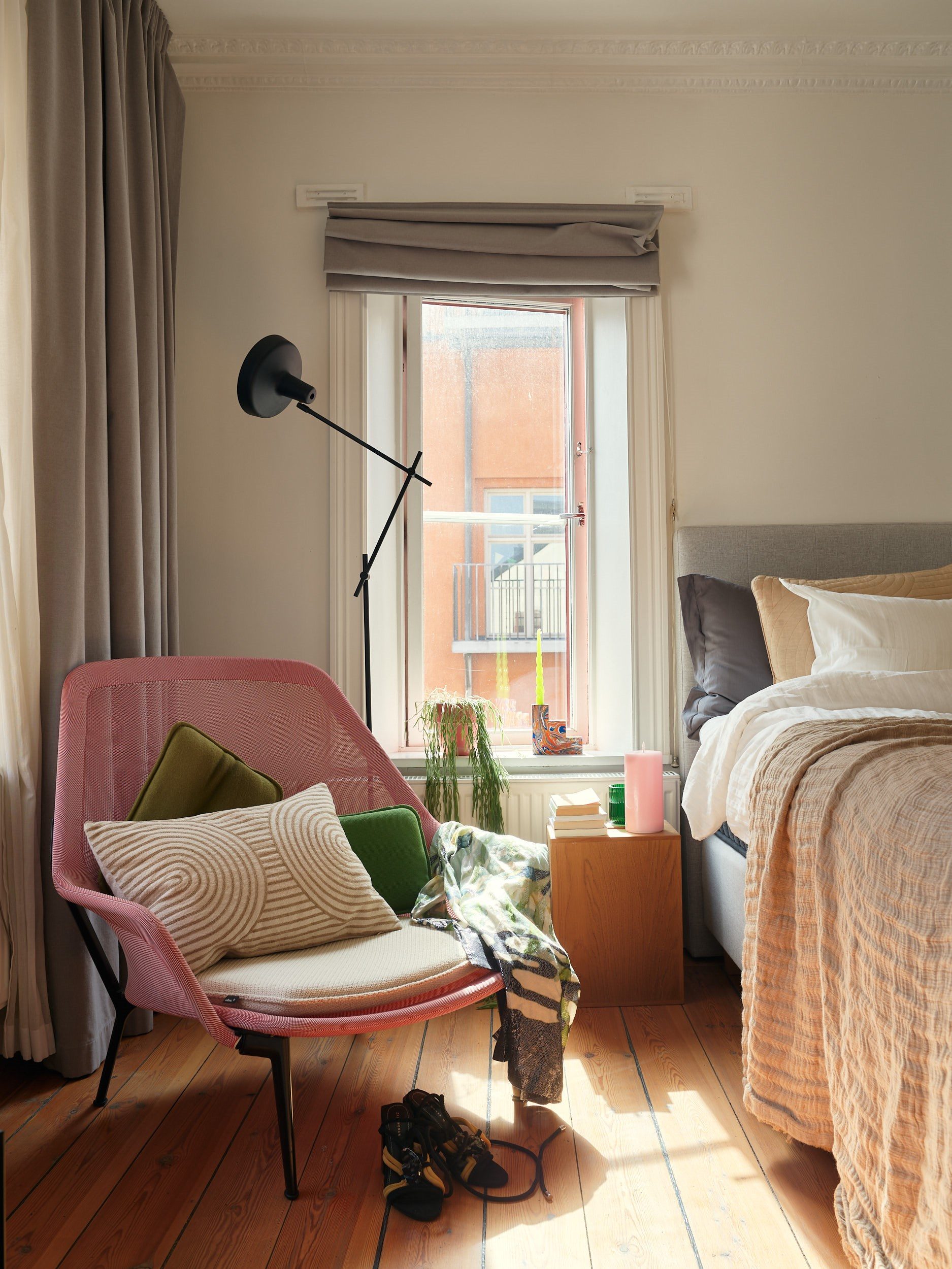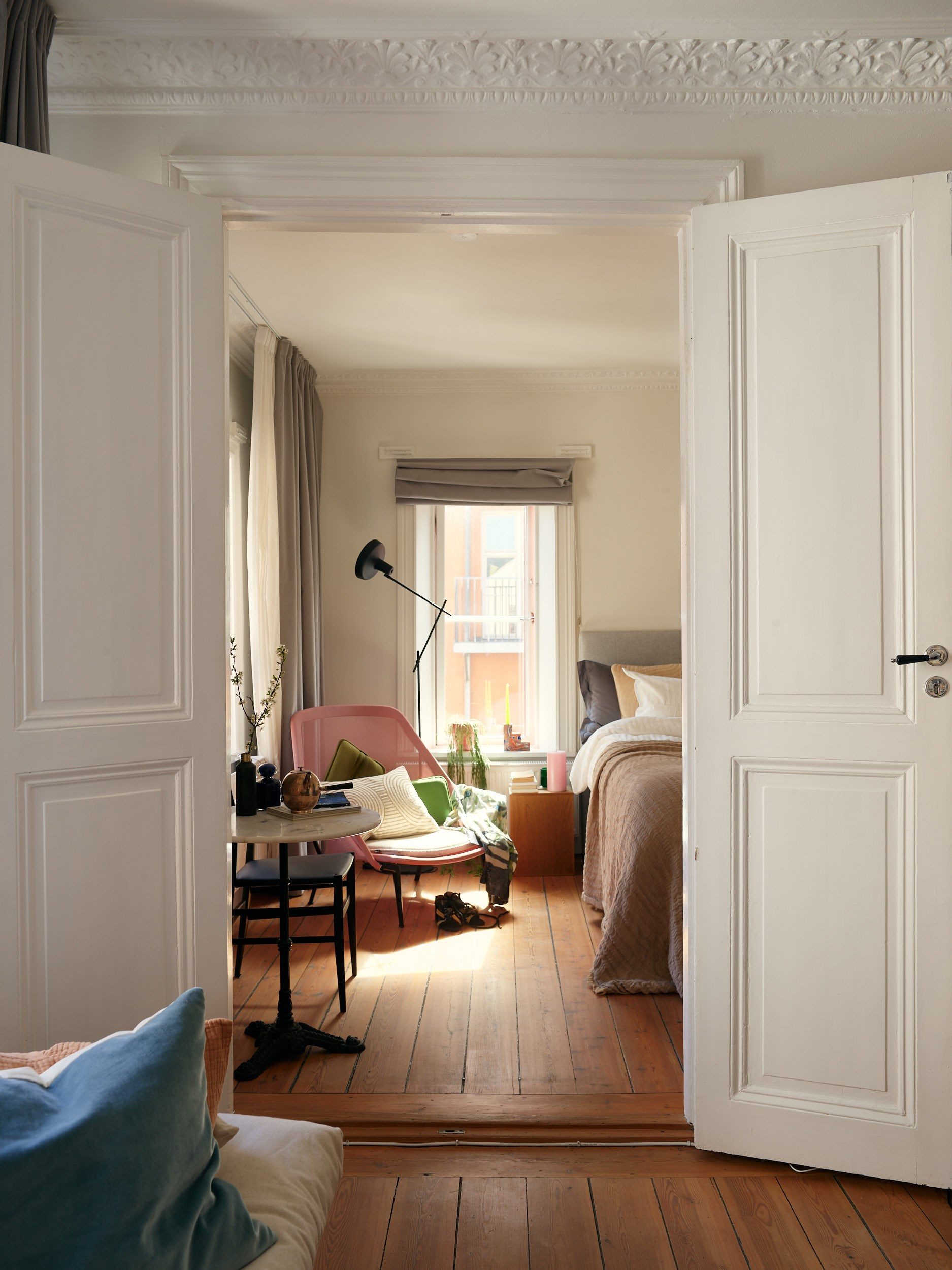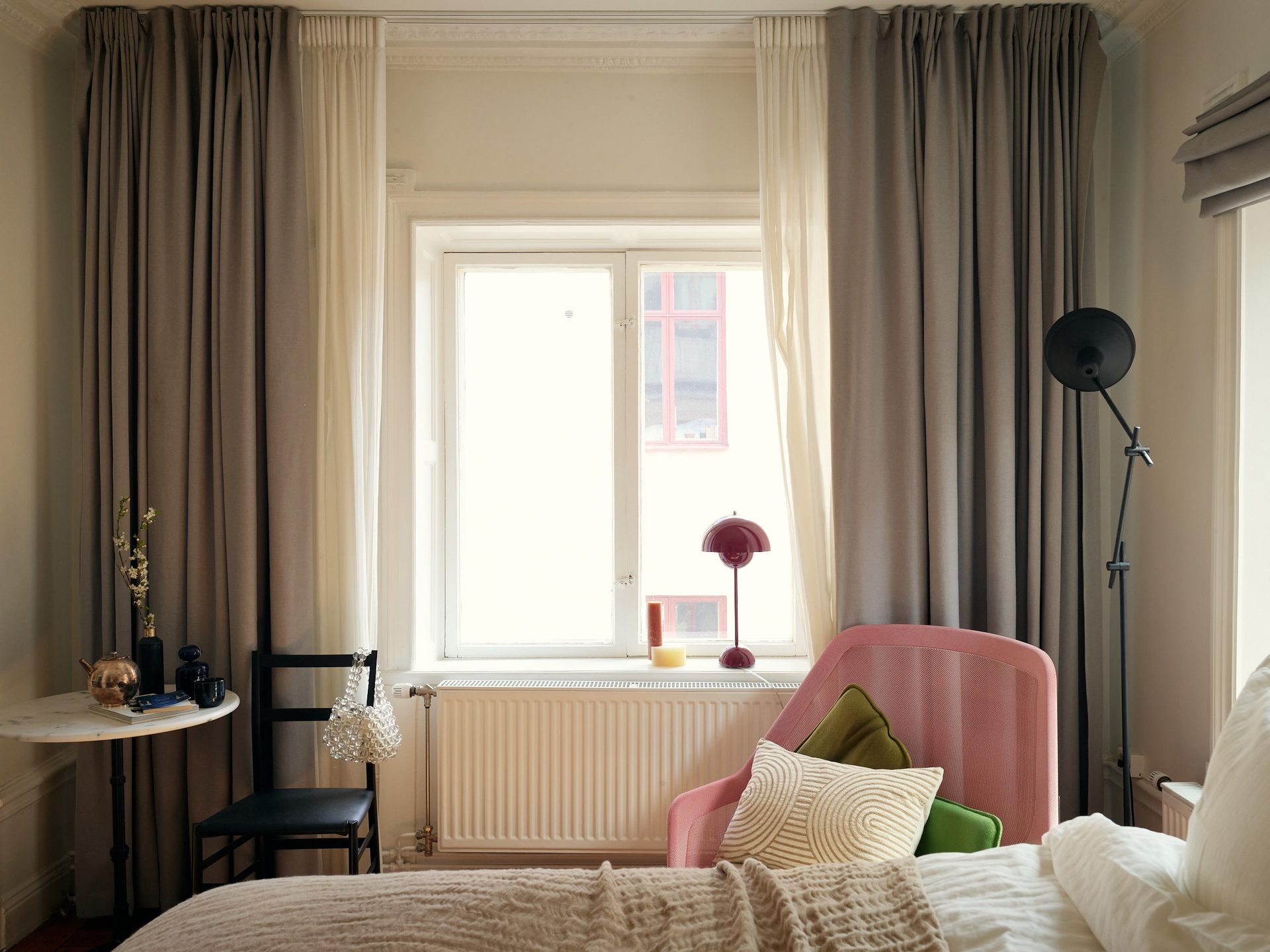 Sovrummet är ett mysigt hörnrum med ljusinsläpp från fönster i både öster och norr. Här ryms en dubbelsäng med nattduksbord lätt och ledigt, och tack vare lägenhetens tysta läge sover man gott om natten. Förvaringsmöjligheterna är utöver det vanliga, och bakom rummets platsbyggda skjutdörrsgarderober gömmer sig en klädkammare. Brädgolvet är framtaget och väggarna målade i vitt.