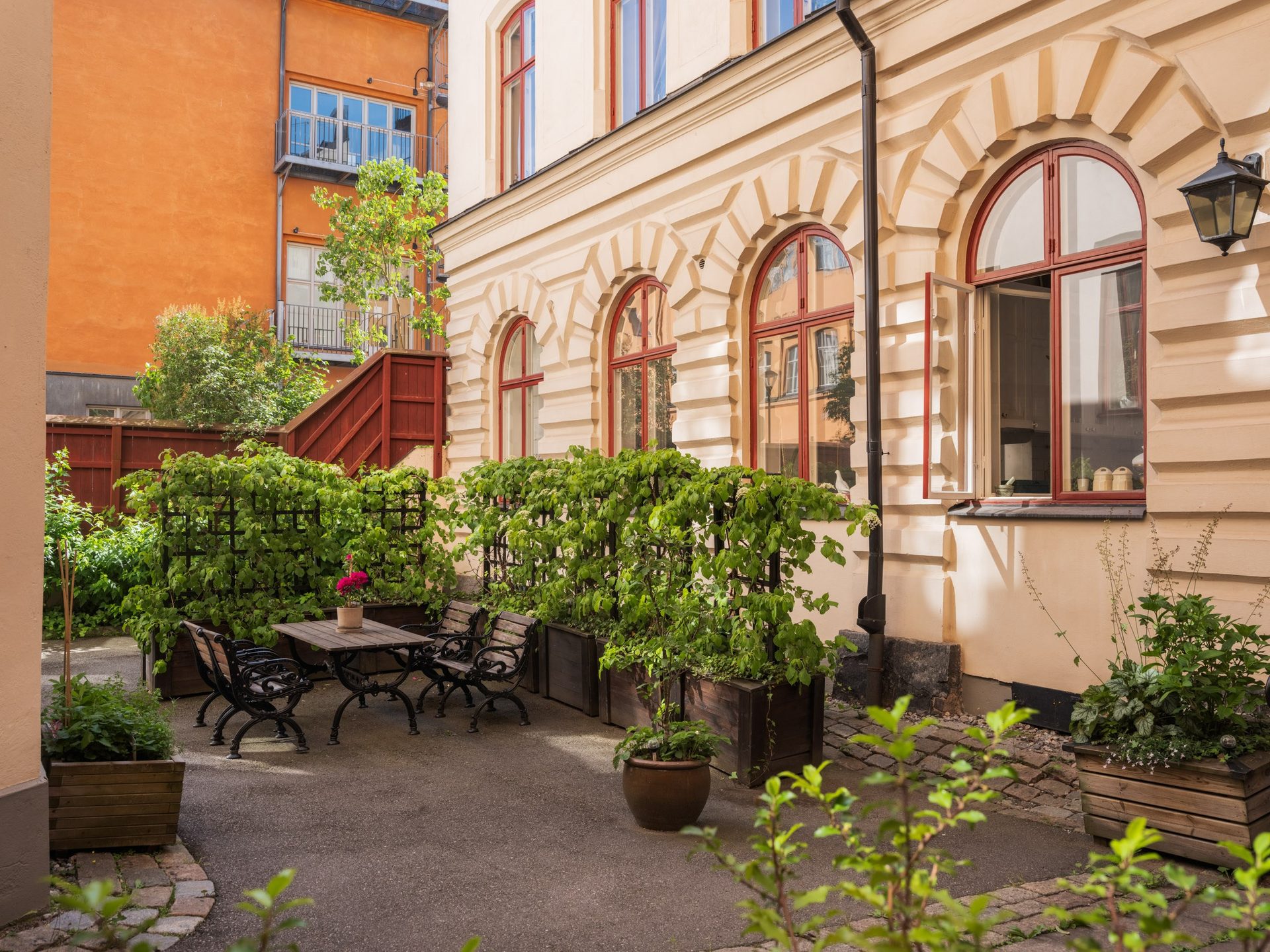 Mellan gatu- och gårdshus finns en stenbelagd innergård med utemöbler och planteringar. Föreningen har även en gemensam tvättstuga, cykelförråd och källarförråd.