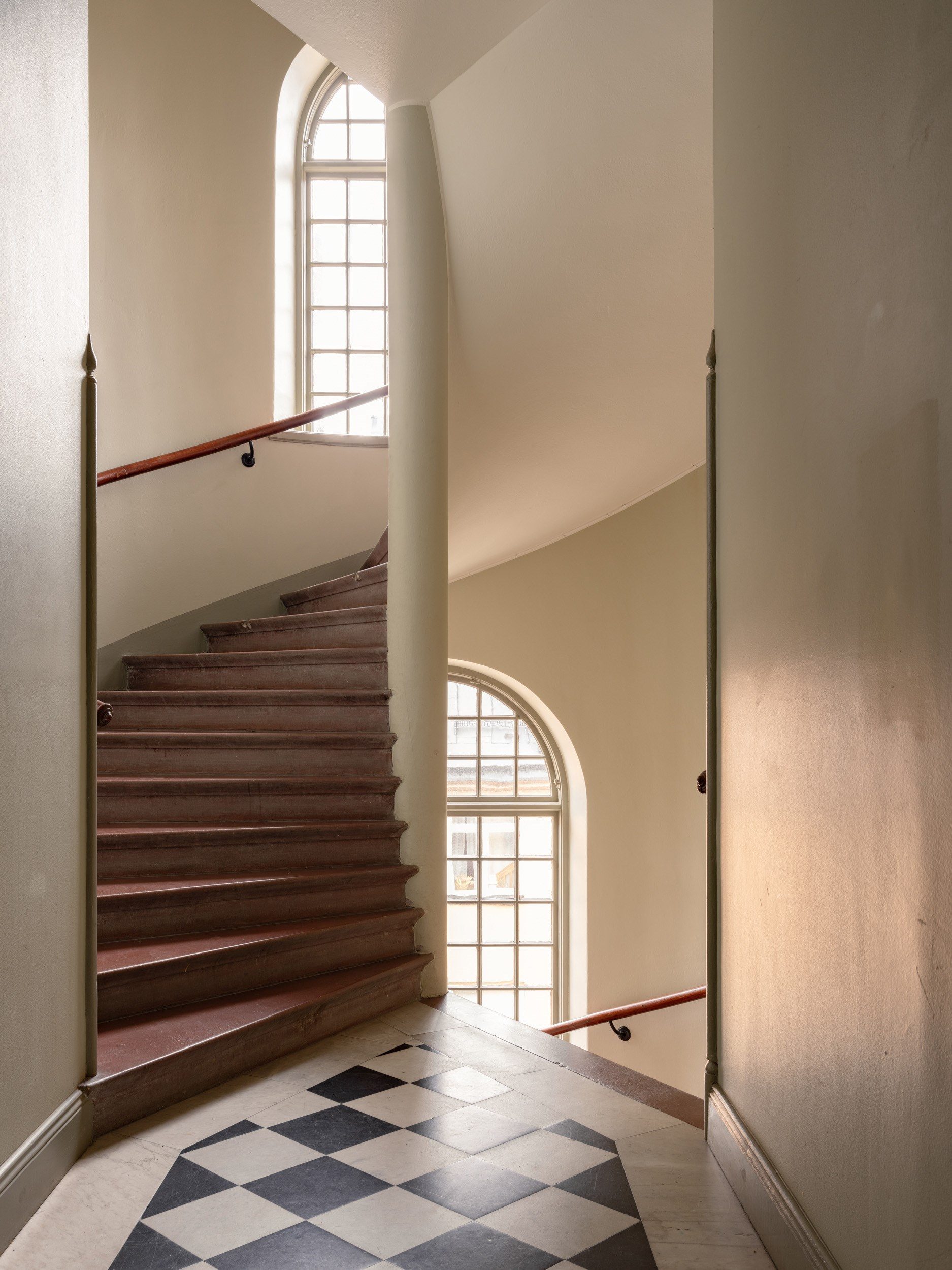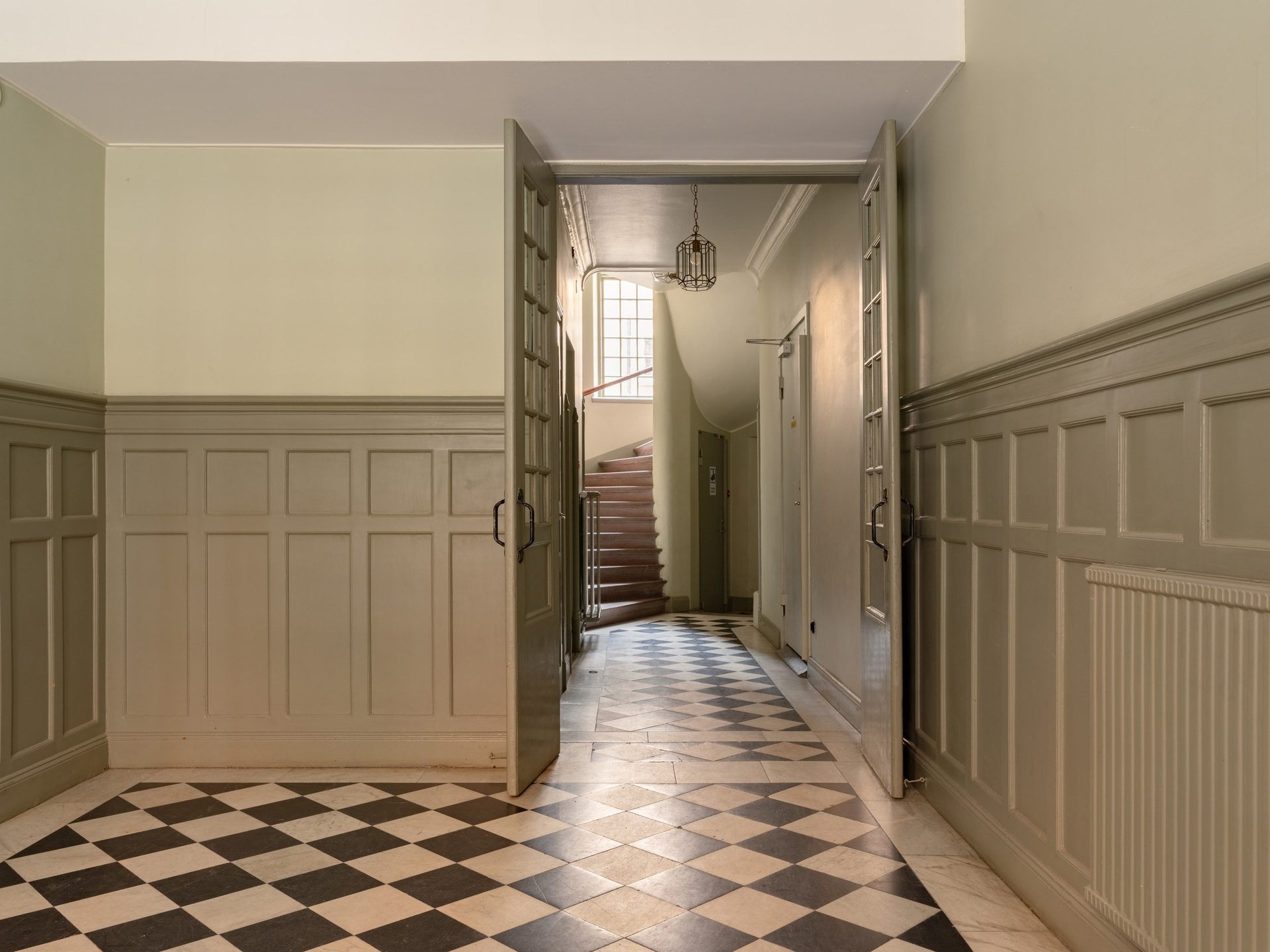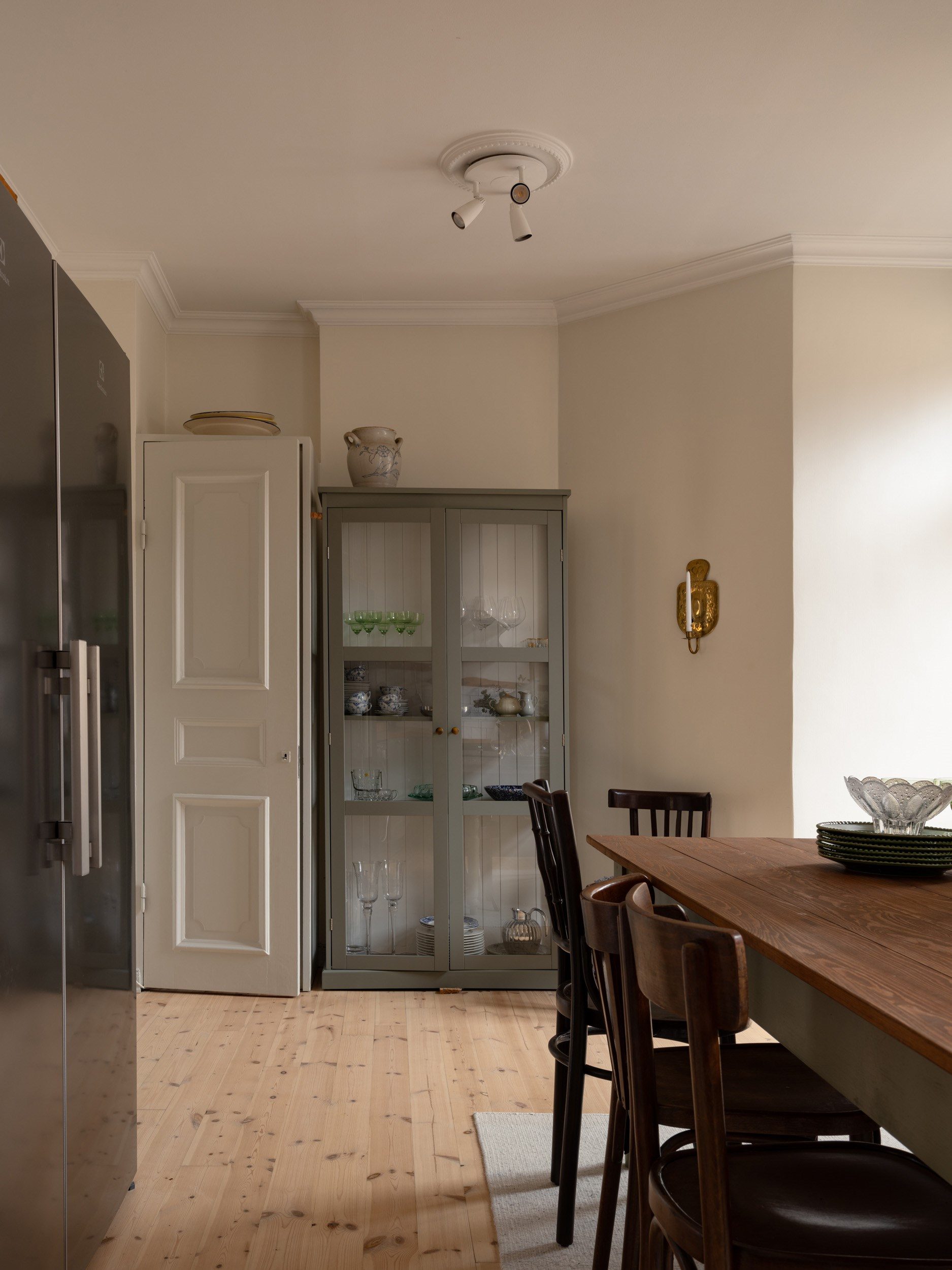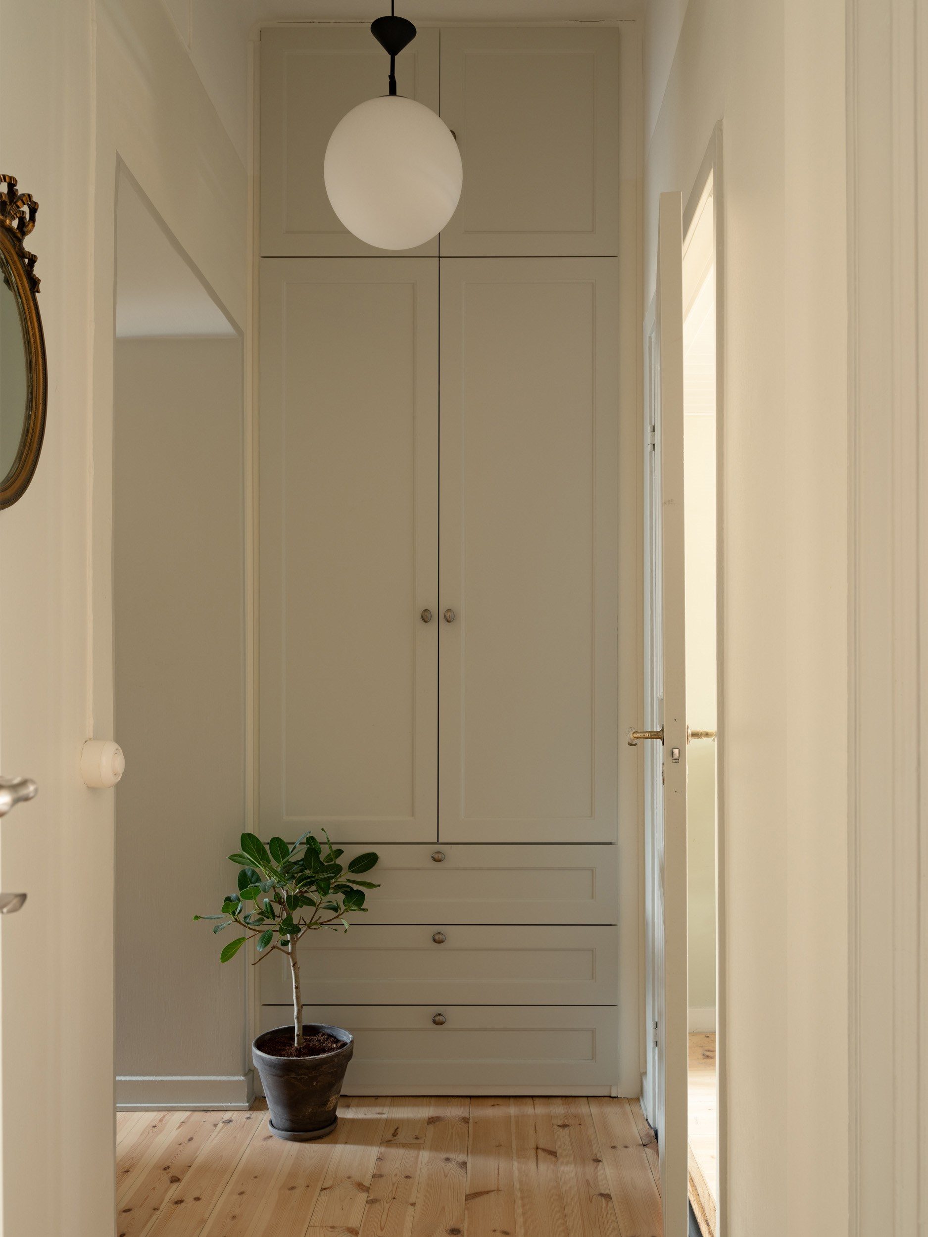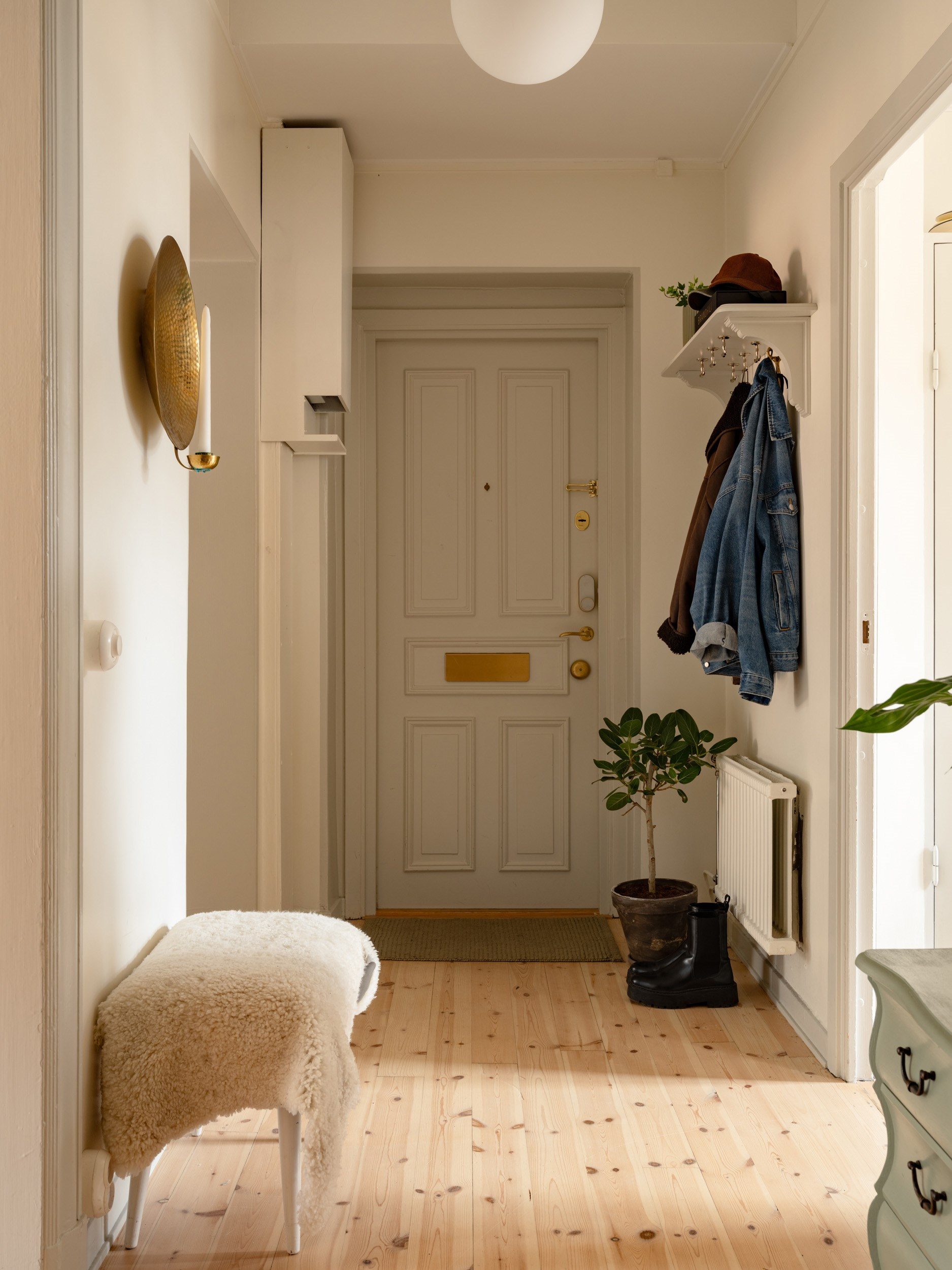 Direkt innanför ytterdörren möter en harmonisk och mjuk känsla. I hallen finns en hatthylla i sekelskiftesstil för ytterkläderna plus inbyggda garderober lite längre in för ytterligare förvaring. Väggarna är vitmålade och snickerierna är målade i en ljust grå nyans som sedan följer genom bostaden.