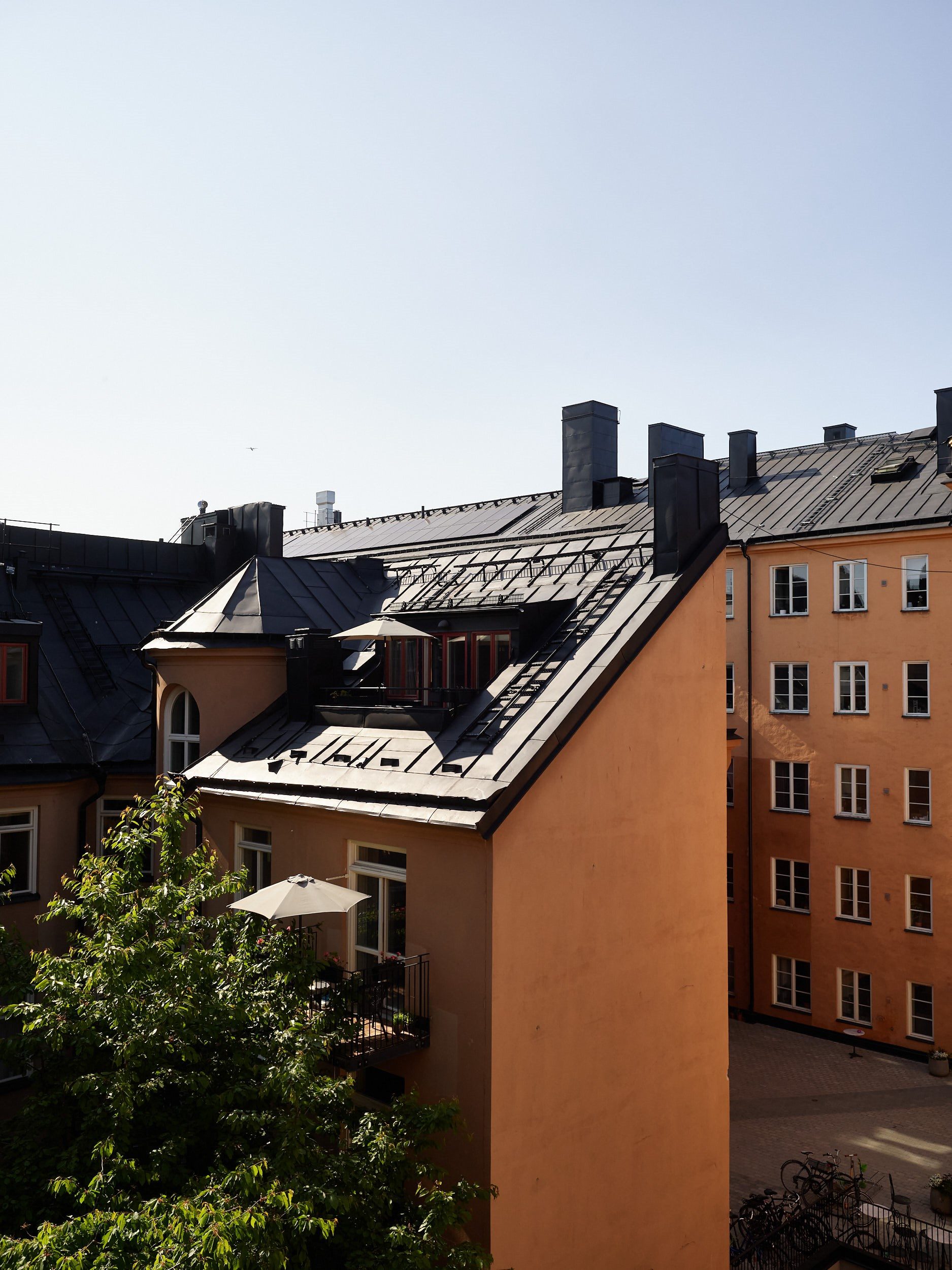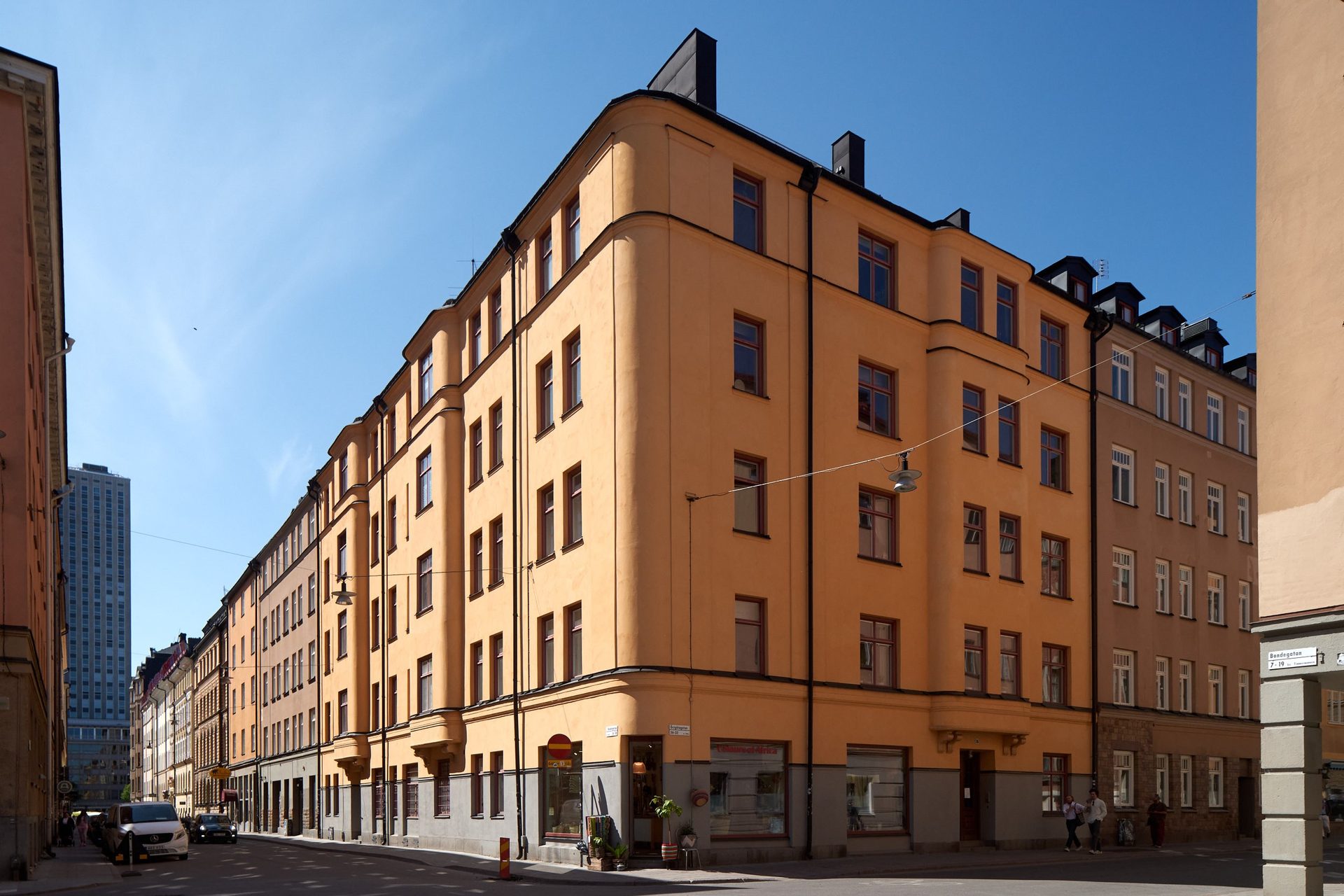 Uppe på fjärde våningen, högst upp i huset bor man med ett lugnt och avskilt läge mitt i de myllrande SoFo-kvarteren. Planlösningen är genomgående i nord-sydlig riktning, med utsikt mot takåsarna mot både gård och gata. Lägenheten är genomgående renoverad under de senaste åren. Kök och badrum/toalett helrenoverades i samband med stambyte 2021. Väggar och snickerier har målats/tapetserats och golven slipats och lackats med naturlack.