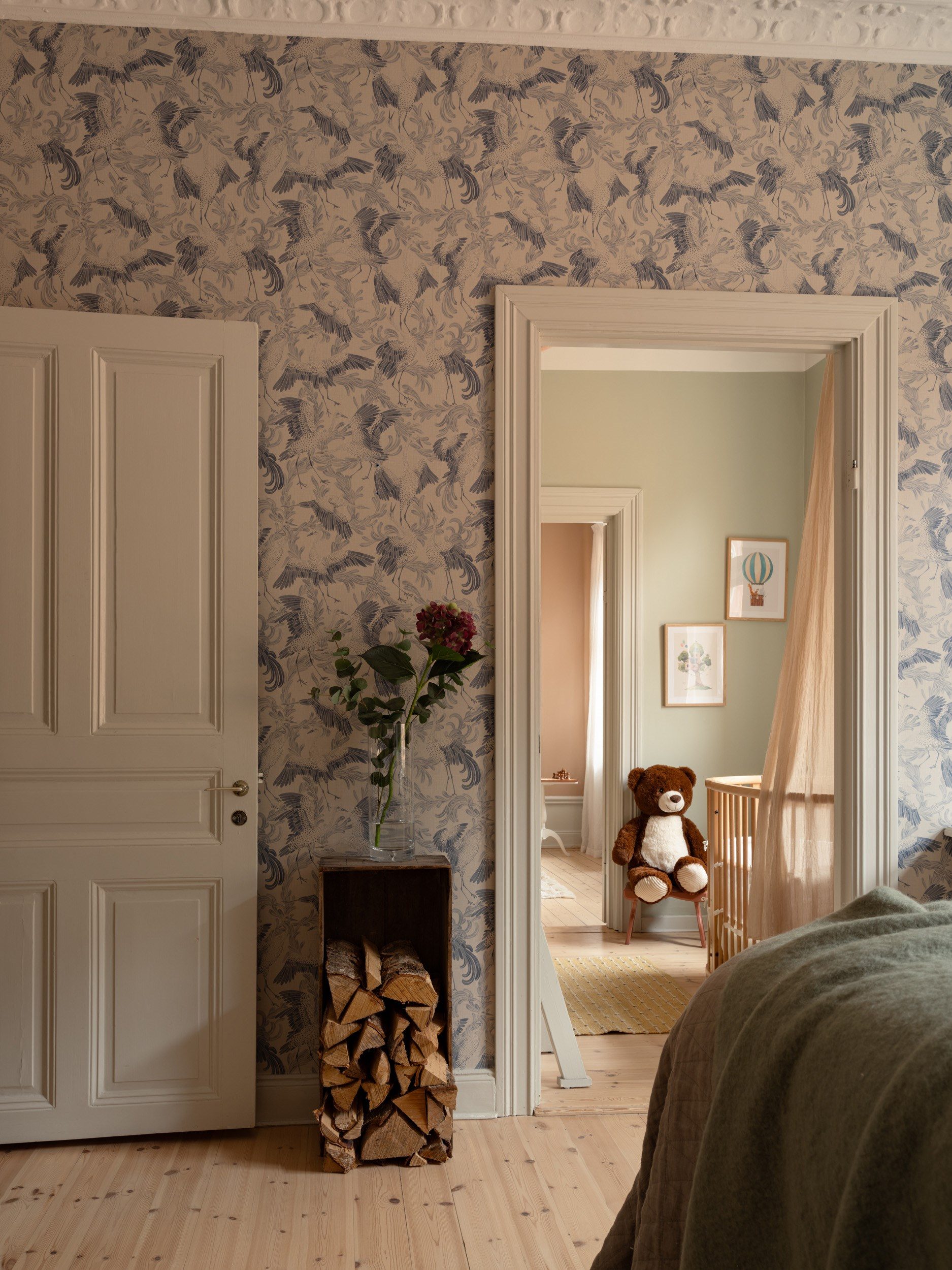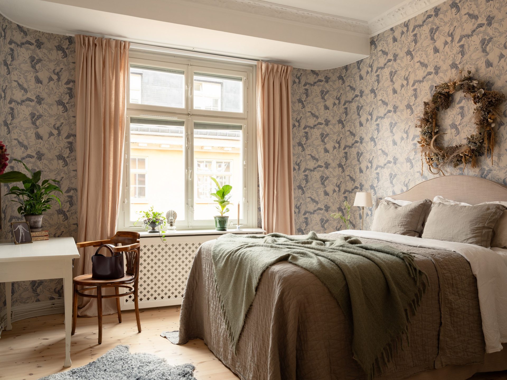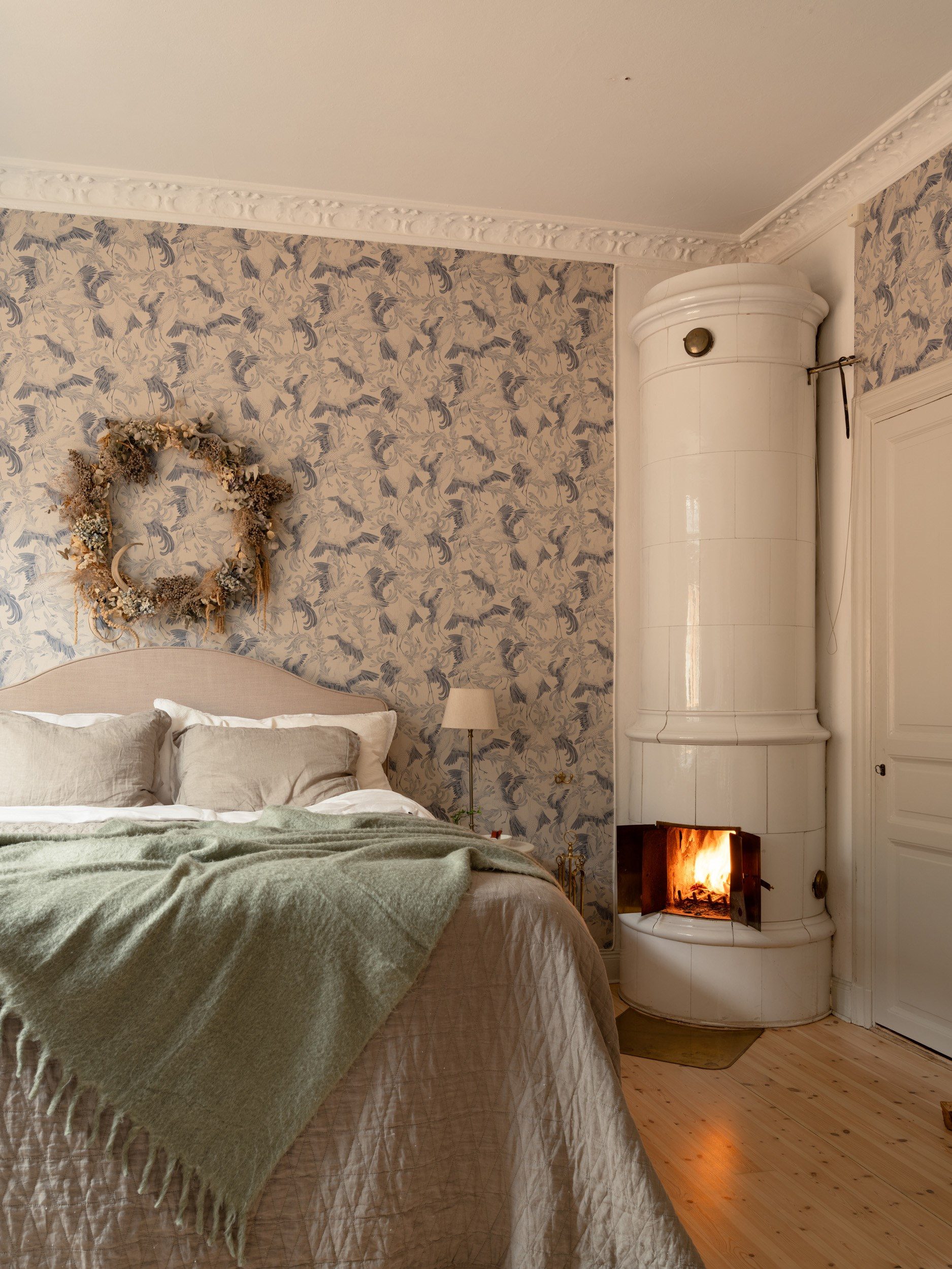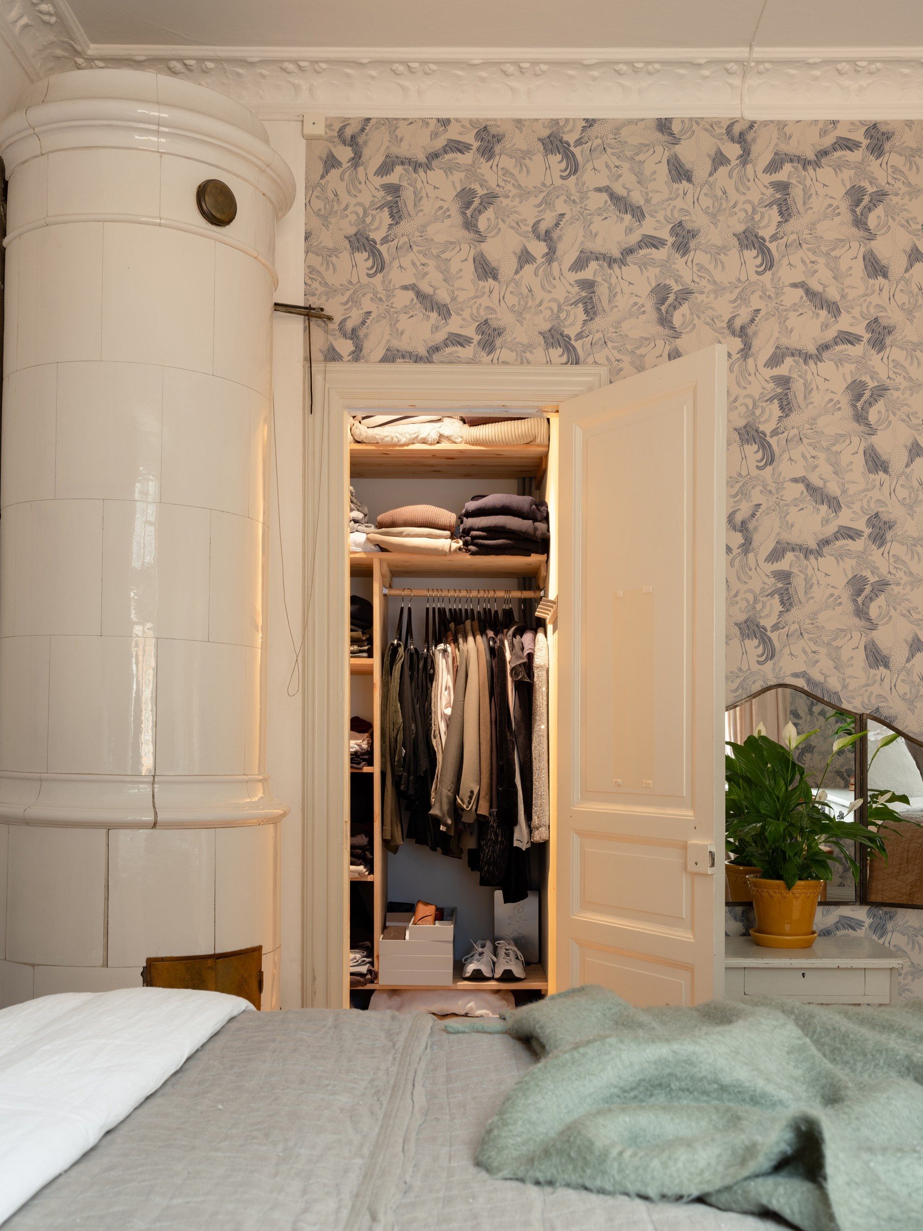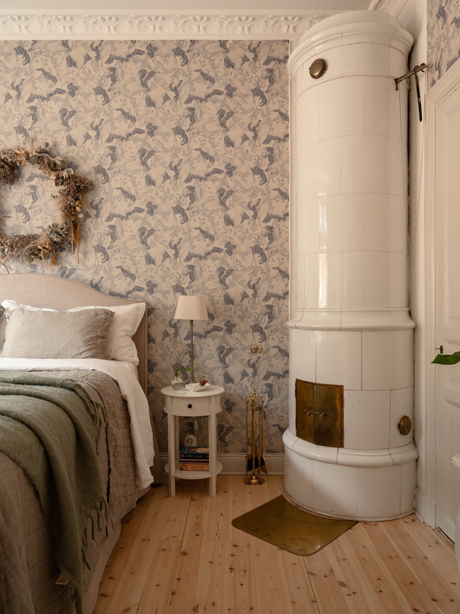 Det större sovrummet är placerat i ett av husets burspråk, vilket ger väggen runt fönstret fin rundning. Väggarna är tapetserade i Emma von Brömssens mönster ”Dancing cranes” i vilsamt blå toner. En stor klädkammare med inbyggda hyllor och klädstång ger ordentligt med förvaring. Stuckatur, takrosett och kakelugn minner om huset byggår. Kakelugnen renoverades 2022 och är godkänd för eldning. Här är det mysigt att under kalla helgmorgnar tända en brasa och avnjuta en längre morgon under täcket.