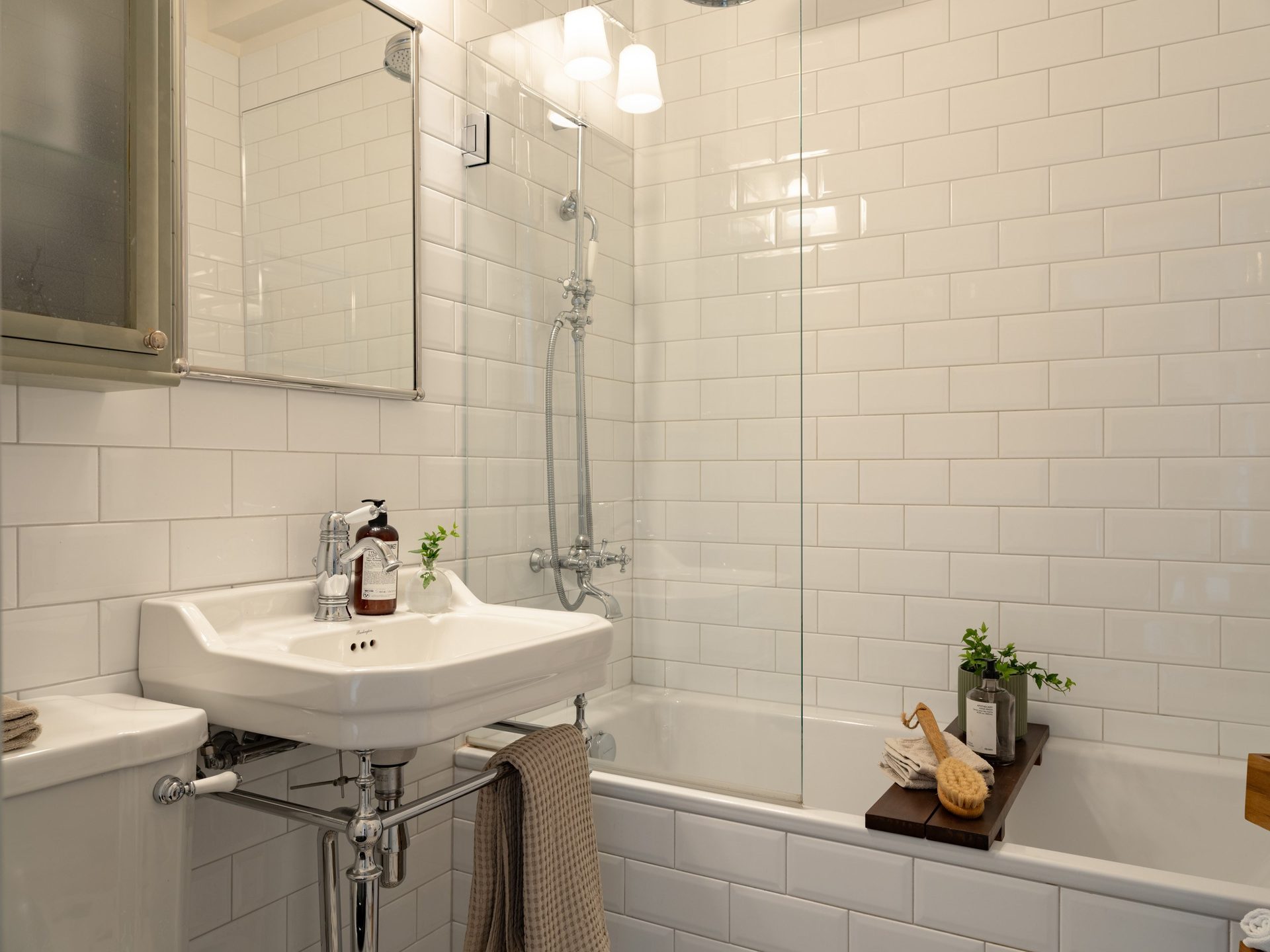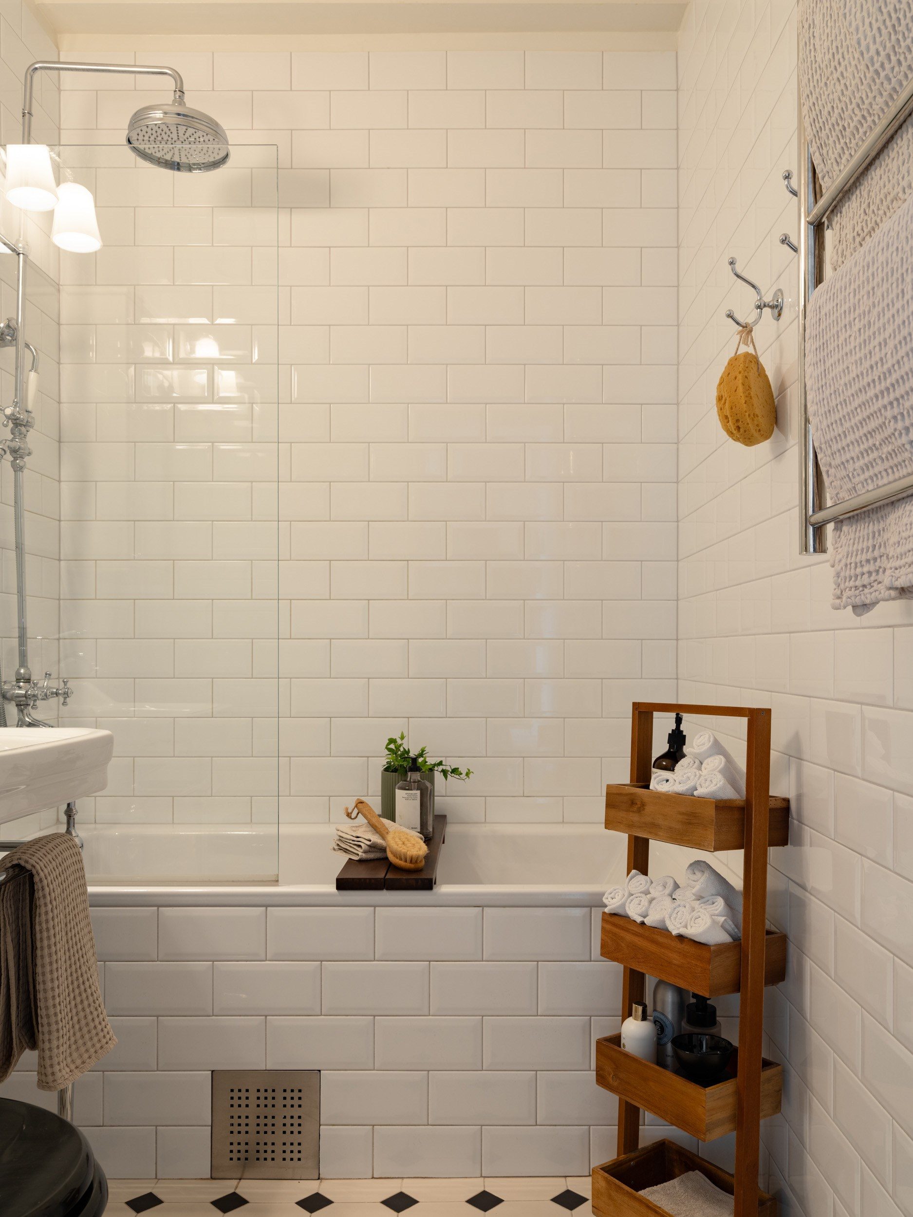 Badrummet har inspirerats stilmässigt av husets tillkomsttid, även om man vid denna tid inte hade den lyx vi idag ser. Golvet, med värmeslingor, pryds av ett svartvitt oktagonkakel från Winckelmans och väggarna av ett vitt metrokakel i tegelsättning. Badkaret är inkaklat och har en takdusch, wc och handfat har en sekelskiftestwist och förvaring finns i ett grönt linoljemålat badrumsskåp.