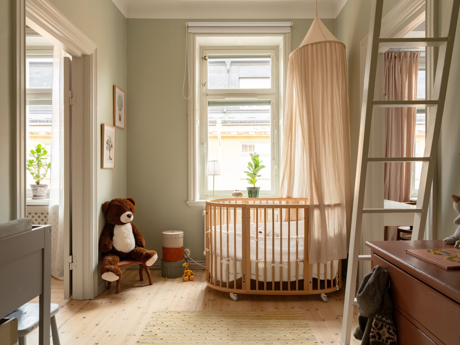 I det mindre sovrummet är väggarna grönmålade och ett sovloft med plats för 120-madrass gör det till ett utmärkt barn- eller gästrum. Den som vill kan också nyttja rummet som kontor, med ett skrivbord placerat framför fönstret.
