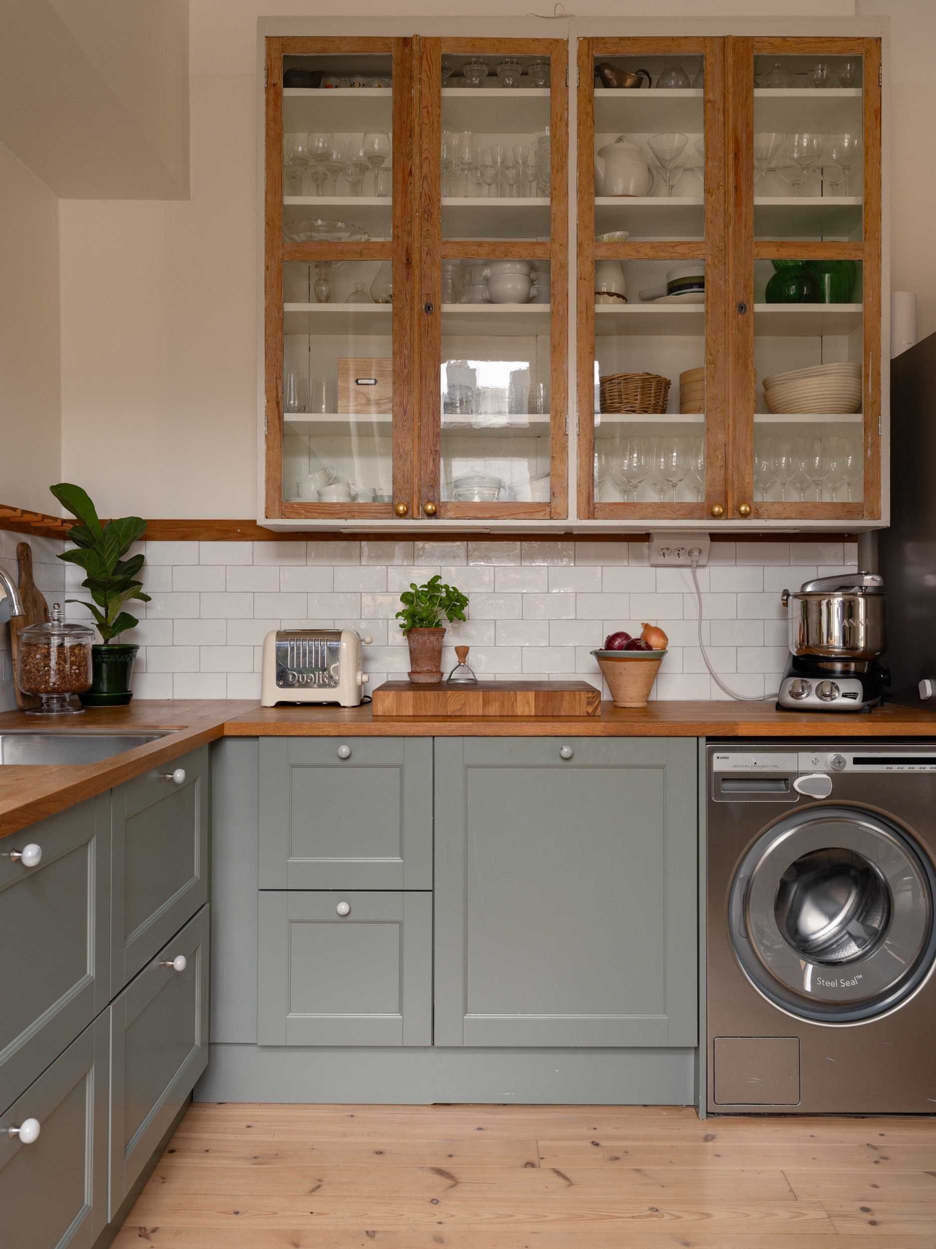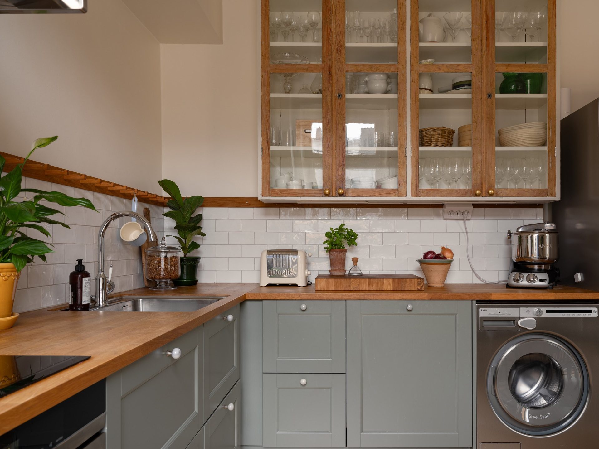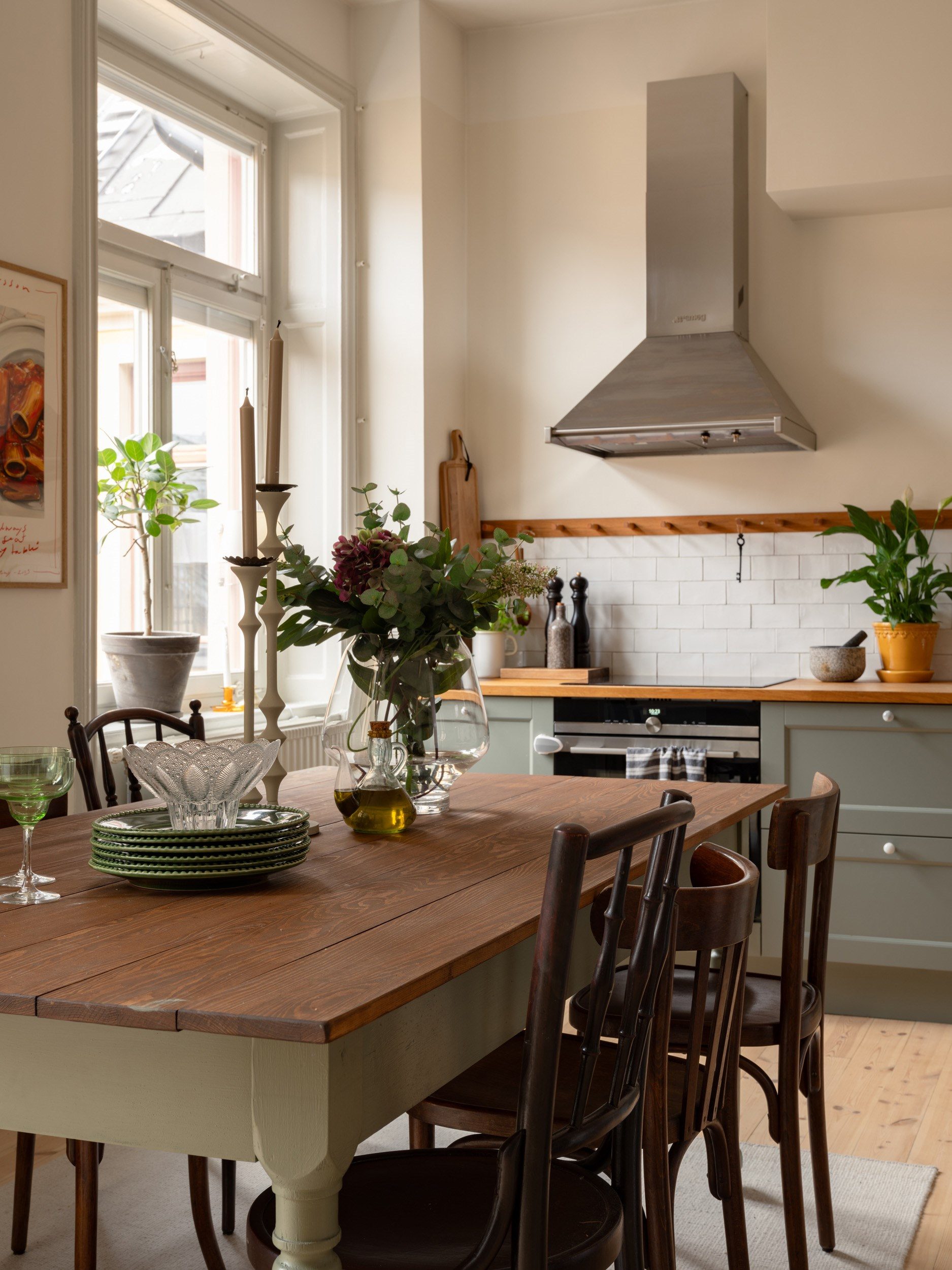 In till vänster från hallen ligger hemmets hjärta, ett stort och hemtrevligt kök med plats för rejält matbord. Utgången till den anslutande balkongen med kvällssol förlänger rummet och ger det en extra dimension. Köket är som gjort för att laga mat och umgås i. Maten förbereds på en bänkskiva av massiv ek som möts upp av vitt hamrat kakel med en knopplist överst, som matchar bänkskivan. Underskåpen är lantligt skogsgröna, från Marbodal, och överskåpen är äldre vitrinskåp med munblåst glas. Den maskinella utrustningen går i rostfritt; induktionshäll, varmluftsugn/mikro (Siemens), kolfilterfläkt (Smeg), diskmaskin (Bosch) och fullstor kyl och frys side-by.side (Electrolux). Det finns även en tvättmaskin i köket (Asko), installerad efter konstens alla regler.