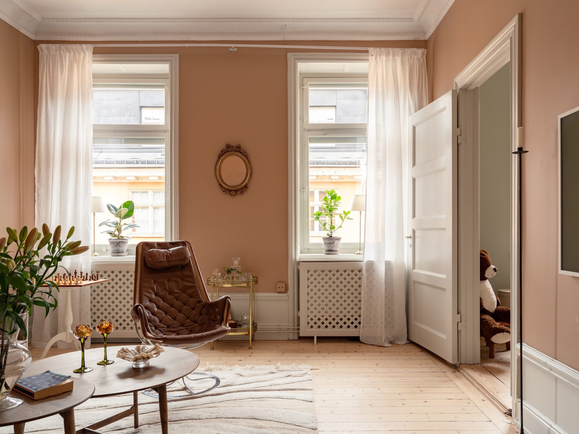 Tack vare att köket rymmer ett stort matbord får vardagsrummet vara ett rum med soffa, fåtöljer och tv. Det är också ett rum fullt av fina originaldetaljer, som stuckatur, takrosett, speglade fönsternischer och fotlister som möter upp det nåtade trägolvet som fått inspirera det som lagts in i övriga rum. De två fönstren i fil går nästan hela vägen upp till tak och ger rejält ljusinsläpp och har tillhörande fina elementskydd.